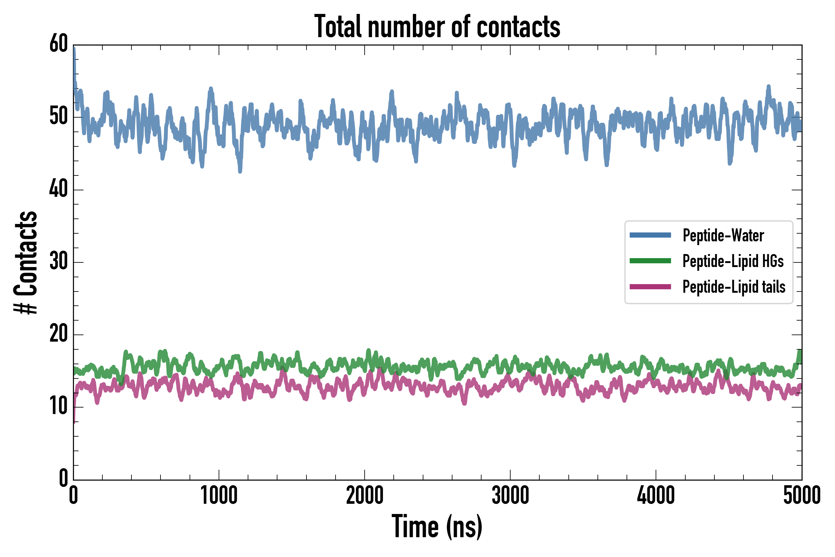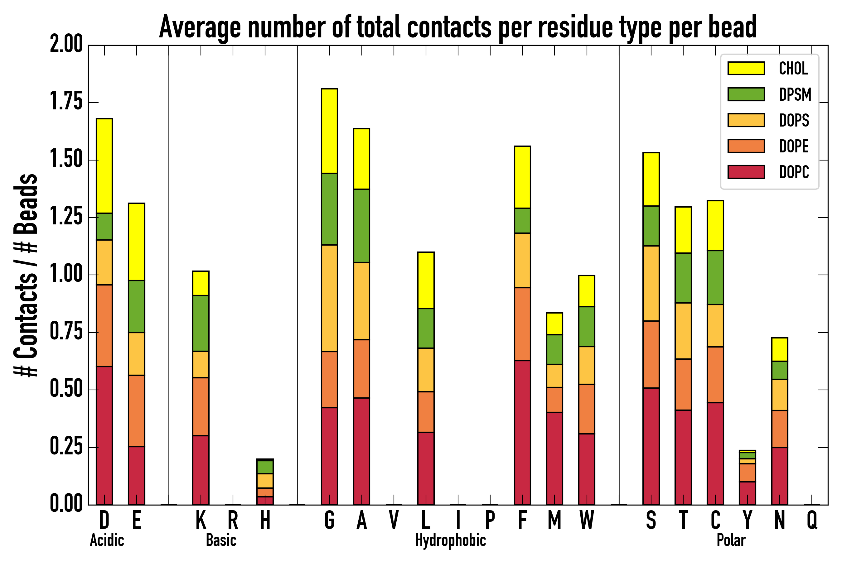 Number of contacts between each residue of the peptide backbone and the different lipid types, averaged over the last microsecond and using a cut-off of 0.6 nm.