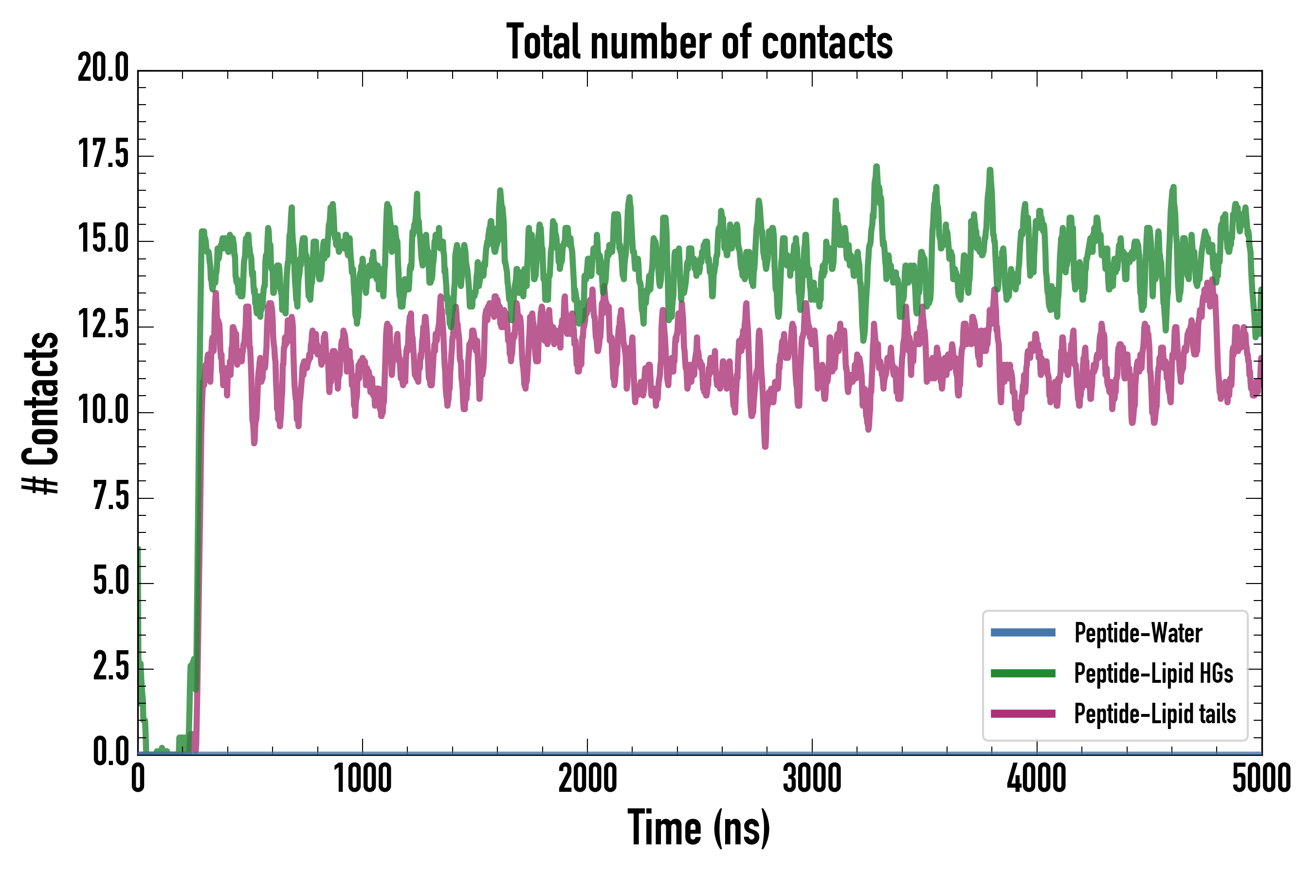 Number of contacts between each residue of the peptide backbone and the different lipid types, averaged over the last microsecond and using a cut-off of 0.6 nm.