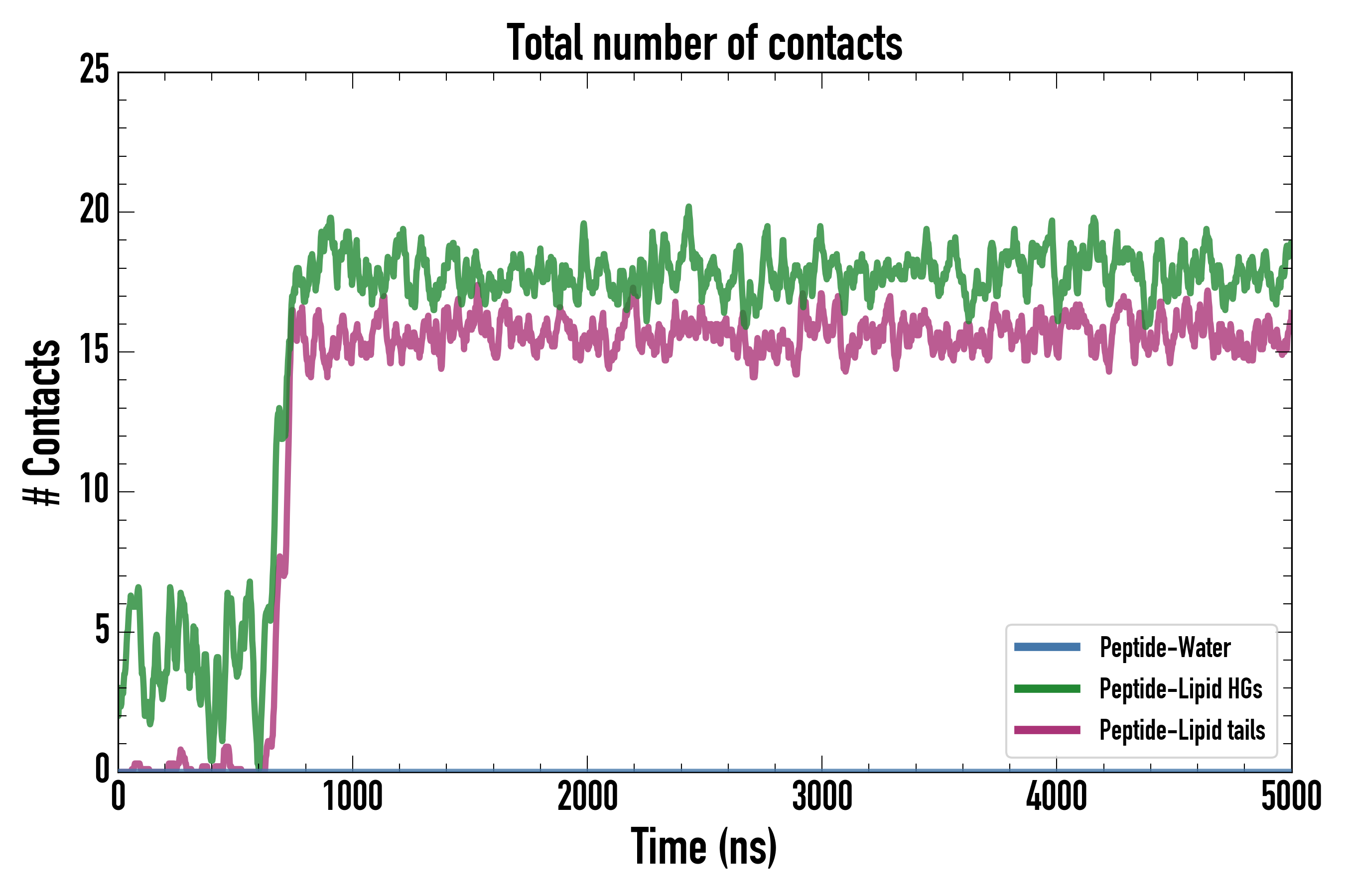 Number of contacts between each residue of the peptide backbone and the different lipid types, averaged over the last microsecond and using a cut-off of 0.6 nm.