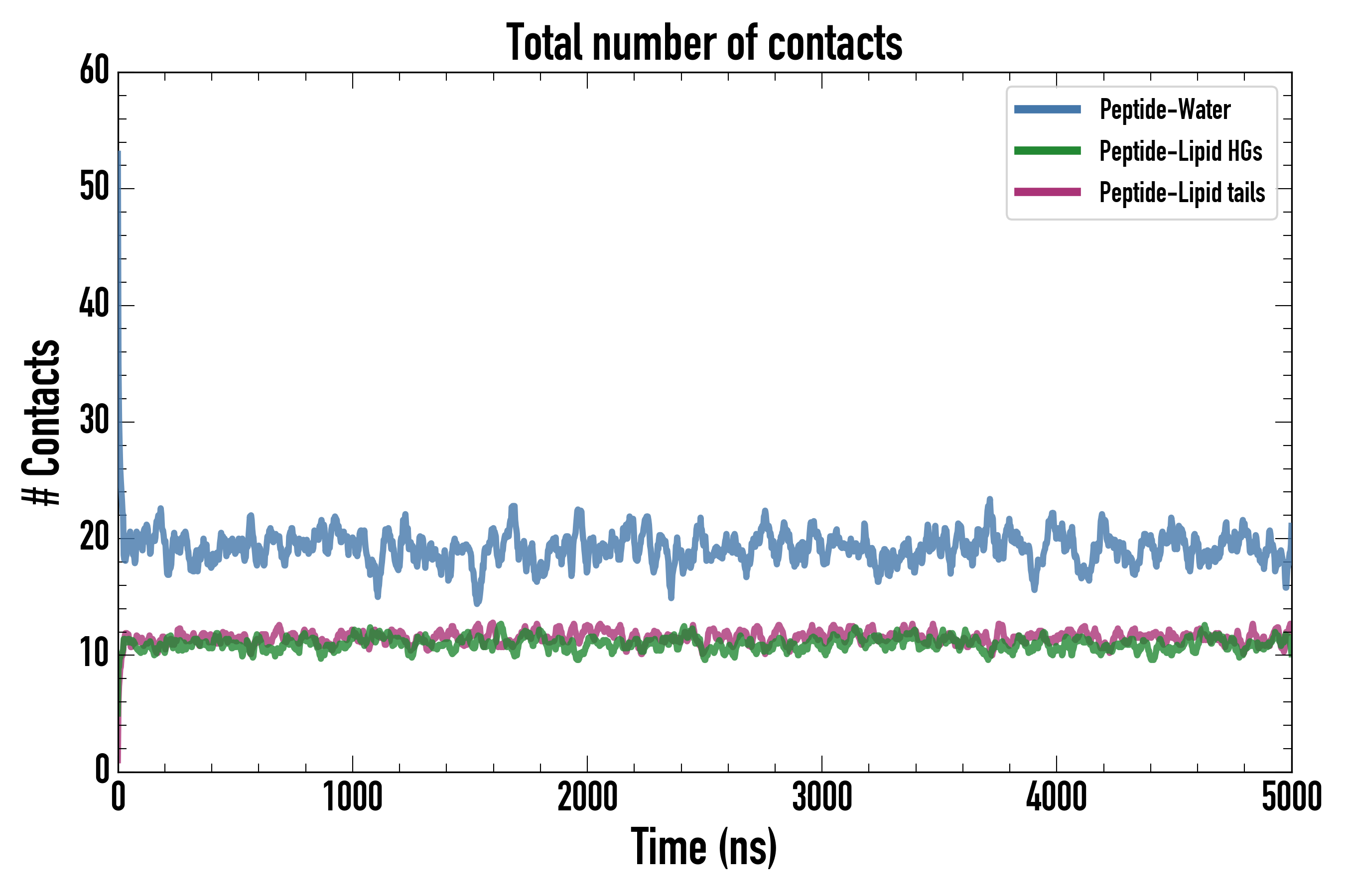 Number of contacts between each residue of the peptide backbone and the different lipid types, averaged over the last microsecond and using a cut-off of 0.6 nm.