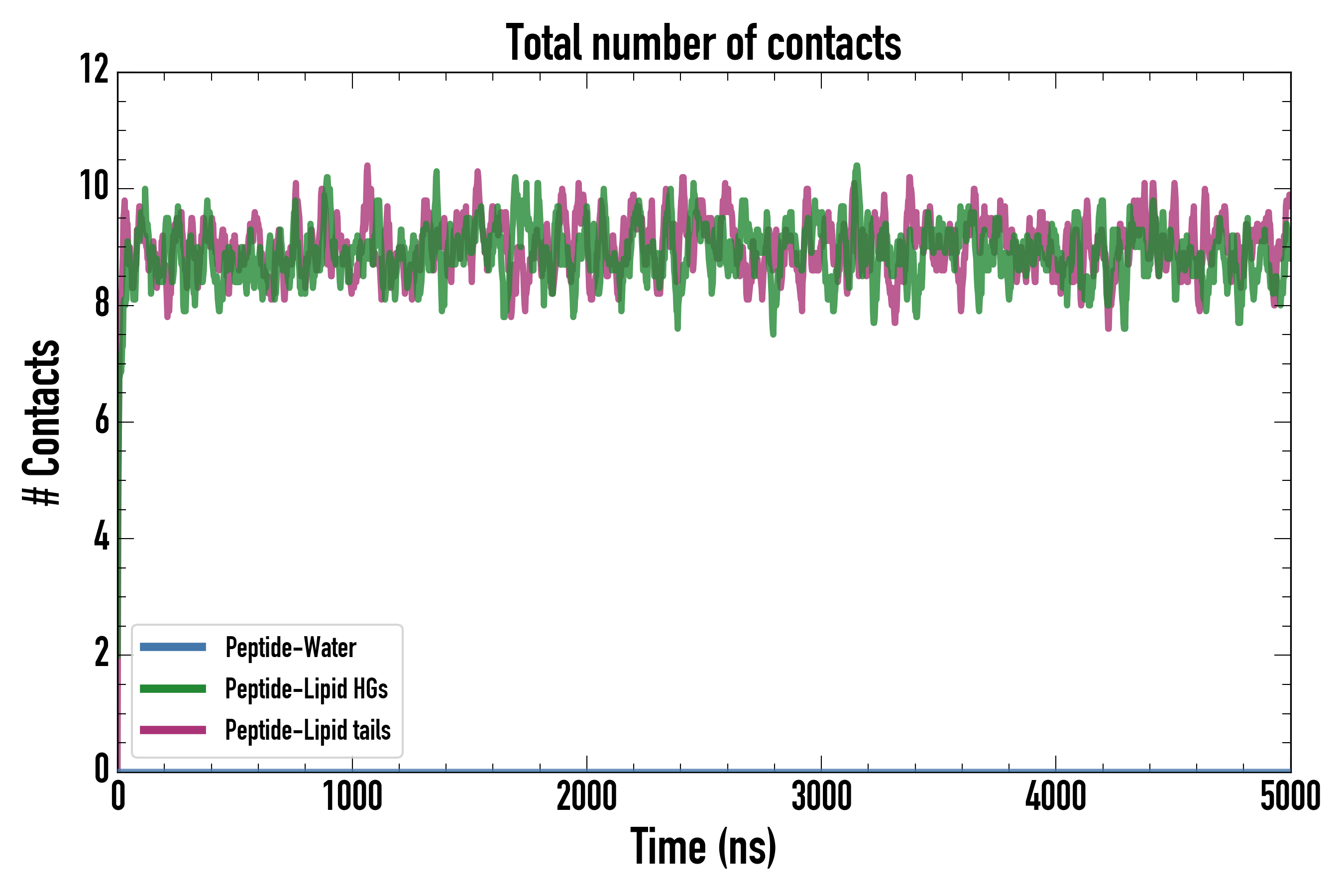 Number of contacts between each residue of the peptide backbone and the different lipid types, averaged over the last microsecond and using a cut-off of 0.6 nm.