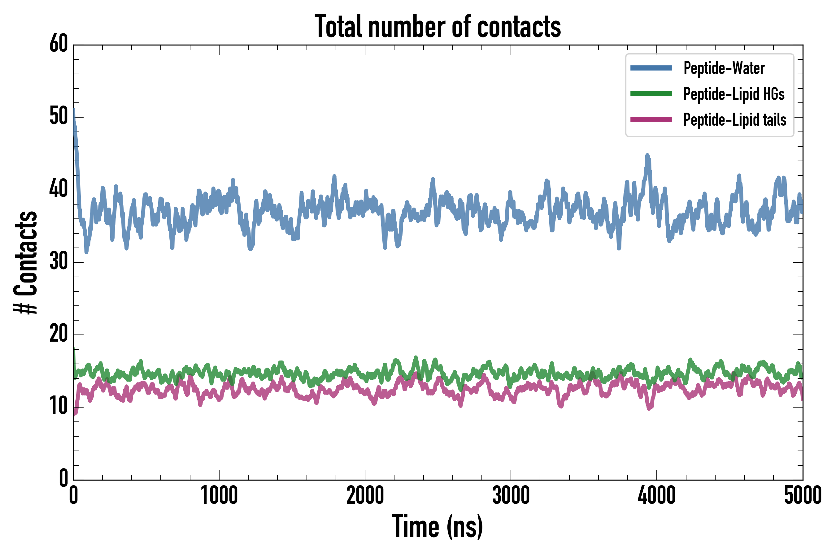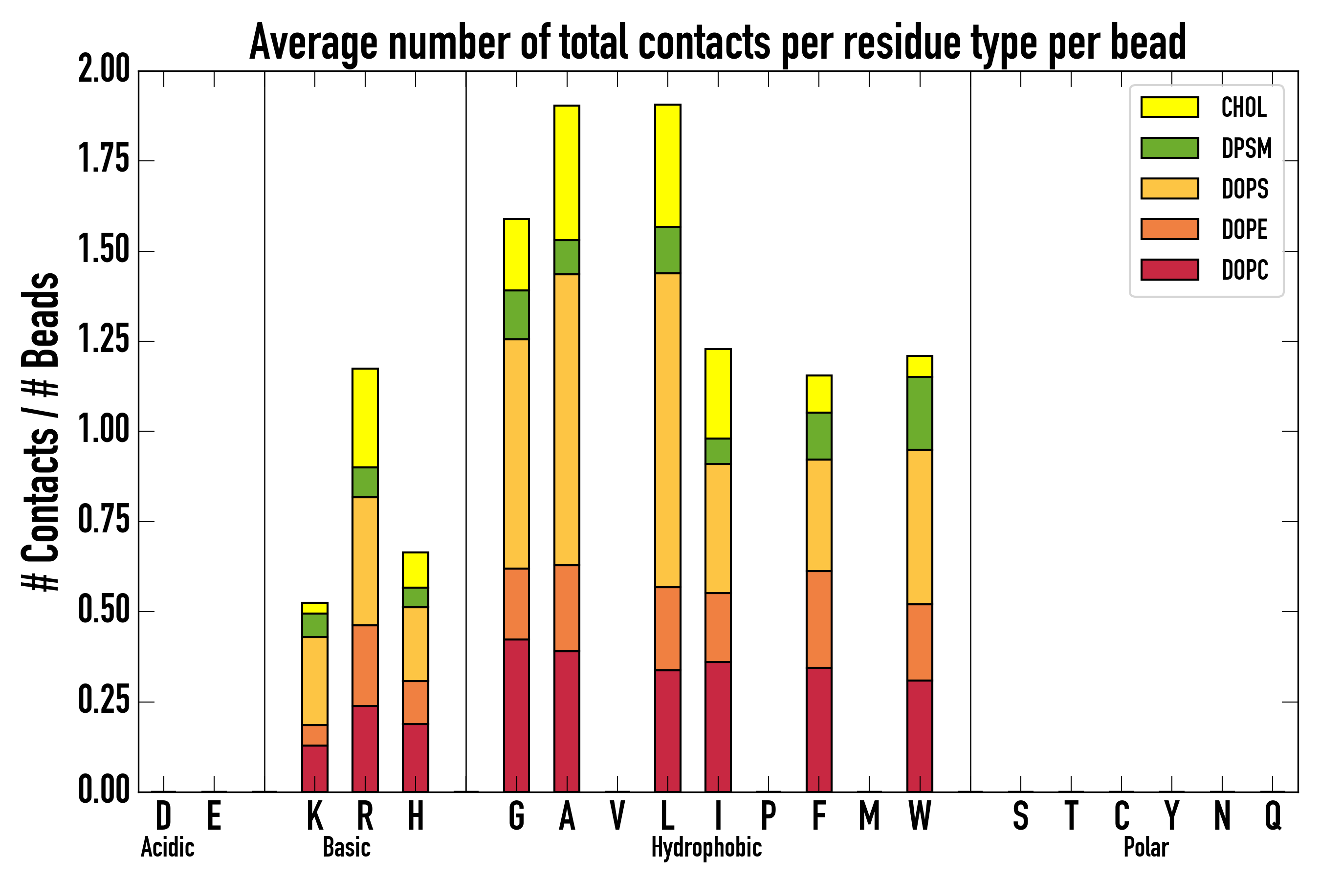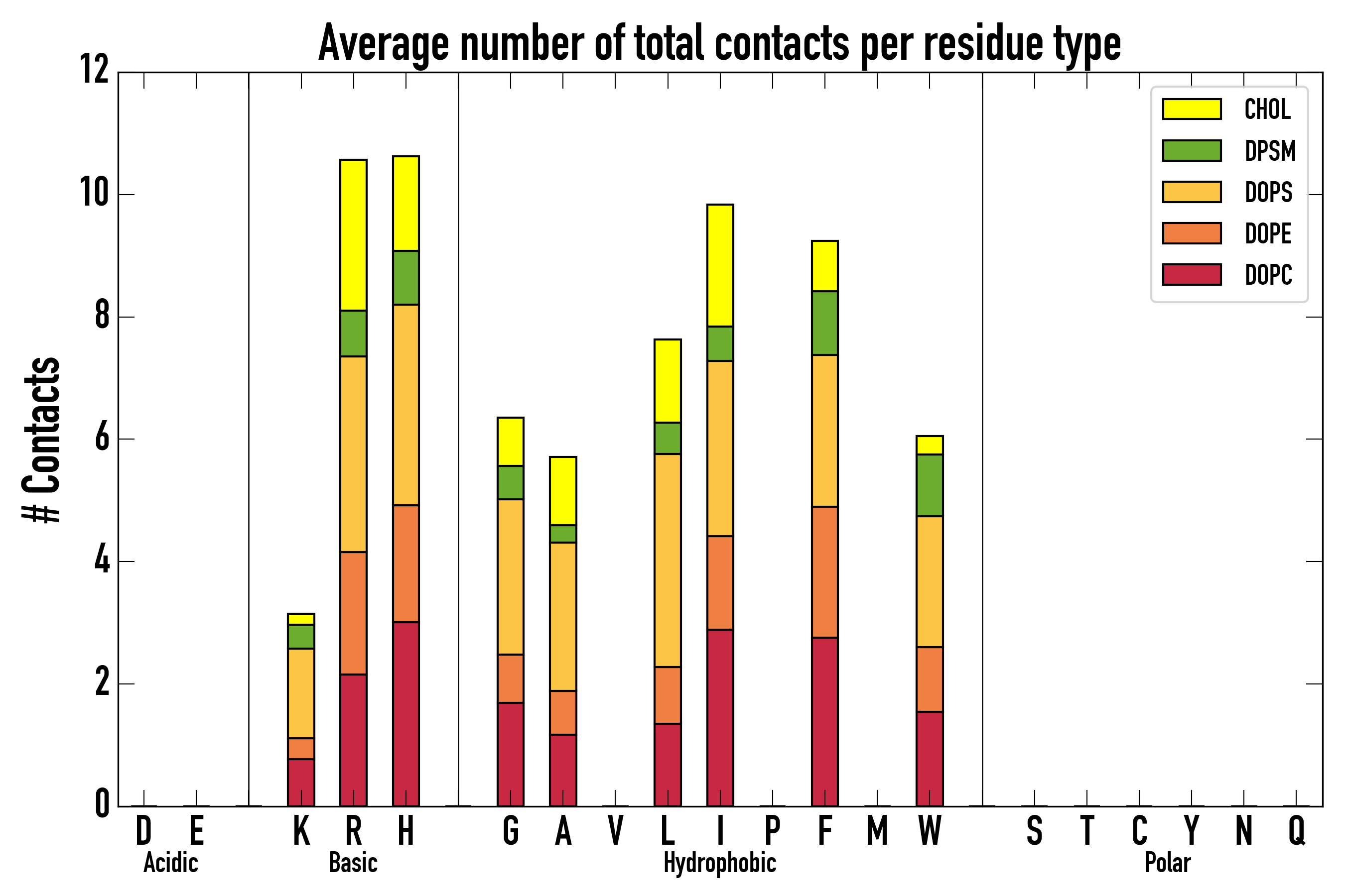 Number of contacts between each residue of the peptide backbone and the different lipid types, averaged over the last microsecond and using a cut-off of 0.6 nm.