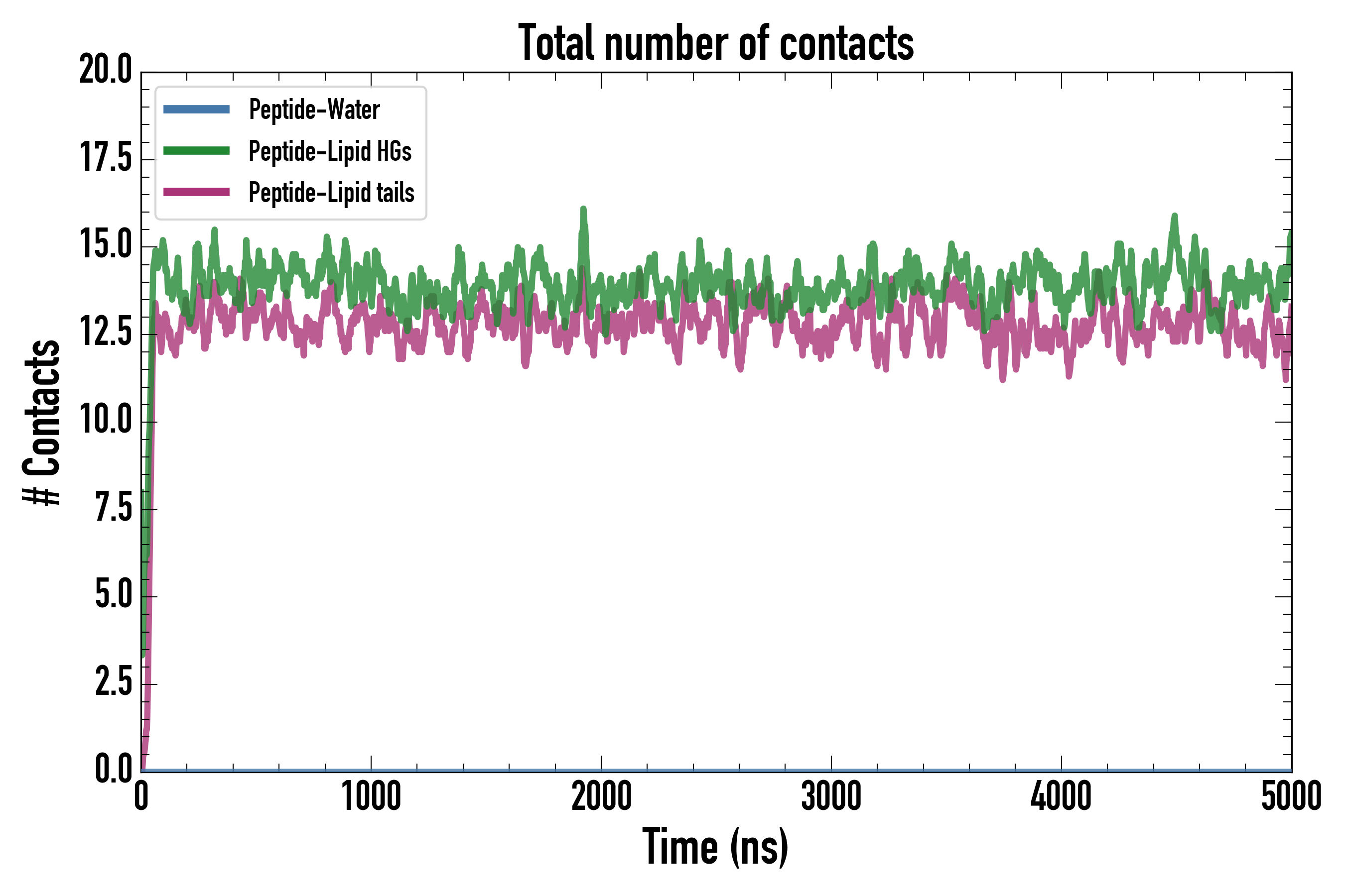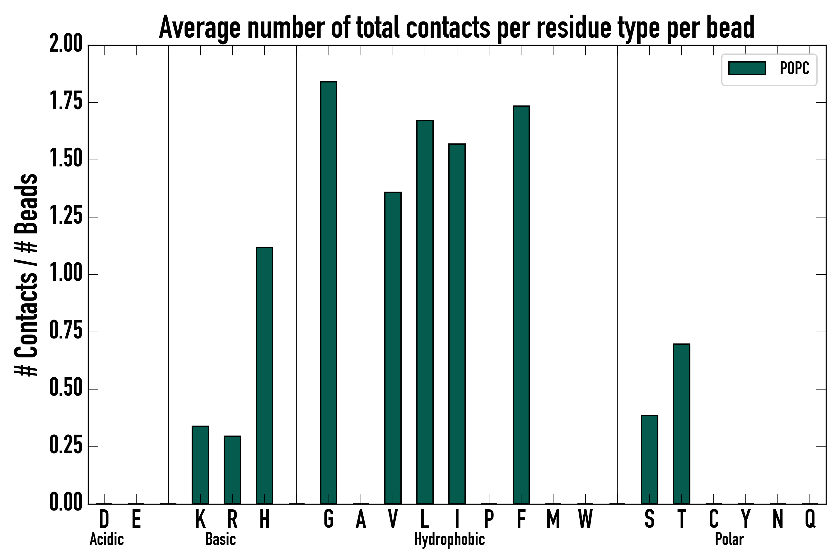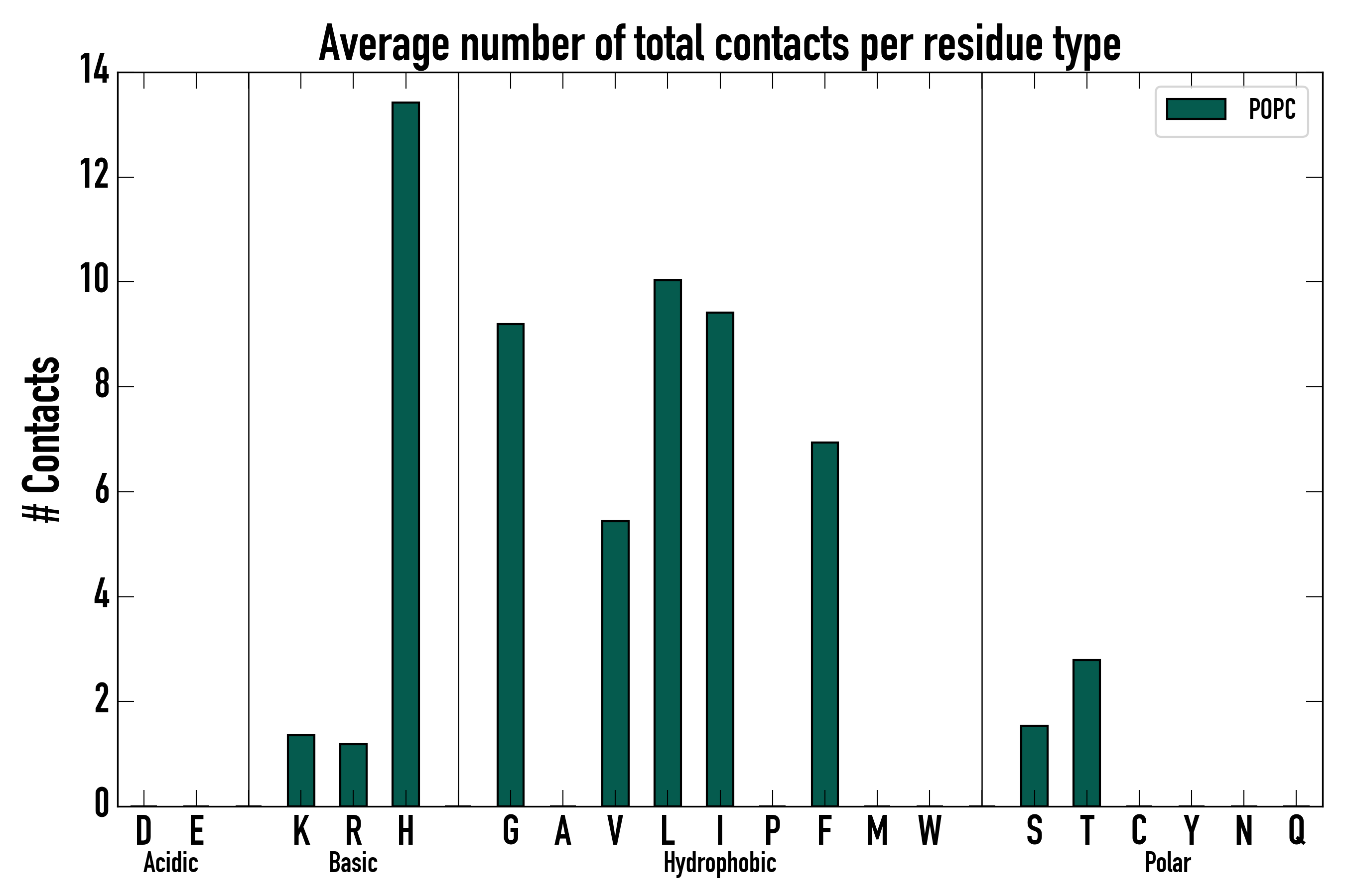 Number of contacts between each residue of the peptide backbone and the different lipid types, averaged over the last microsecond and using a cut-off of 0.6 nm.