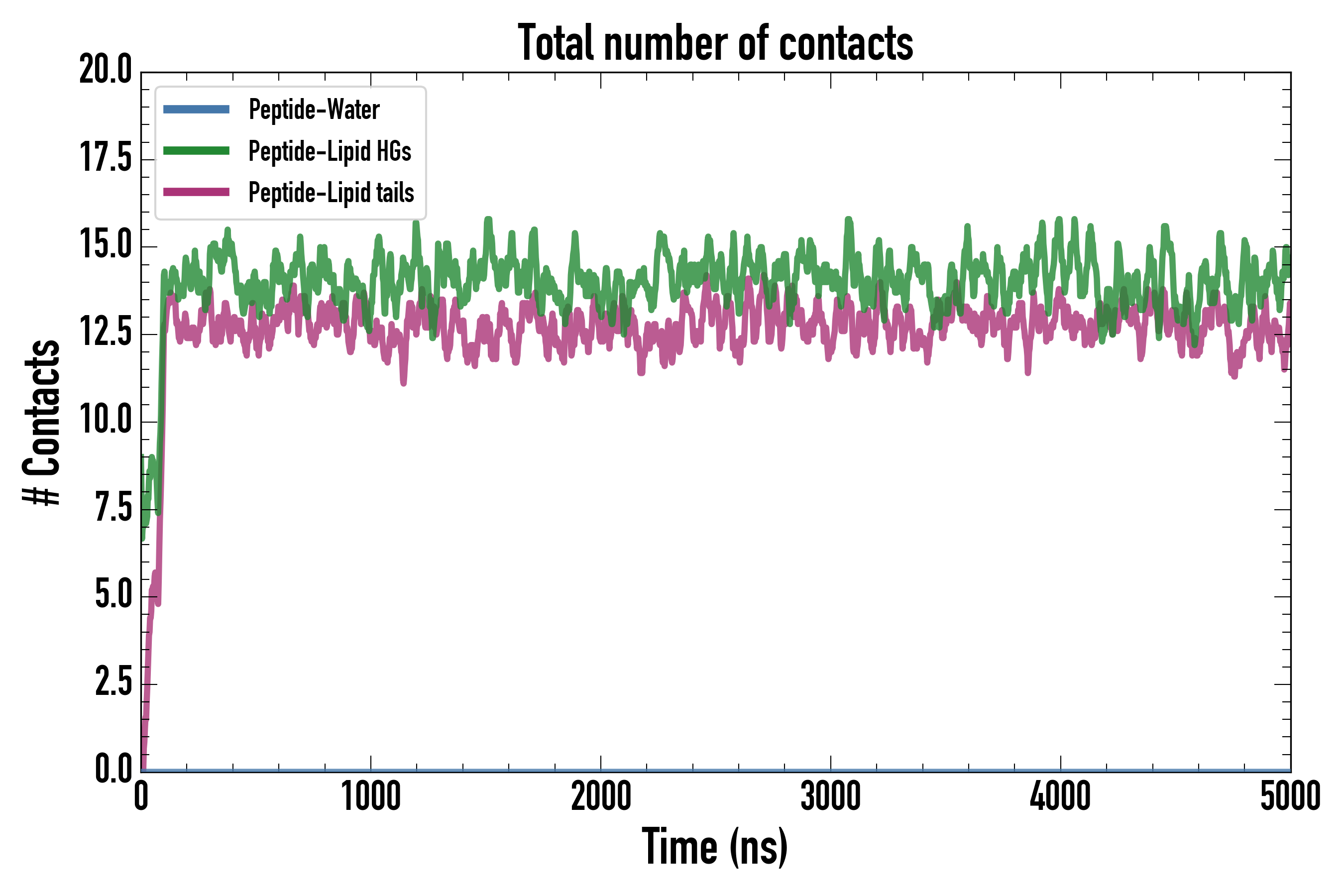 Number of contacts between each residue of the peptide backbone and the different lipid types, averaged over the last microsecond and using a cut-off of 0.6 nm.