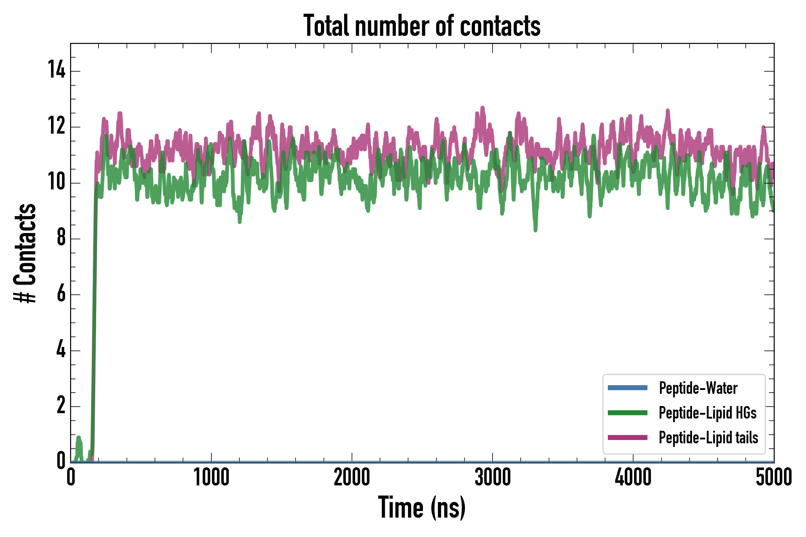 Number of contacts between each residue of the peptide backbone and the different lipid types, averaged over the last microsecond and using a cut-off of 0.6 nm.