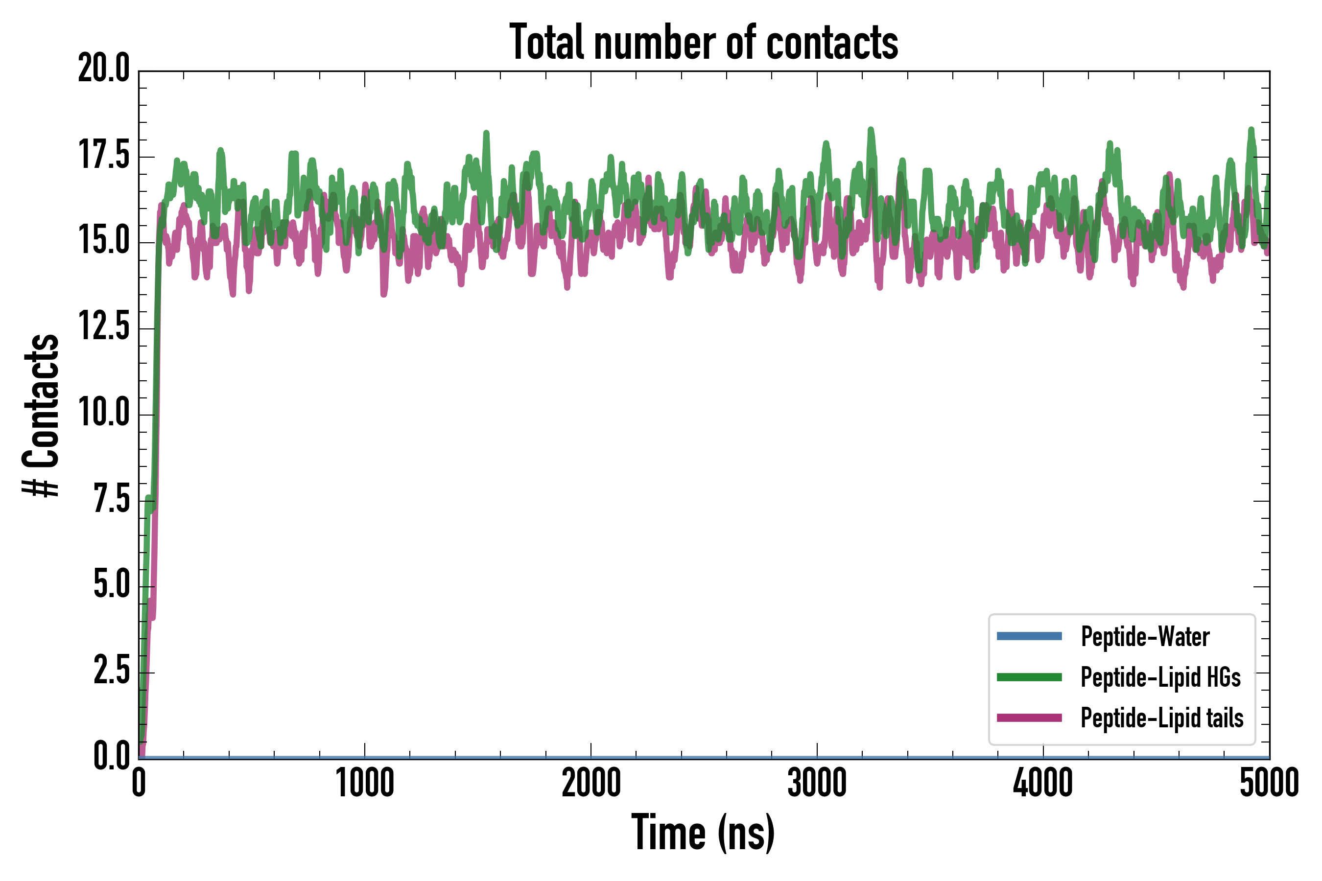 Number of contacts between each residue of the peptide backbone and the different lipid types, averaged over the last microsecond and using a cut-off of 0.6 nm.