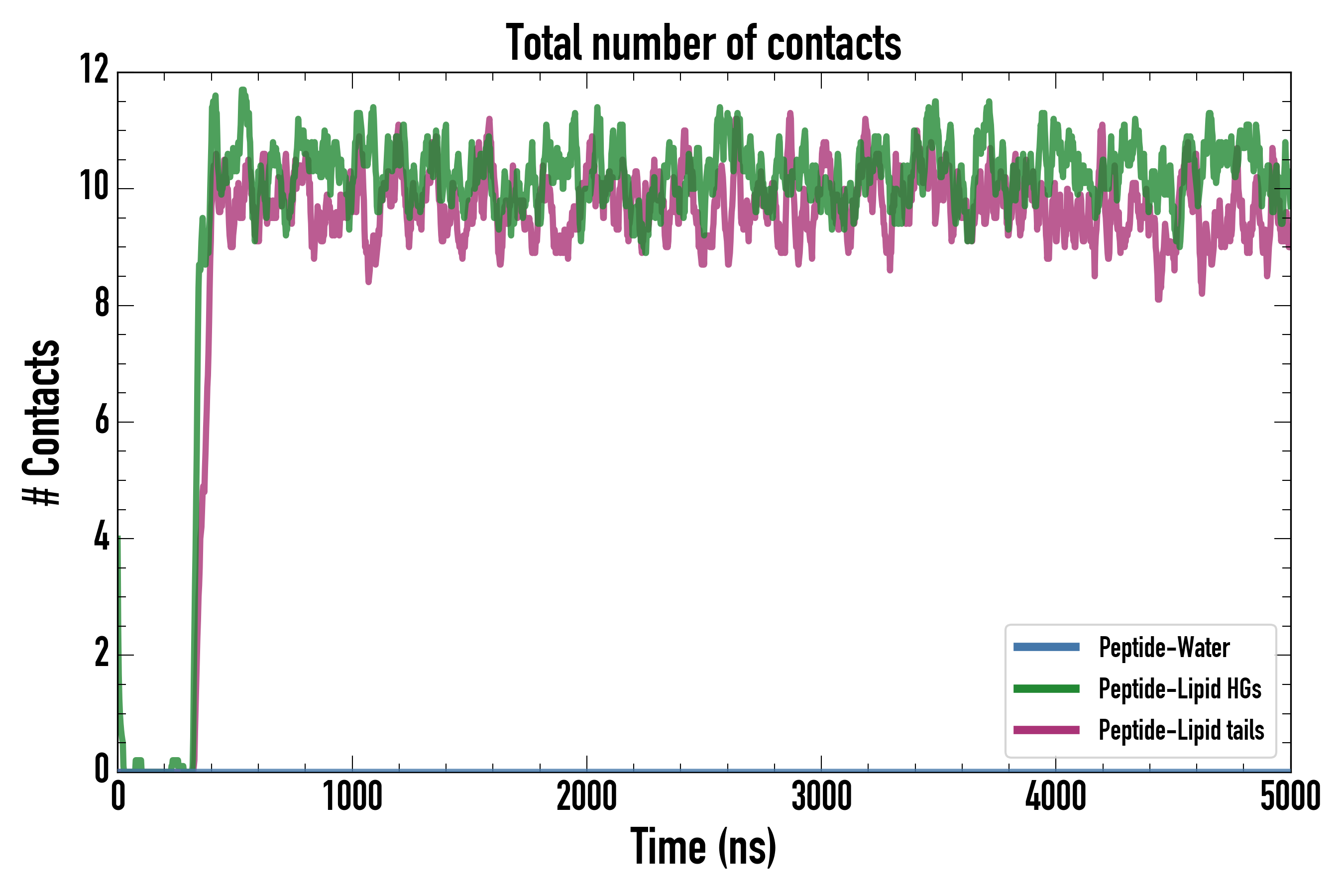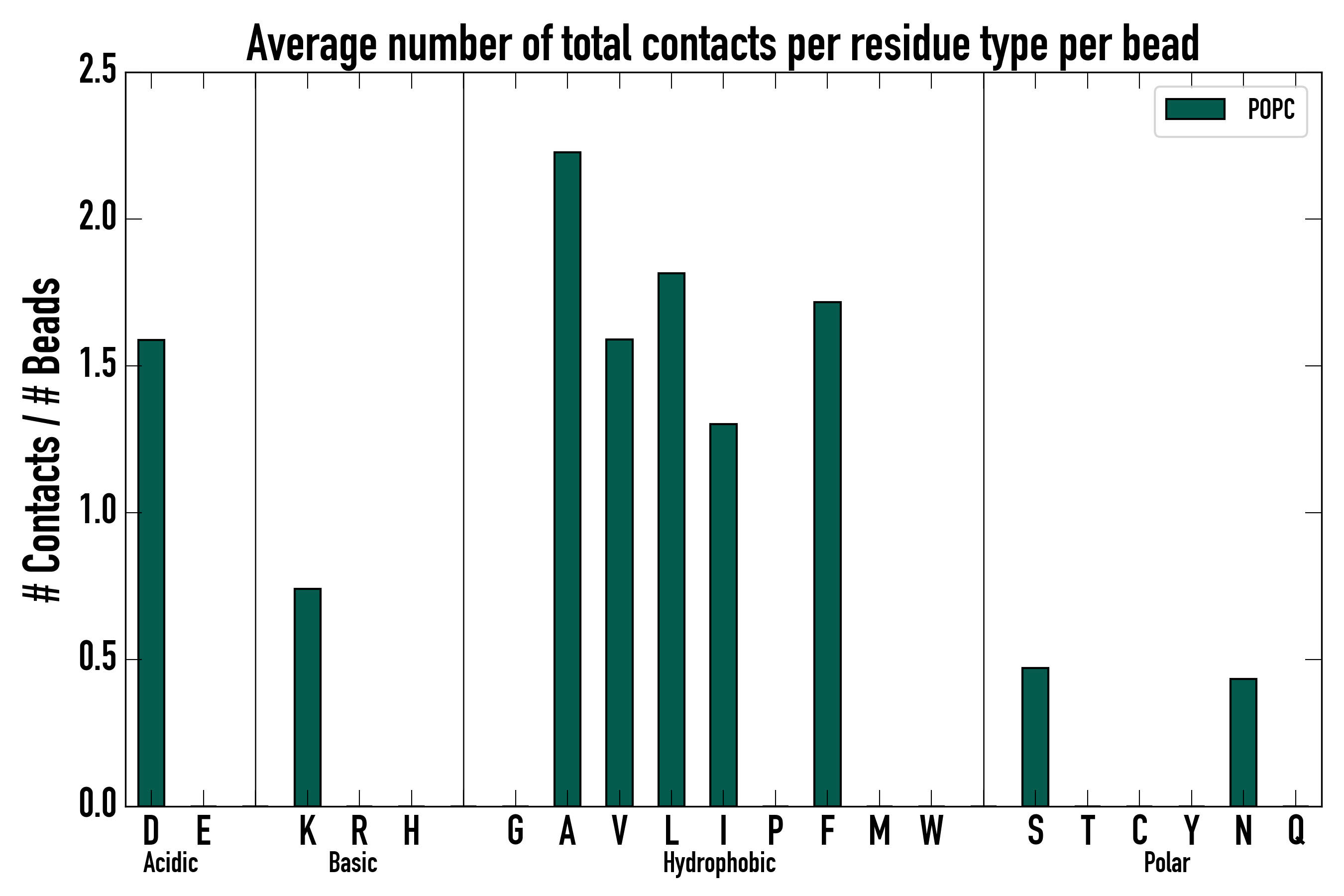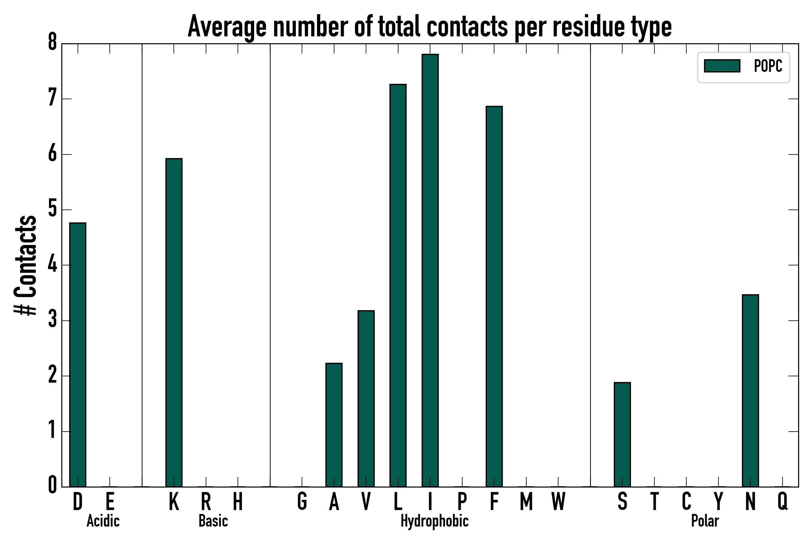 Number of contacts between each residue of the peptide backbone and the different lipid types, averaged over the last microsecond and using a cut-off of 0.6 nm.