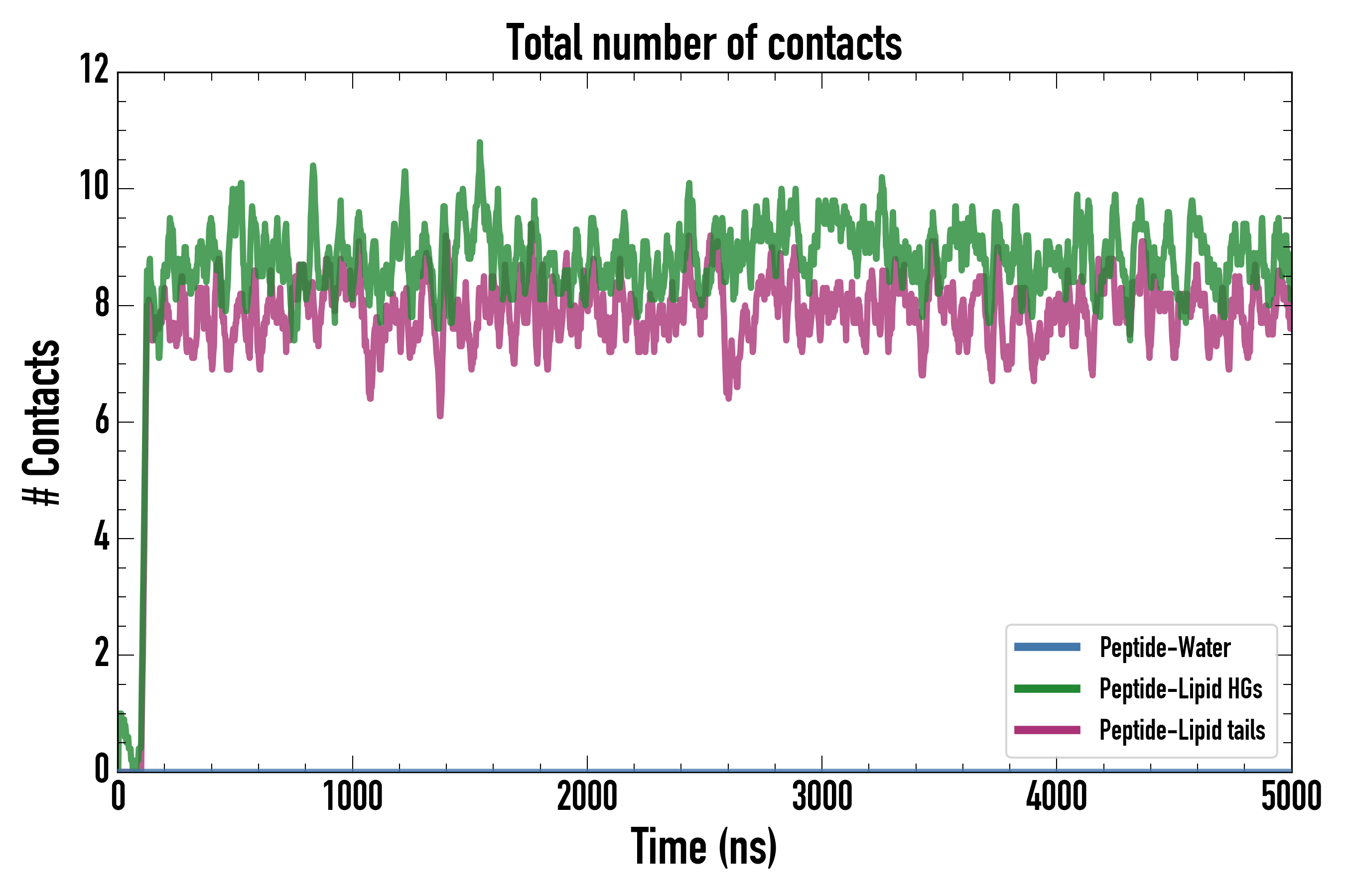 Number of contacts between each residue of the peptide backbone and the different lipid types, averaged over the last microsecond and using a cut-off of 0.6 nm.