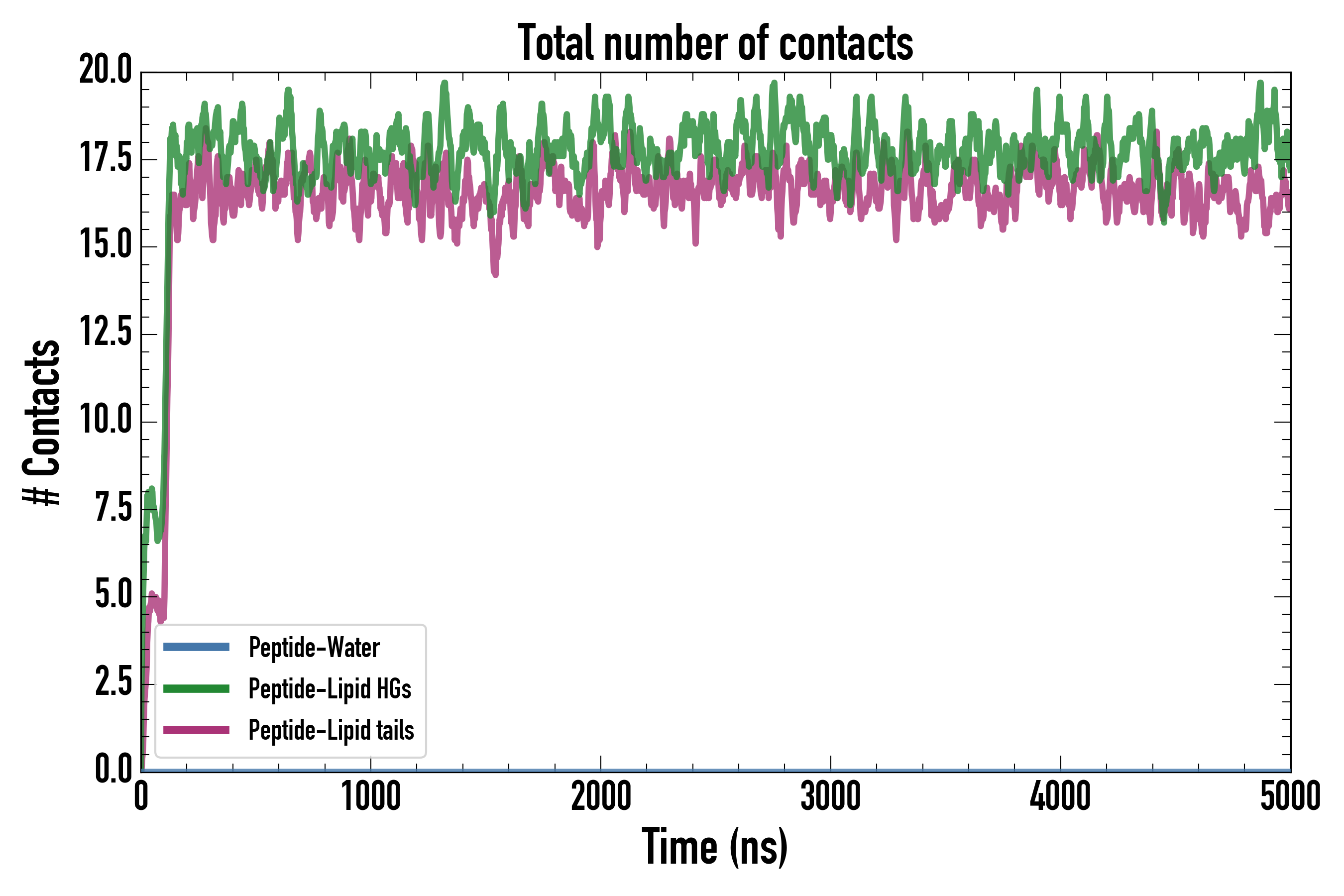 Number of contacts between each residue of the peptide backbone and the different lipid types, averaged over the last microsecond and using a cut-off of 0.6 nm.