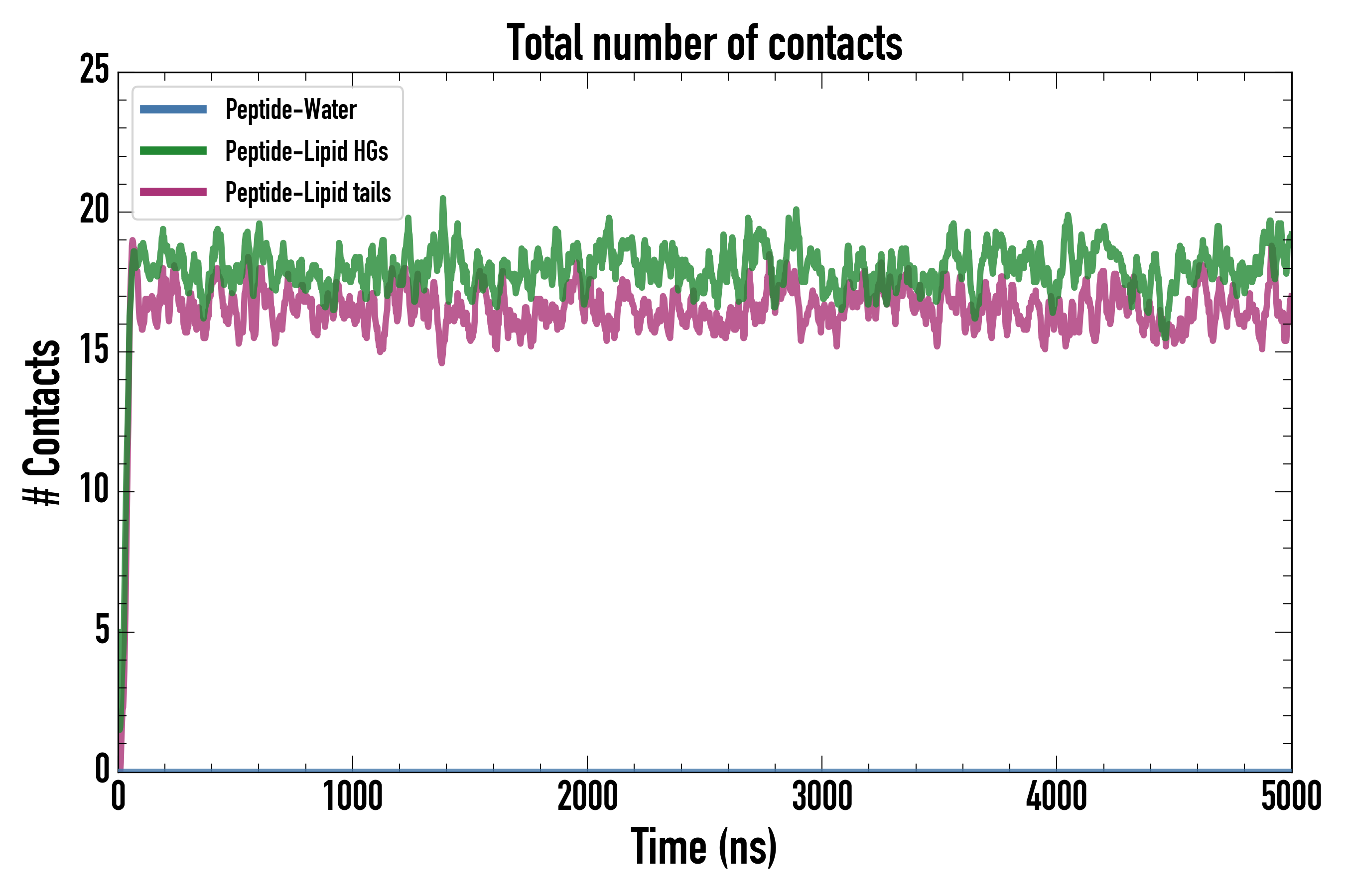 Number of contacts between each residue of the peptide backbone and the different lipid types, averaged over the last microsecond and using a cut-off of 0.6 nm.