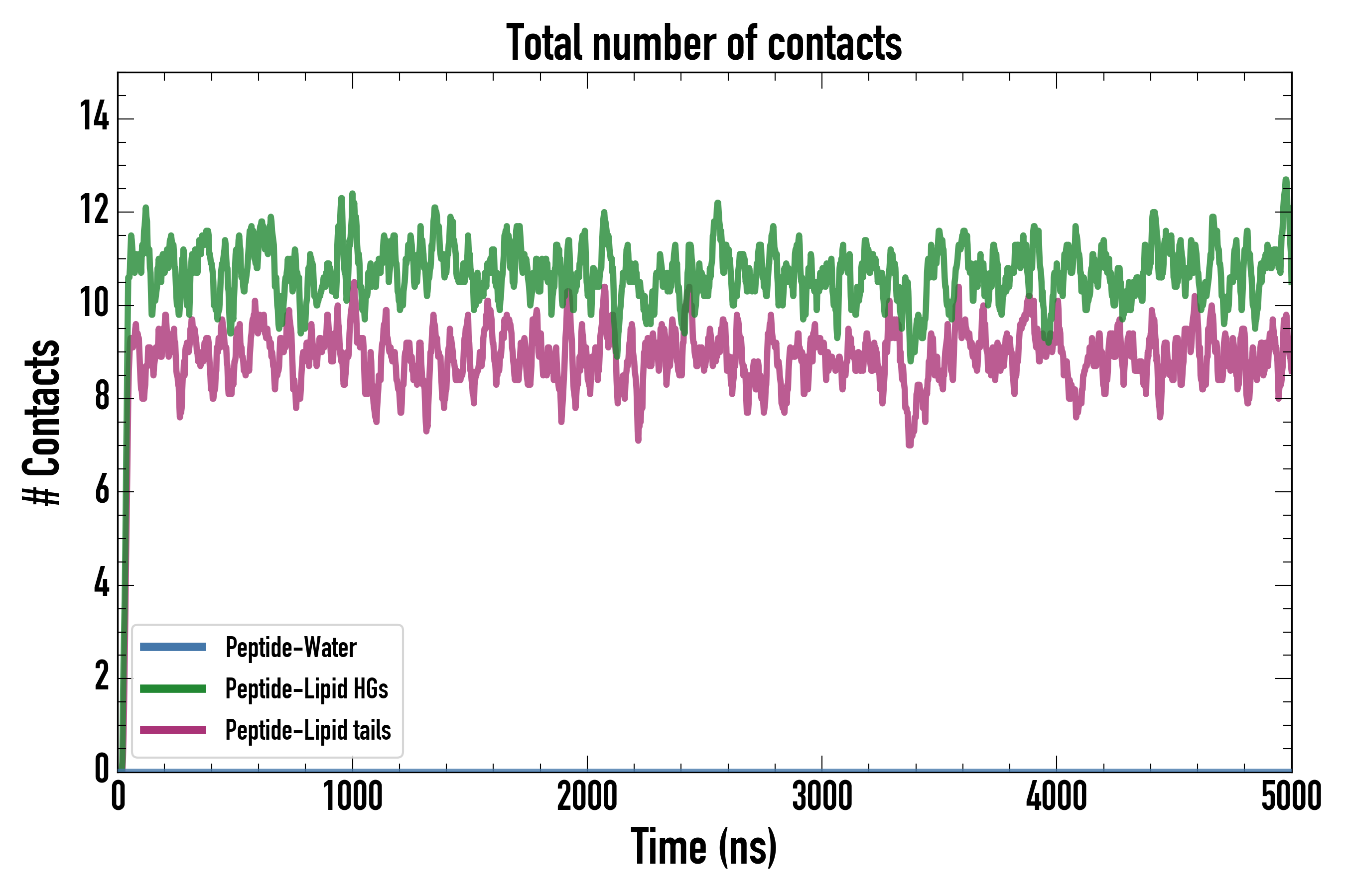 Number of contacts between each residue of the peptide backbone and the different lipid types, averaged over the last microsecond and using a cut-off of 0.6 nm.