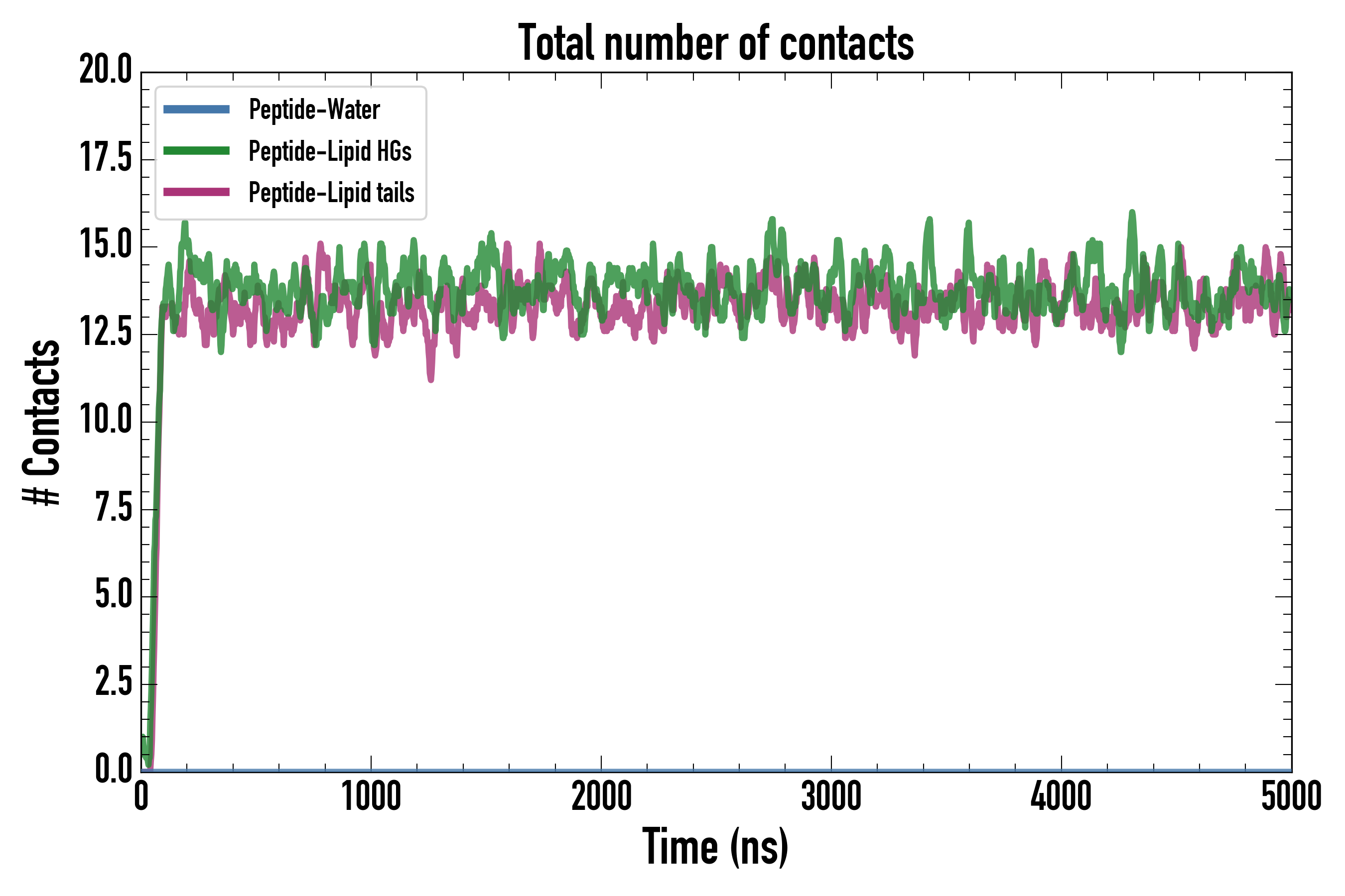 Number of contacts between each residue of the peptide backbone and the different lipid types, averaged over the last microsecond and using a cut-off of 0.6 nm.