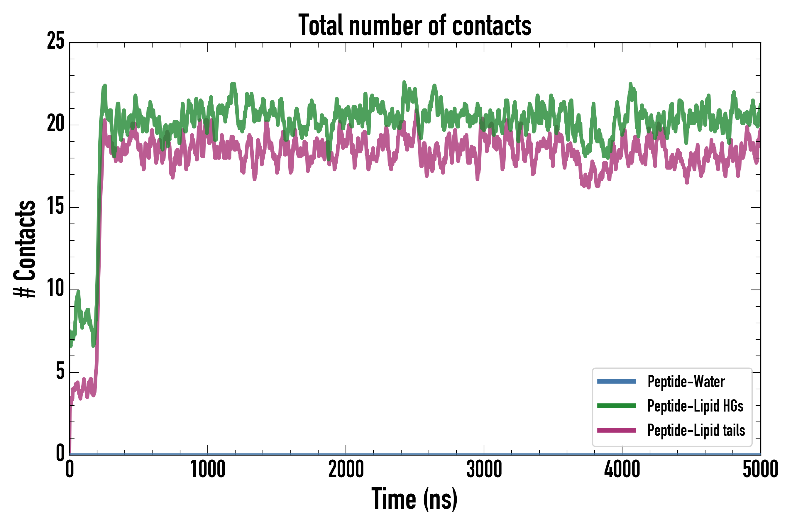 Number of contacts between each residue of the peptide backbone and the different lipid types, averaged over the last microsecond and using a cut-off of 0.6 nm.