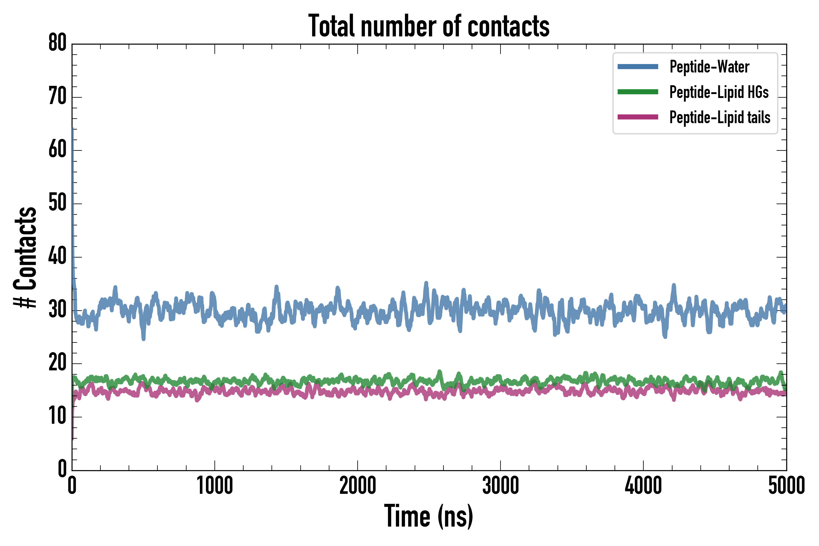 Number of contacts between each residue of the peptide backbone and the different lipid types, averaged over the last microsecond and using a cut-off of 0.6 nm.