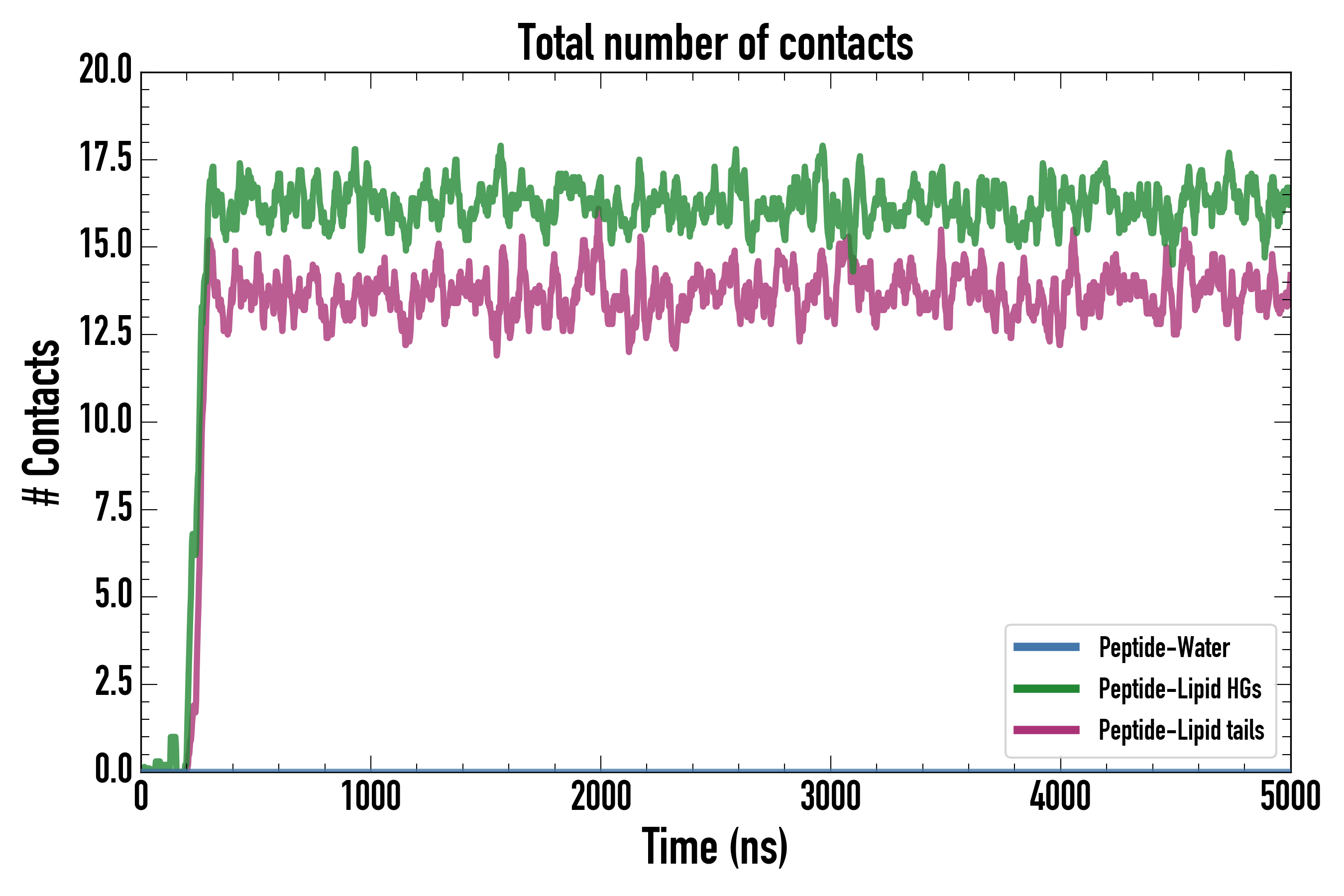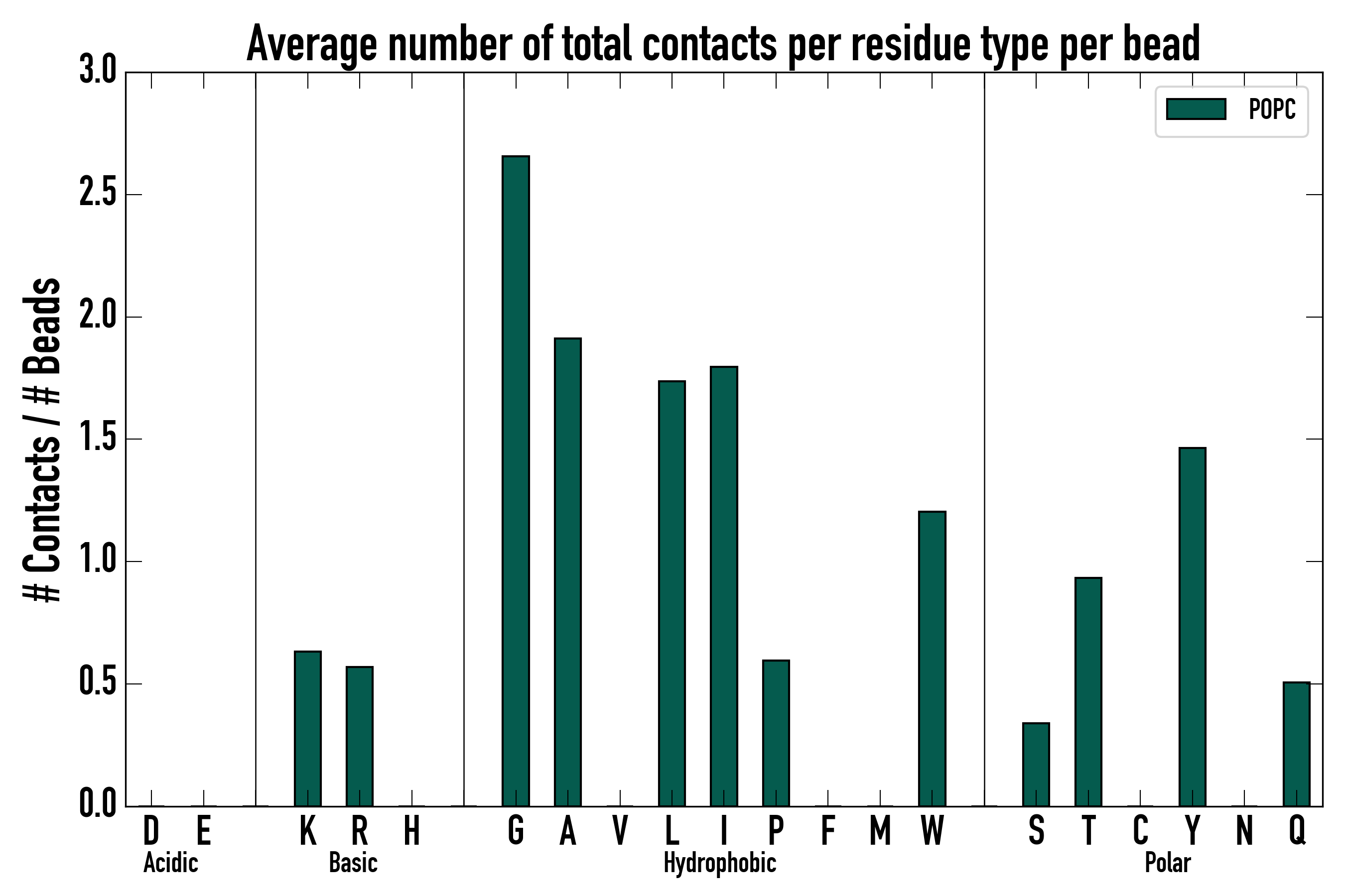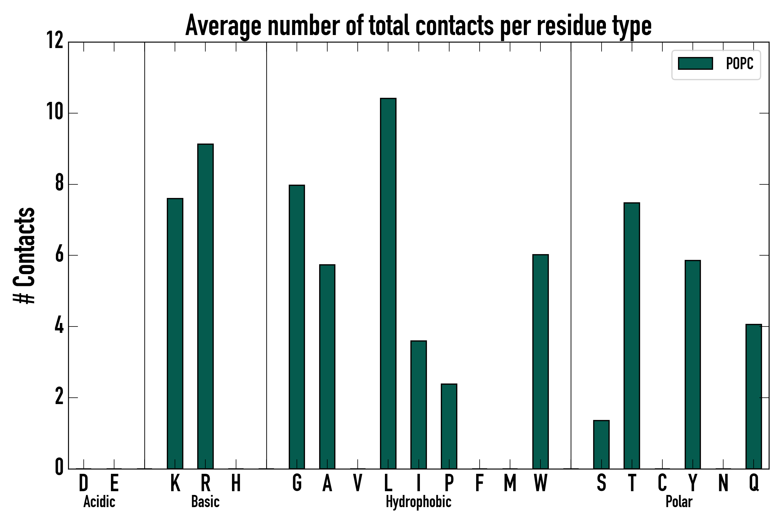 Number of contacts between each residue of the peptide backbone and the different lipid types, averaged over the last microsecond and using a cut-off of 0.6 nm.