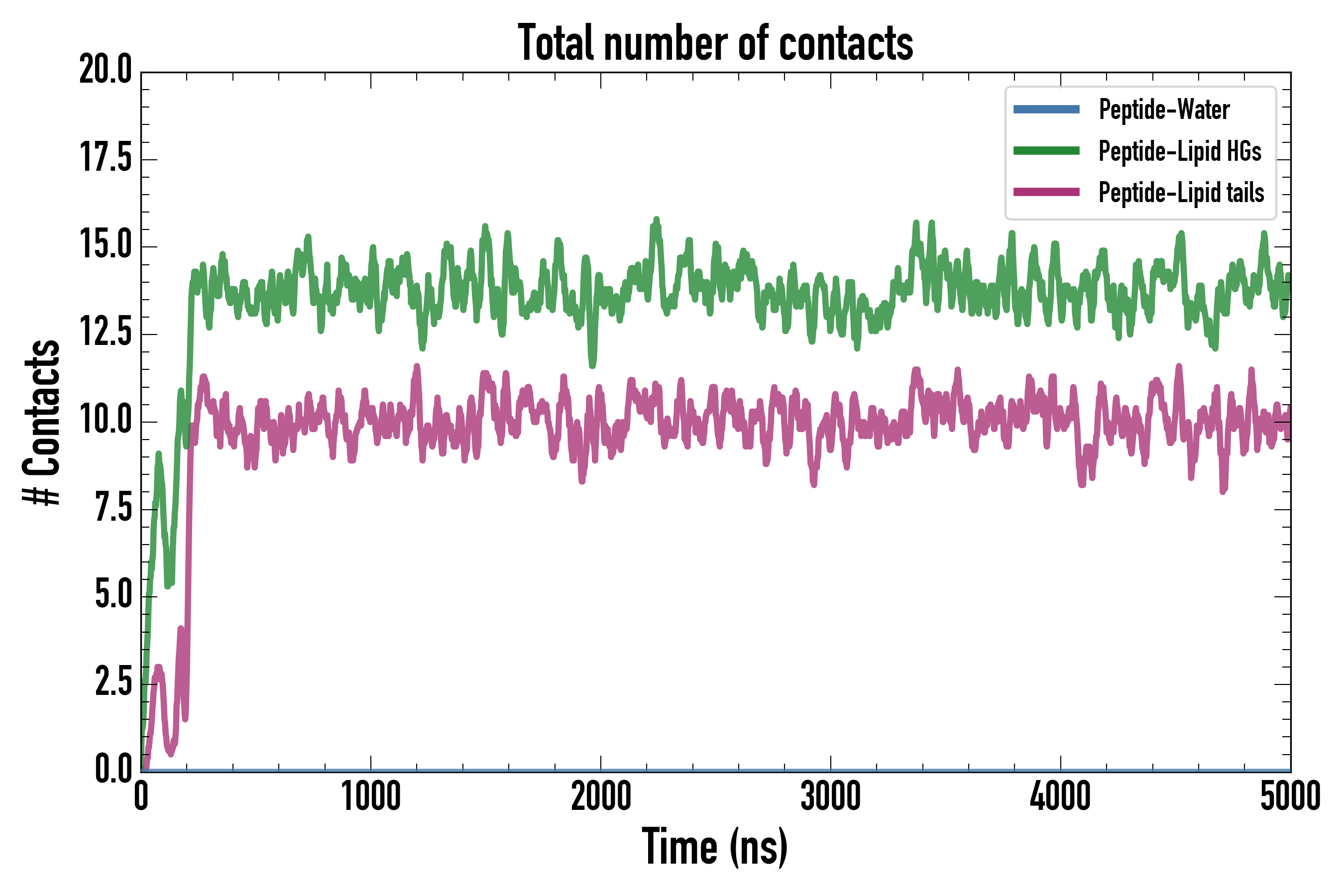 Number of contacts between each residue of the peptide backbone and the different lipid types, averaged over the last microsecond and using a cut-off of 0.6 nm.