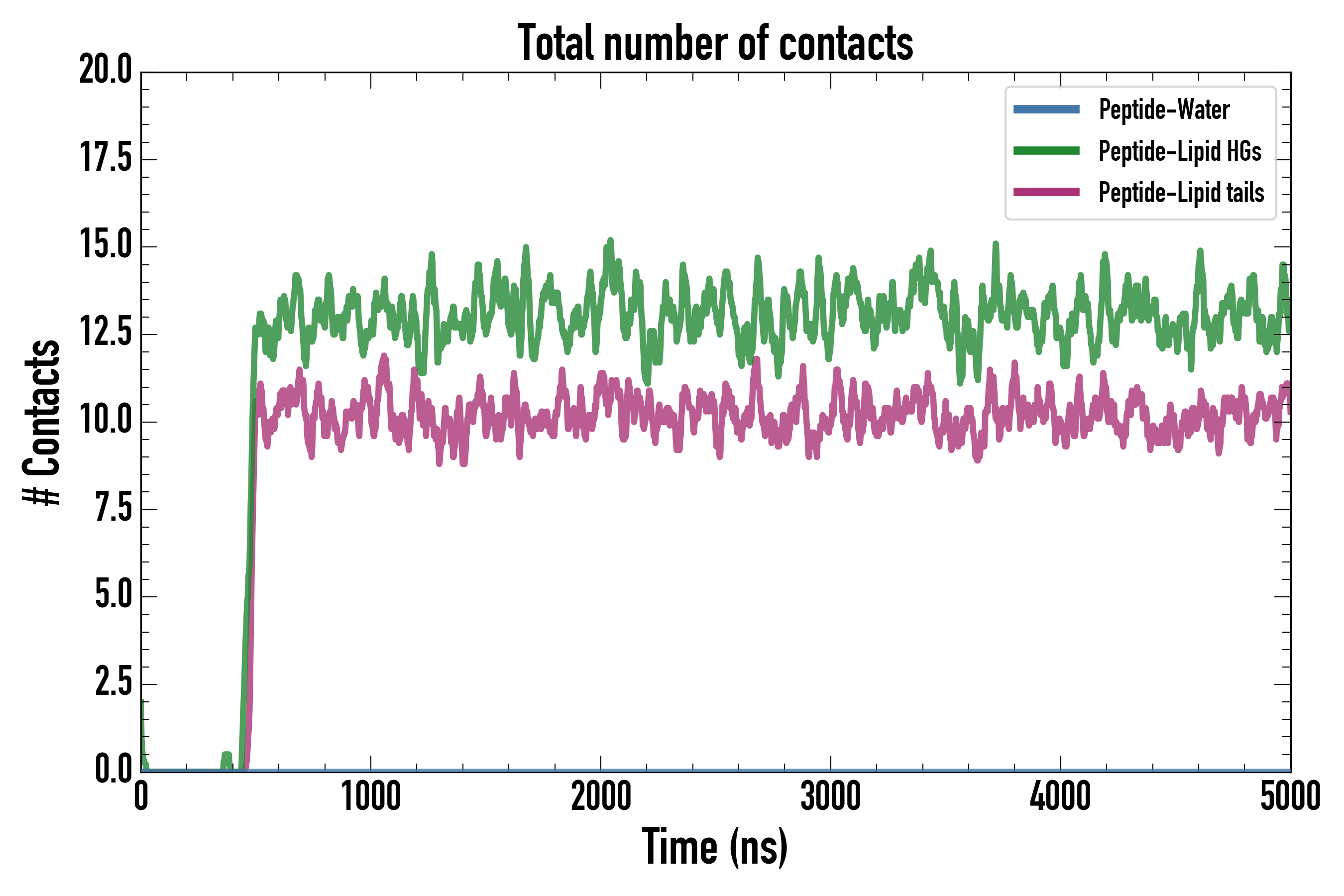 Number of contacts between each residue of the peptide backbone and the different lipid types, averaged over the last microsecond and using a cut-off of 0.6 nm.