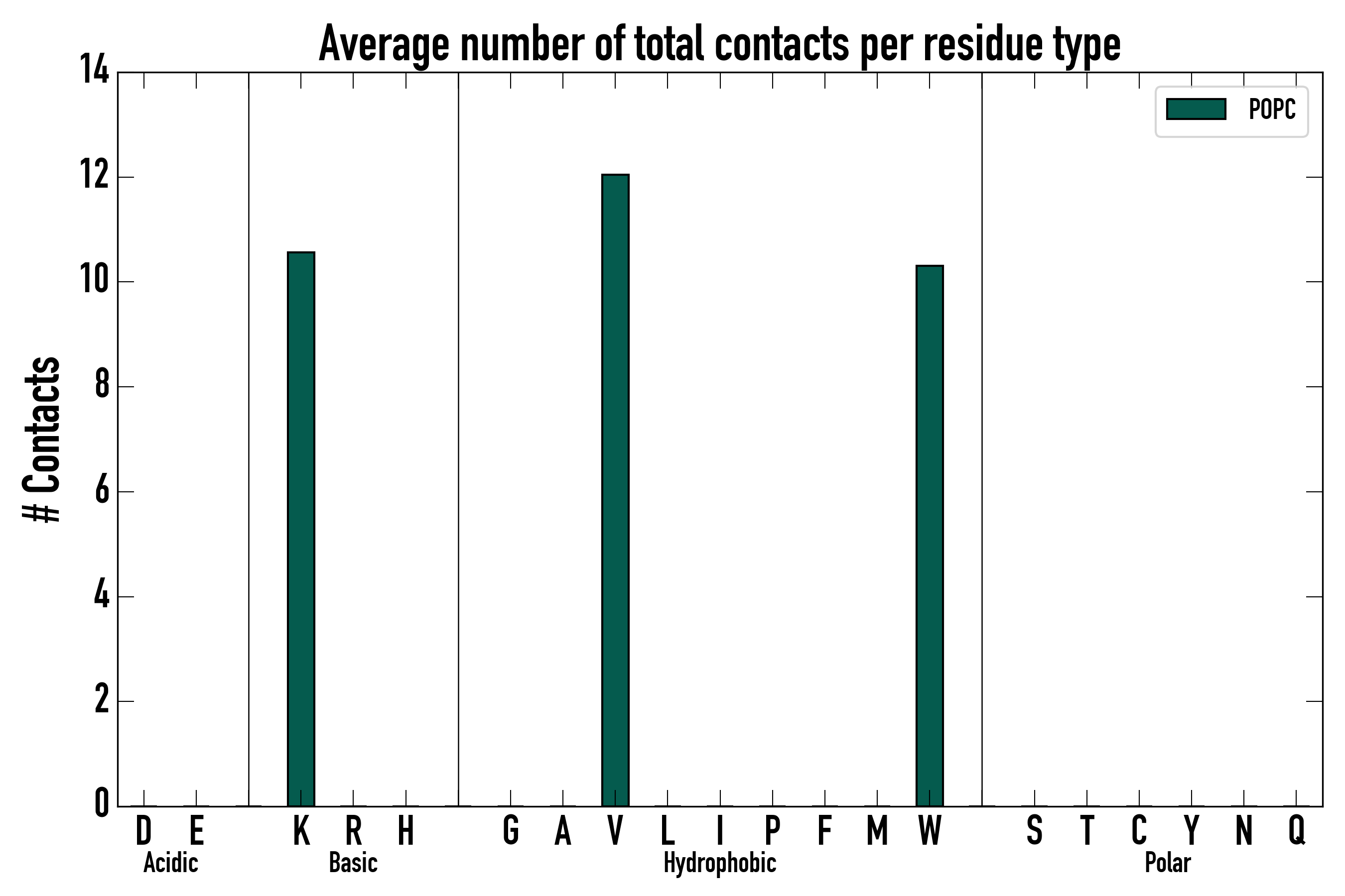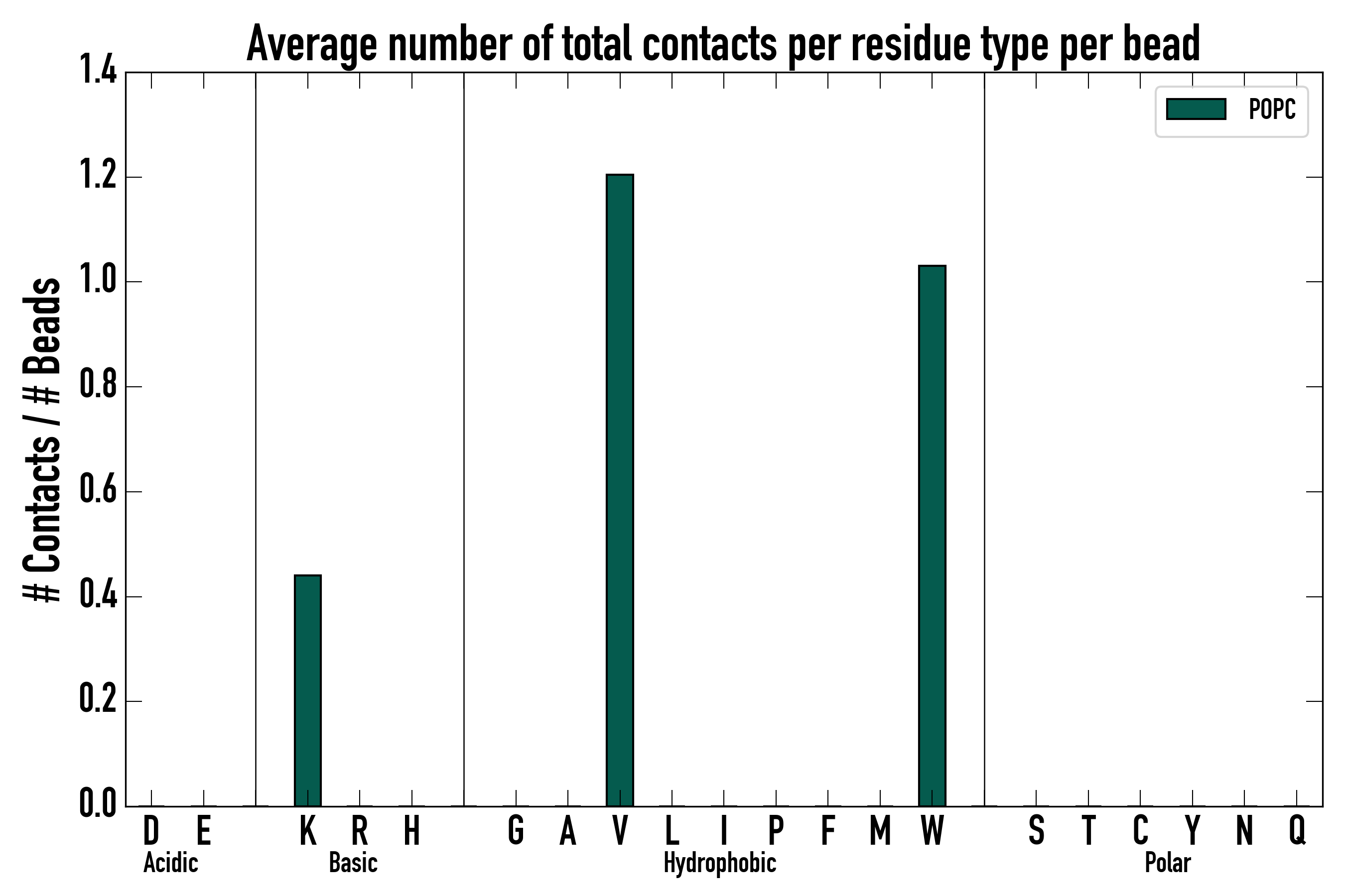 Number of contacts between each residue of the peptide backbone and the different lipid types, averaged over the last microsecond and using a cut-off of 0.6 nm.