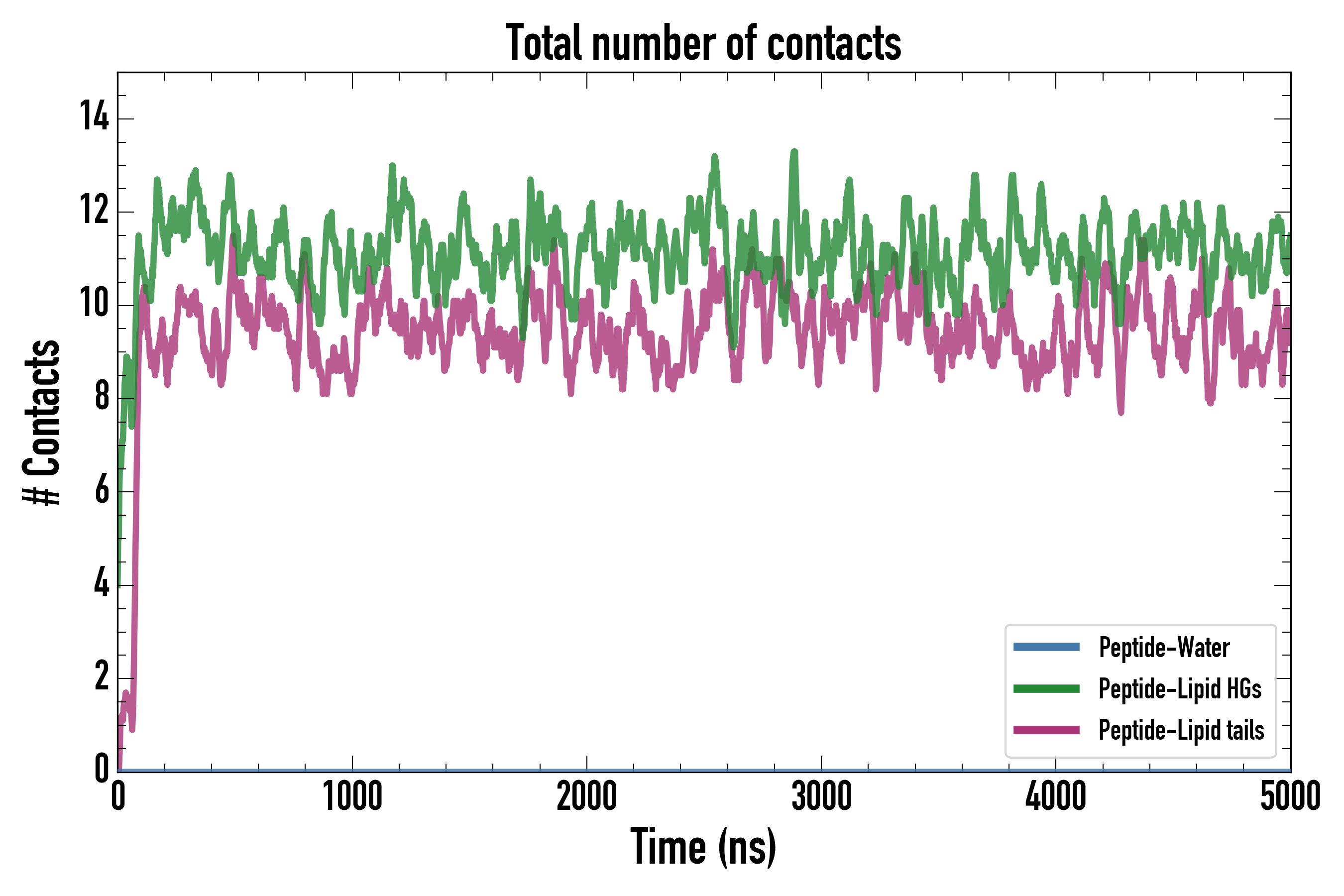 Number of contacts between each residue of the peptide backbone and the different lipid types, averaged over the last microsecond and using a cut-off of 0.6 nm.