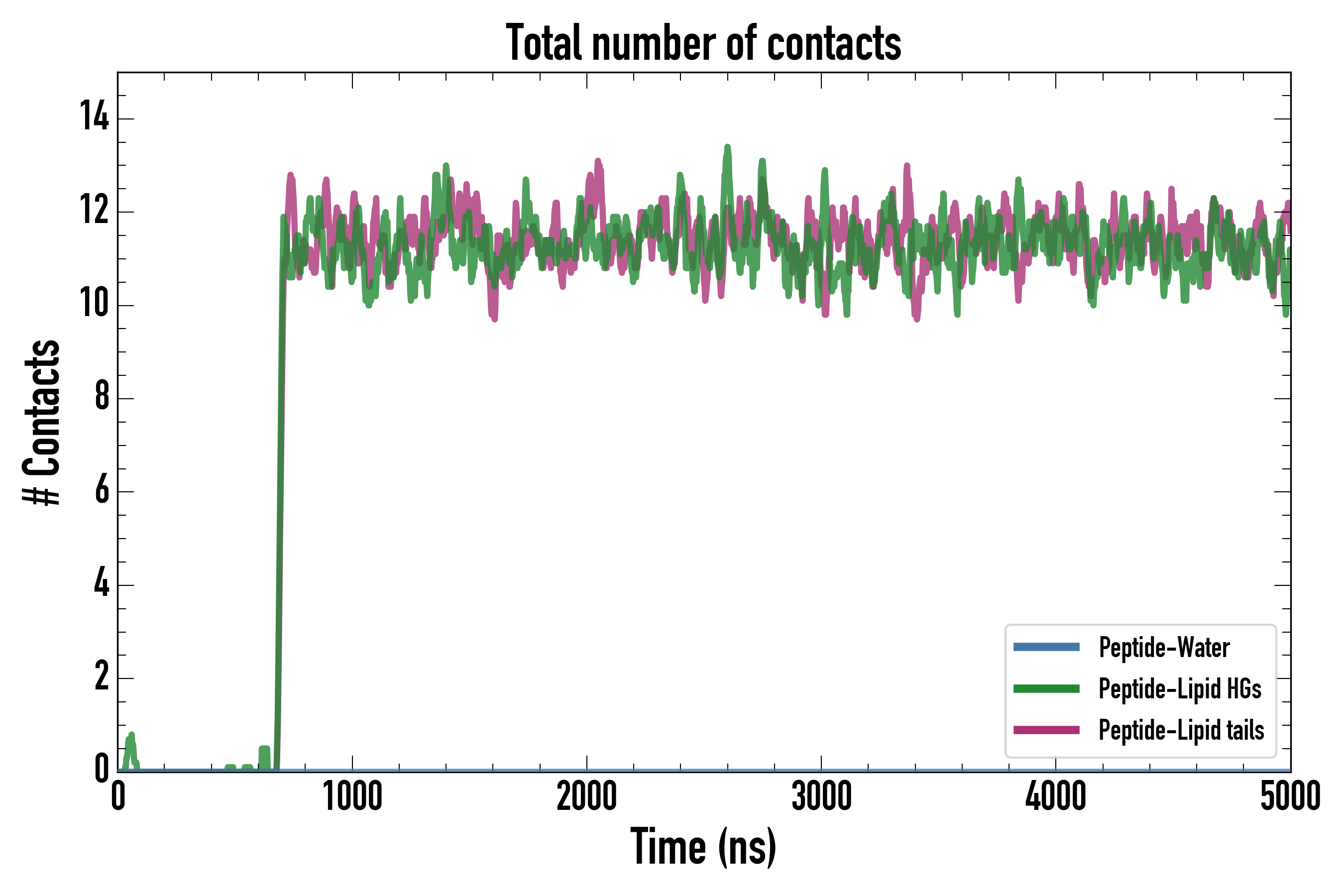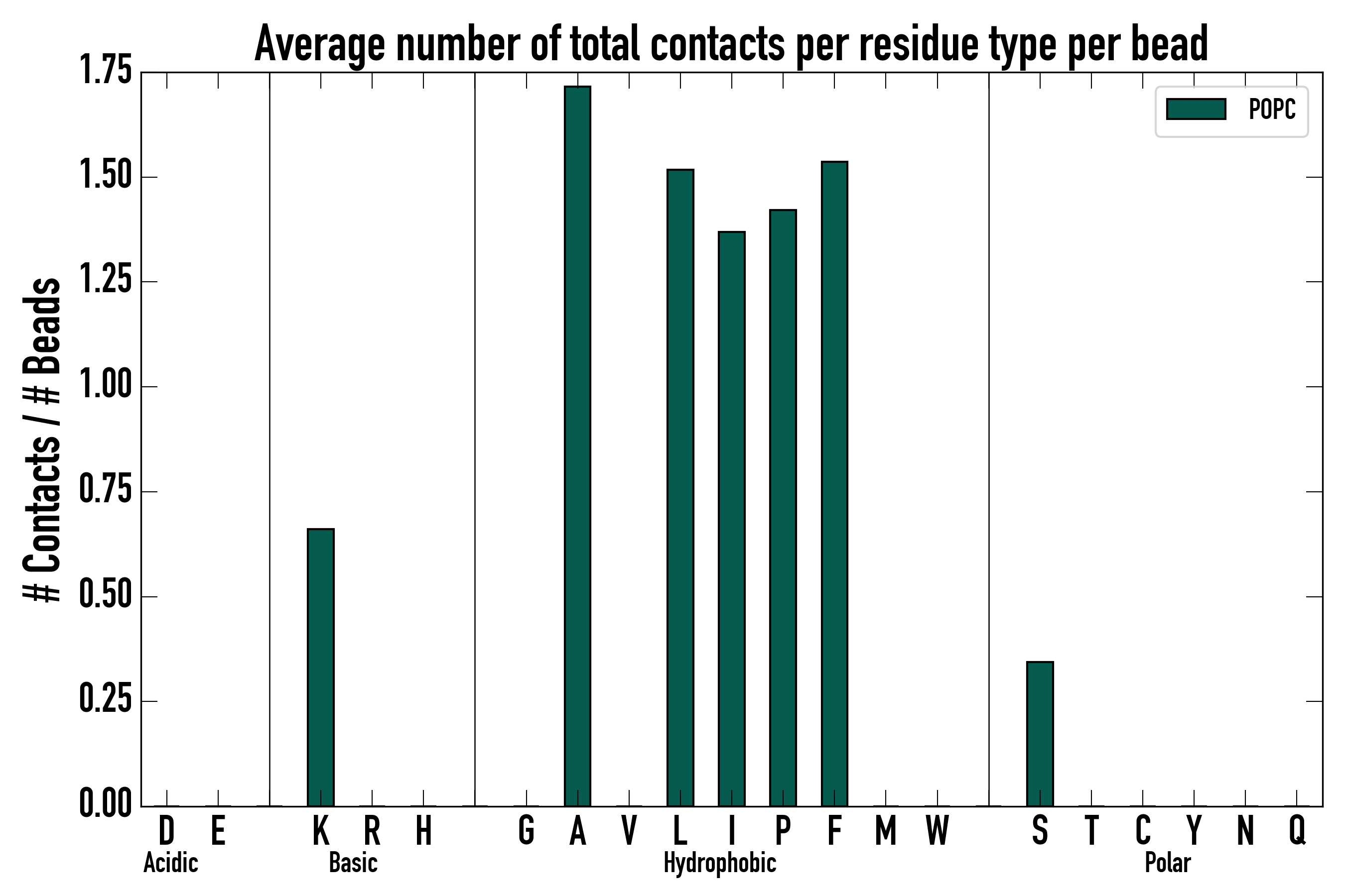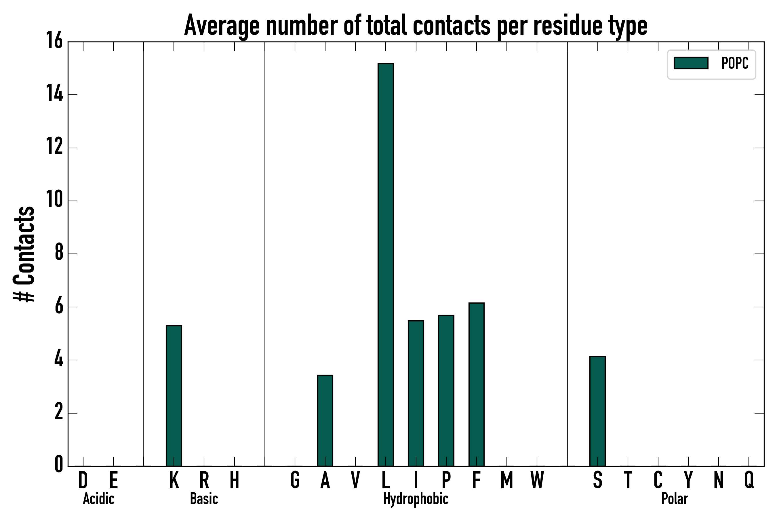Number of contacts between each residue of the peptide backbone and the different lipid types, averaged over the last microsecond and using a cut-off of 0.6 nm.