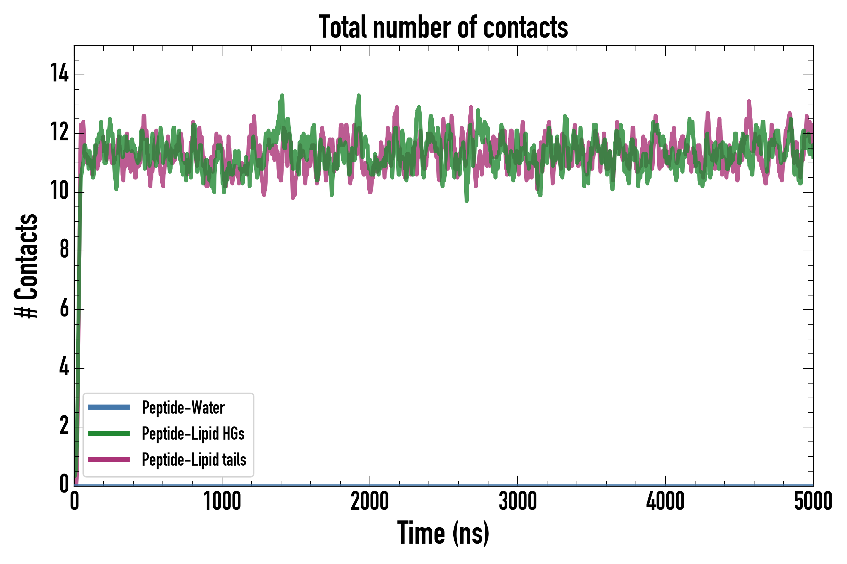 Number of contacts between each residue of the peptide backbone and the different lipid types, averaged over the last microsecond and using a cut-off of 0.6 nm.