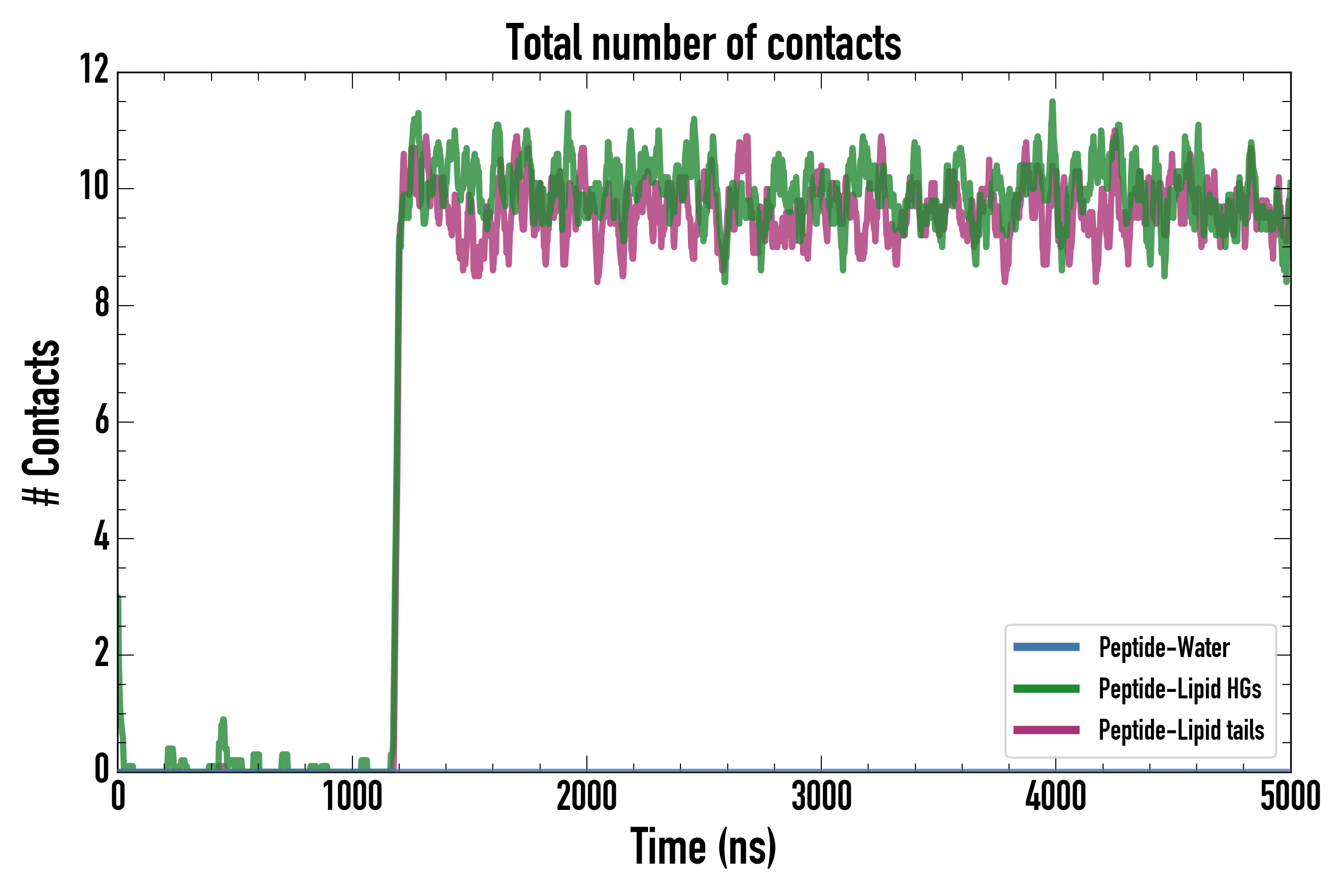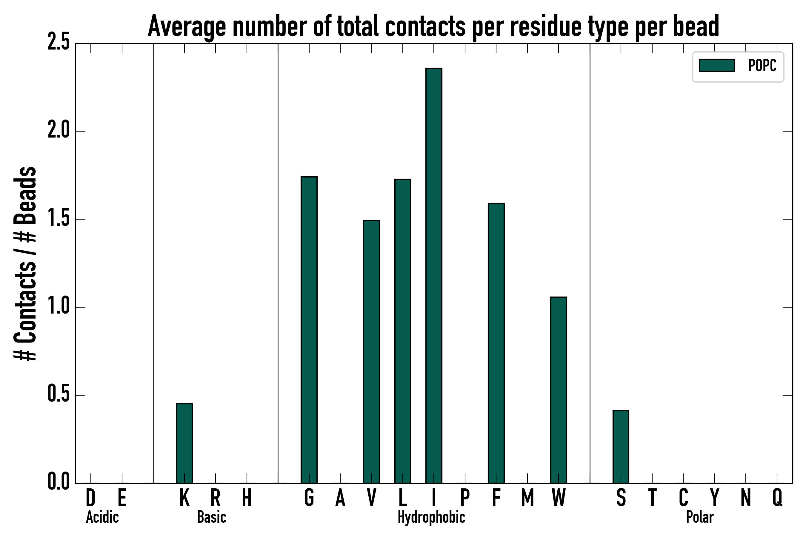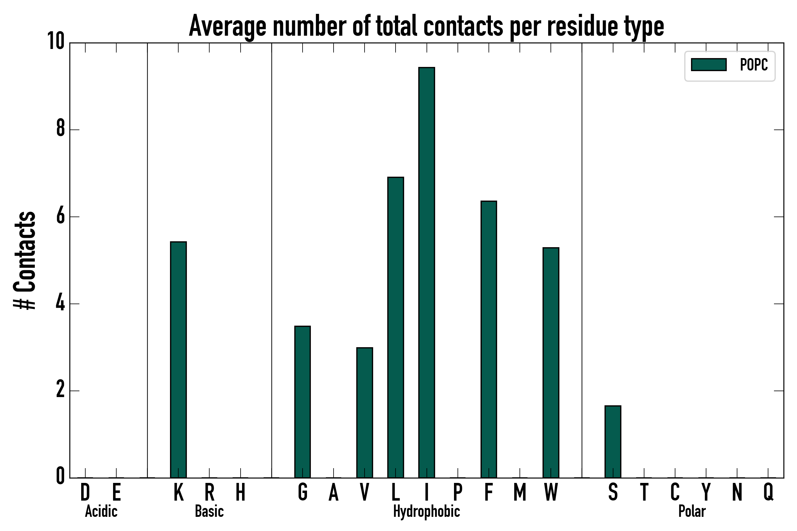 Number of contacts between each residue of the peptide backbone and the different lipid types, averaged over the last microsecond and using a cut-off of 0.6 nm.