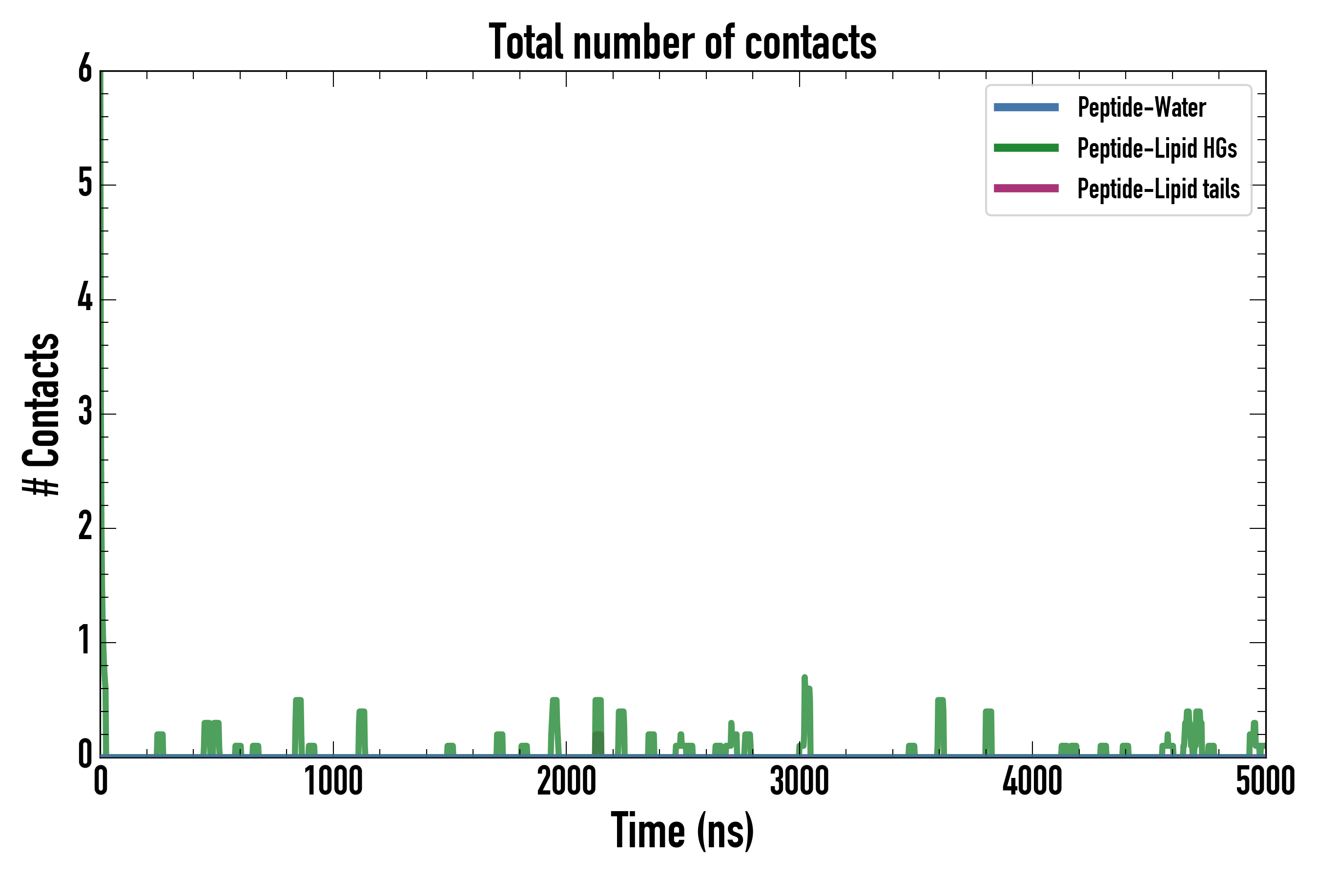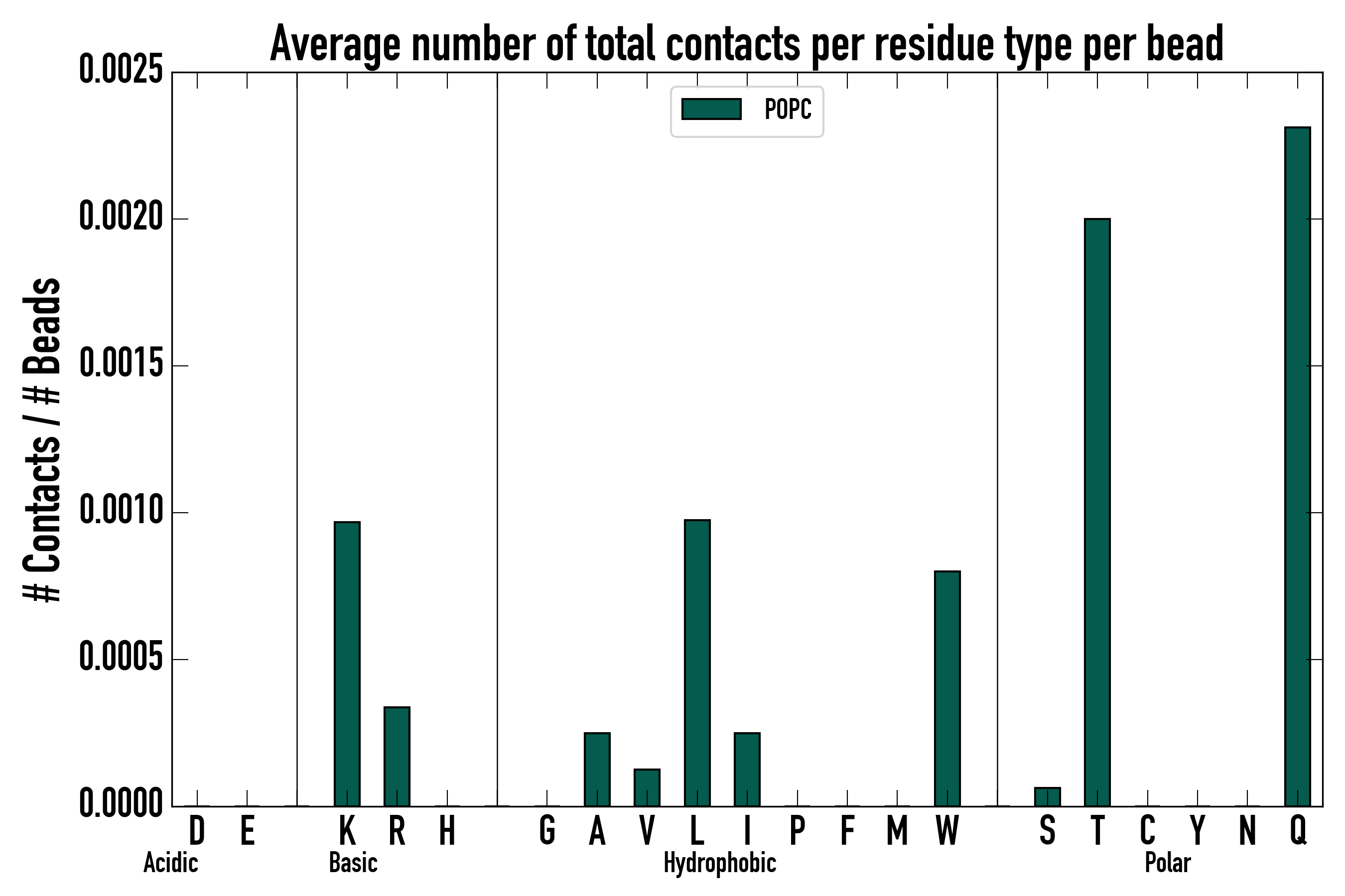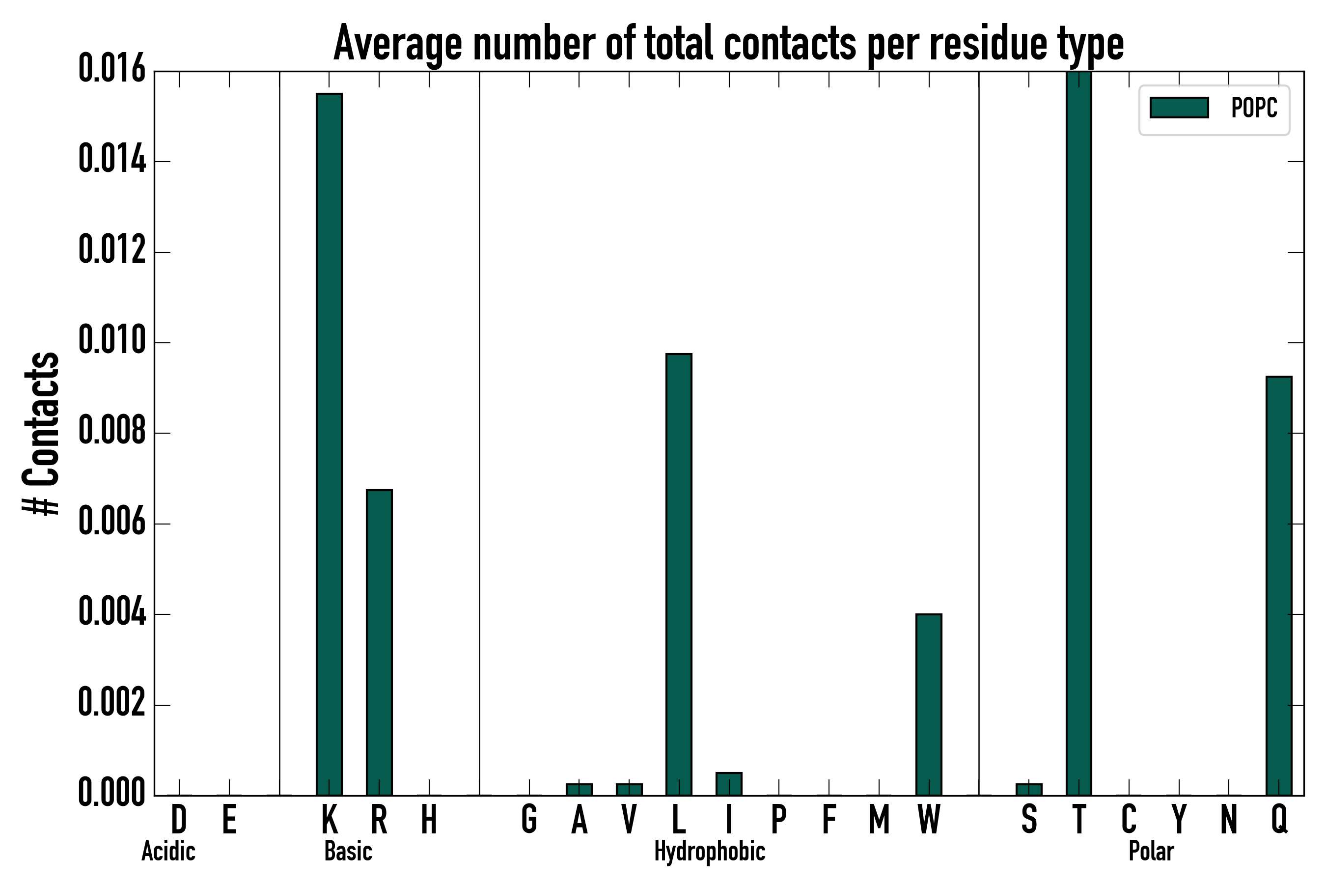 Number of contacts between each residue of the peptide backbone and the different lipid types, averaged over the last microsecond and using a cut-off of 0.6 nm.