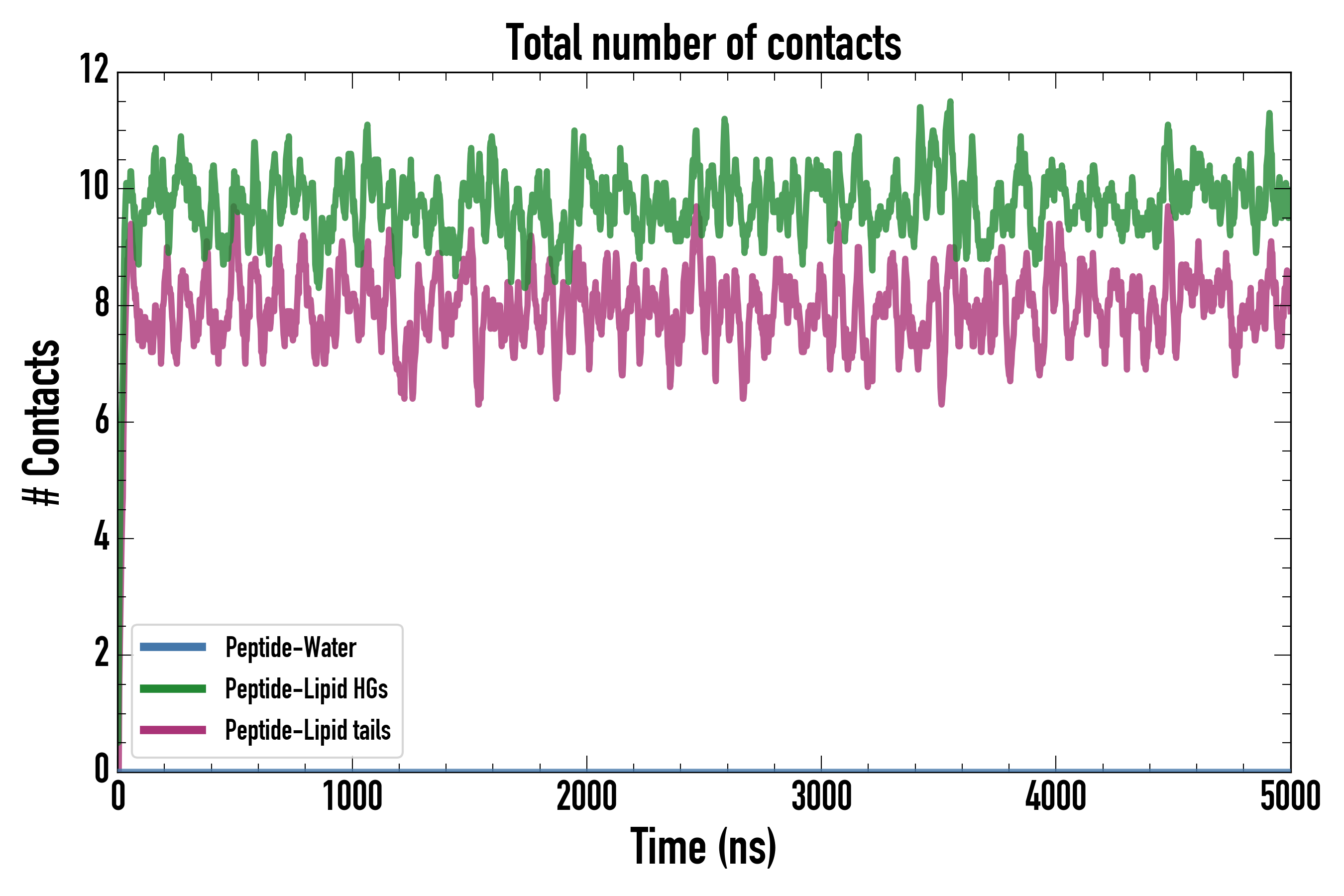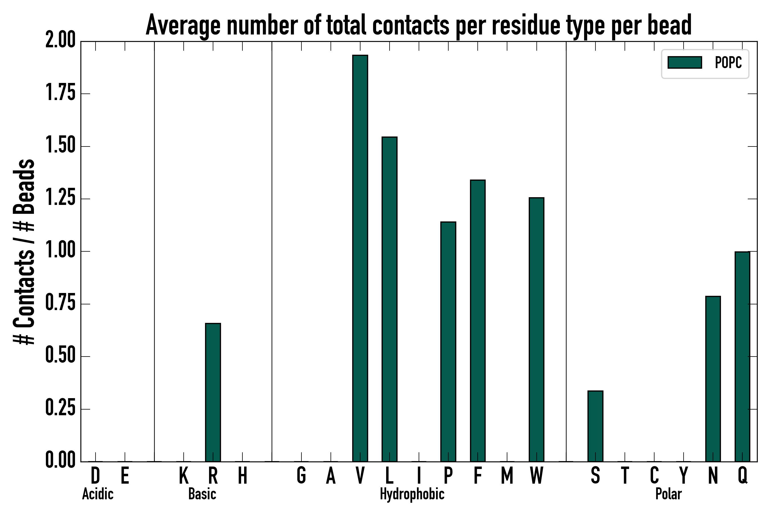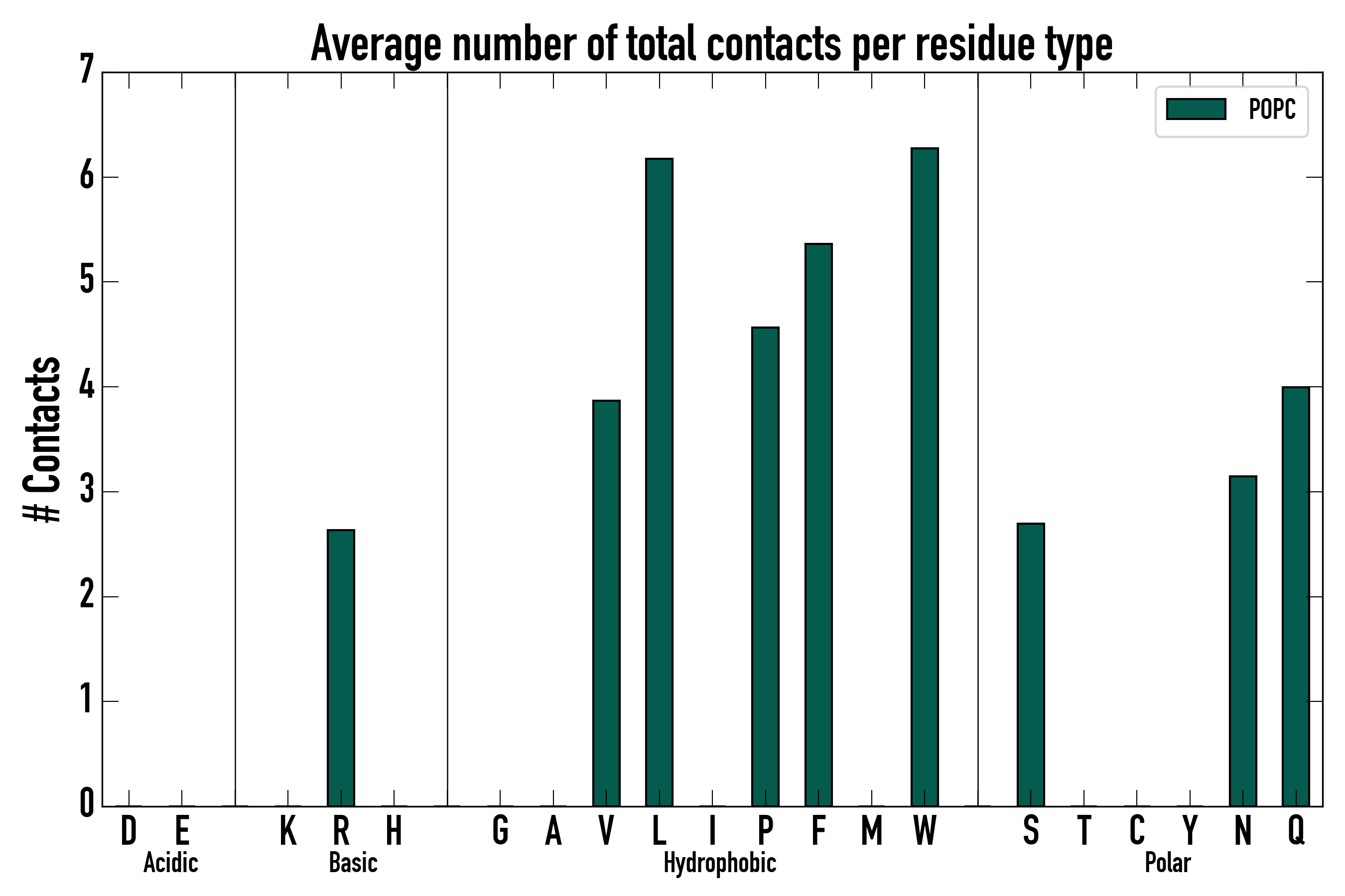 Number of contacts between each residue of the peptide backbone and the different lipid types, averaged over the last microsecond and using a cut-off of 0.6 nm.