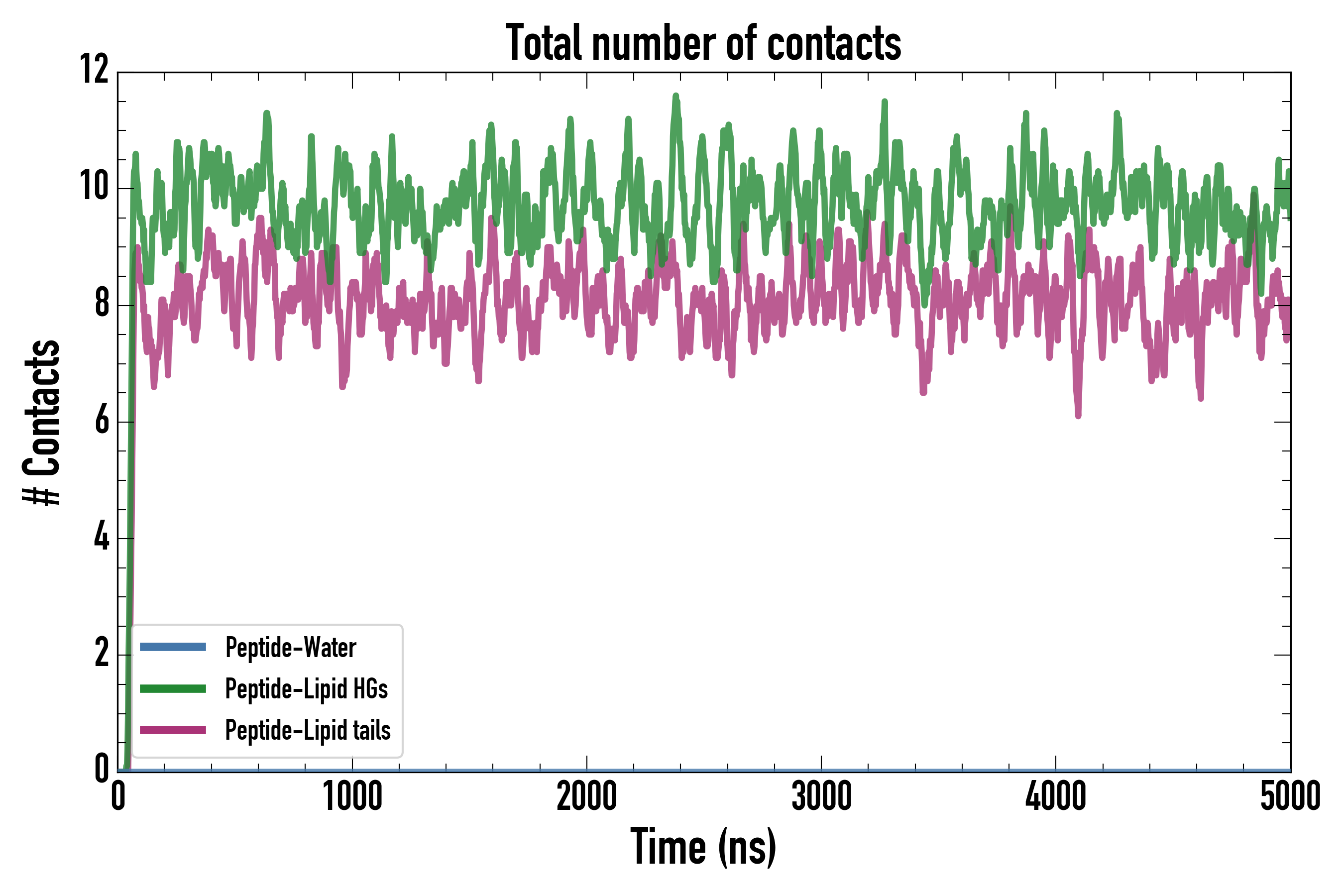 Number of contacts between each residue of the peptide backbone and the different lipid types, averaged over the last microsecond and using a cut-off of 0.6 nm.