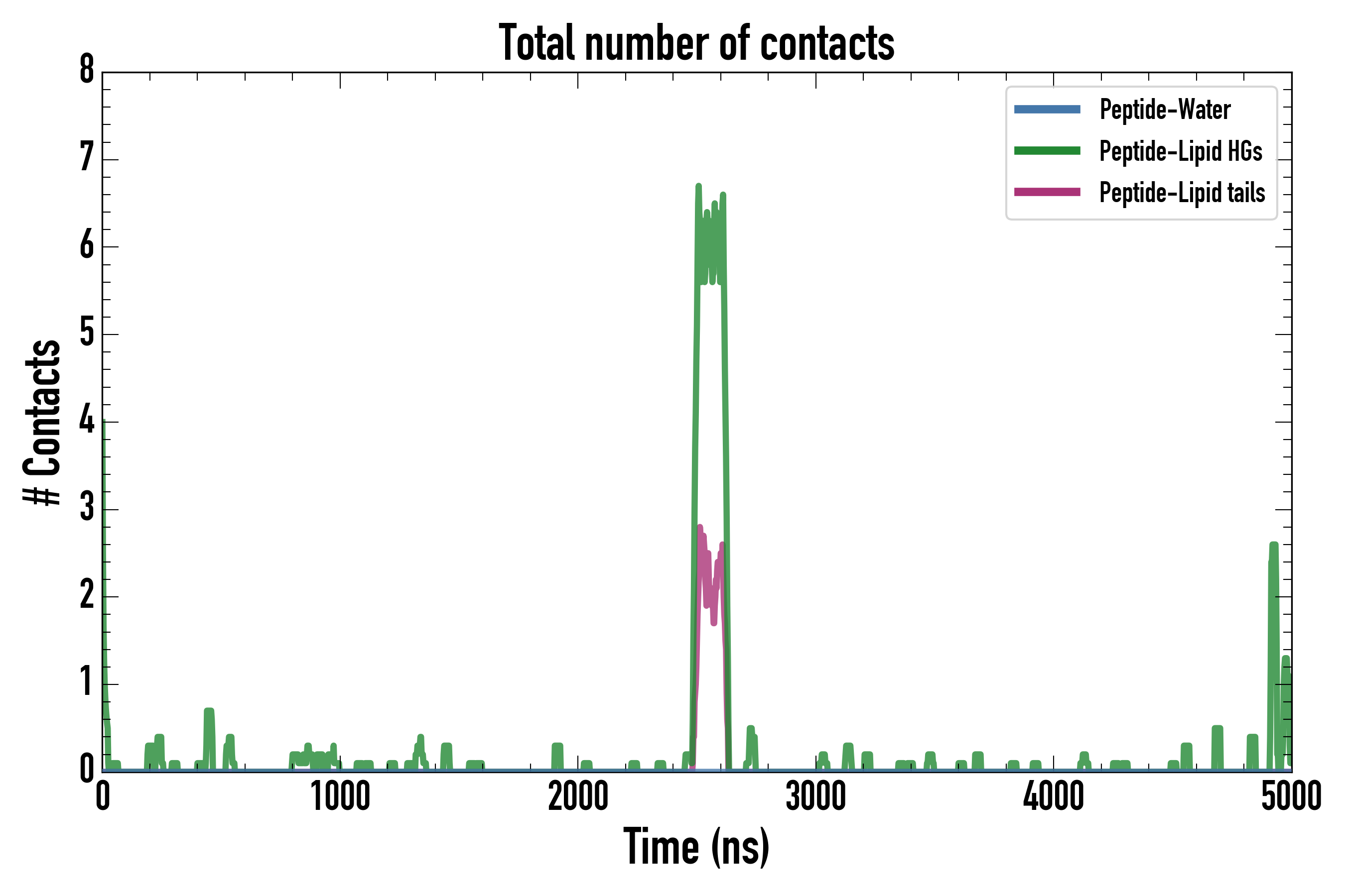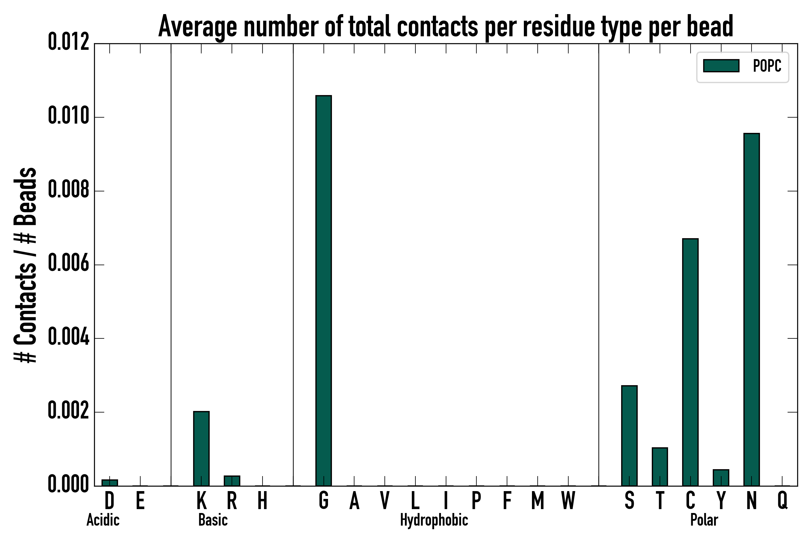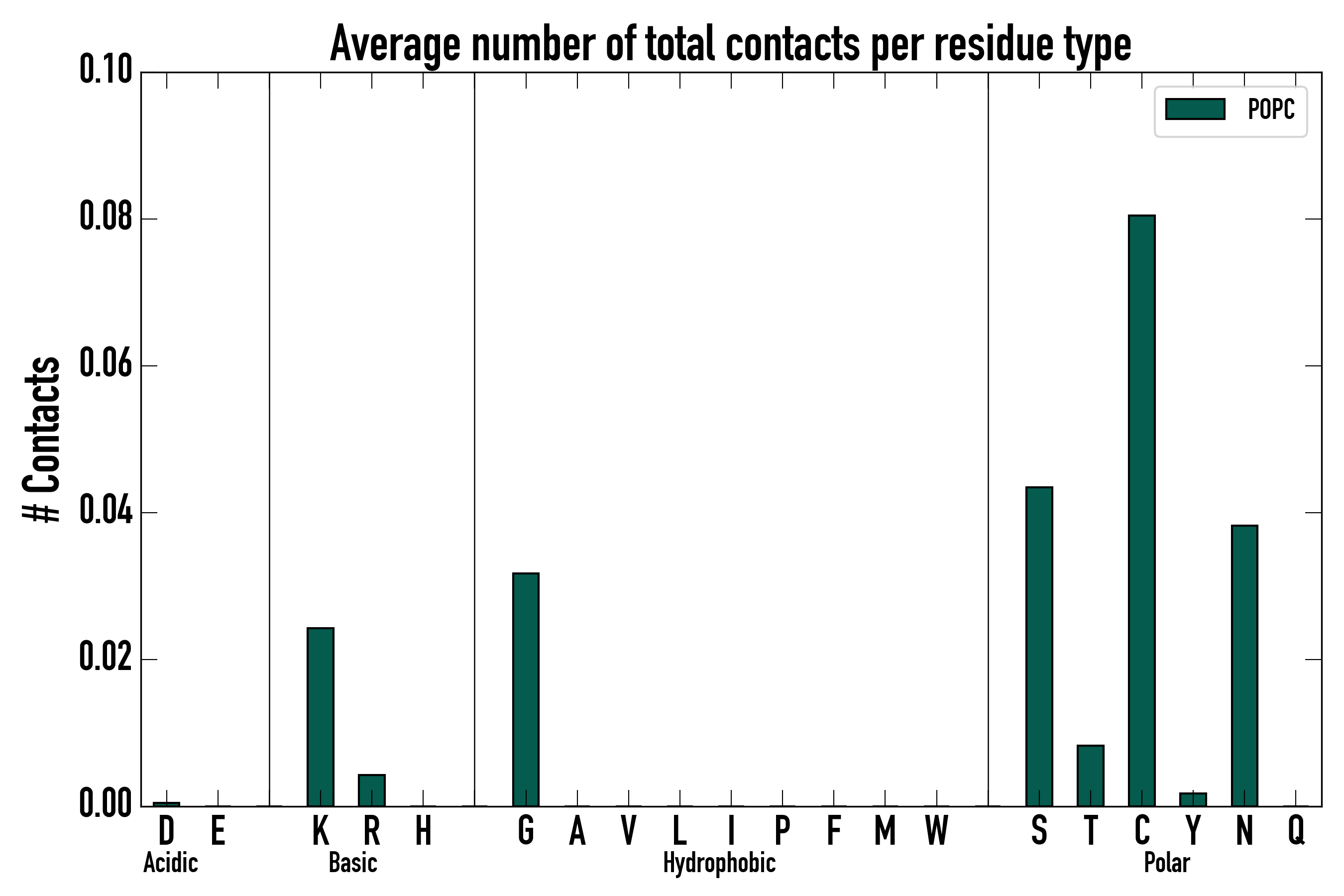 Number of contacts between each residue of the peptide backbone and the different lipid types, averaged over the last microsecond and using a cut-off of 0.6 nm.