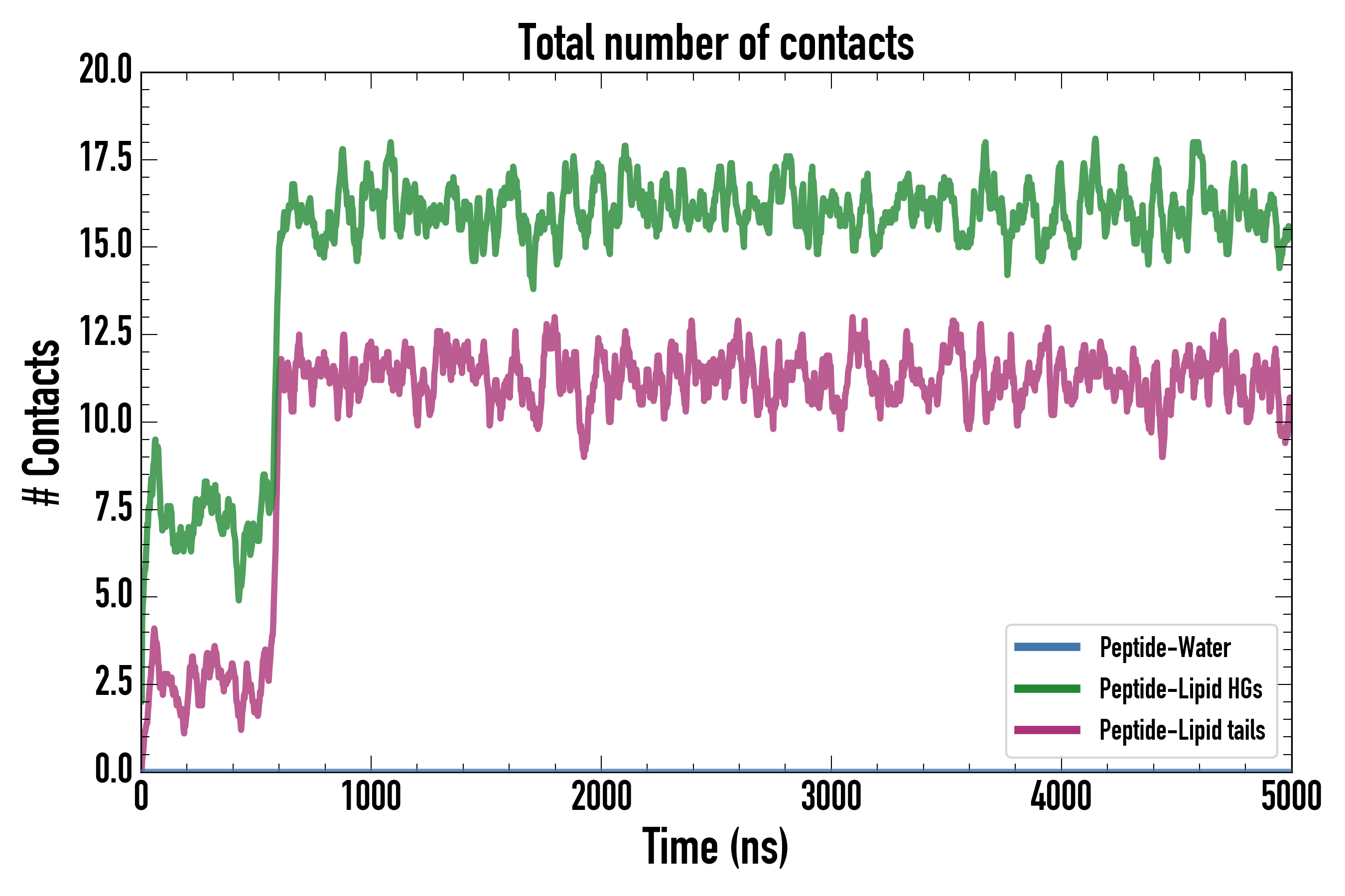 Number of contacts between each residue of the peptide backbone and the different lipid types, averaged over the last microsecond and using a cut-off of 0.6 nm.