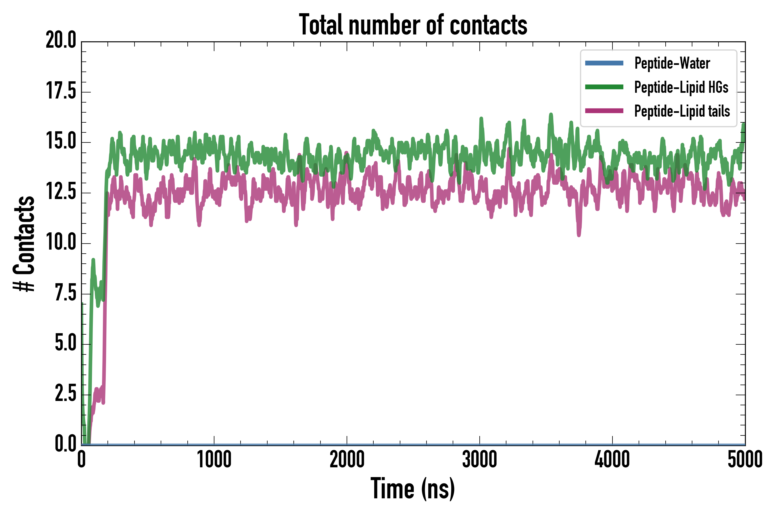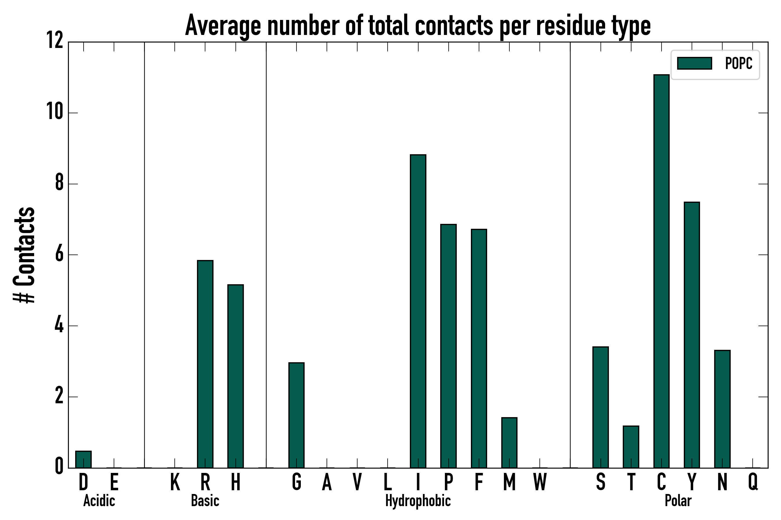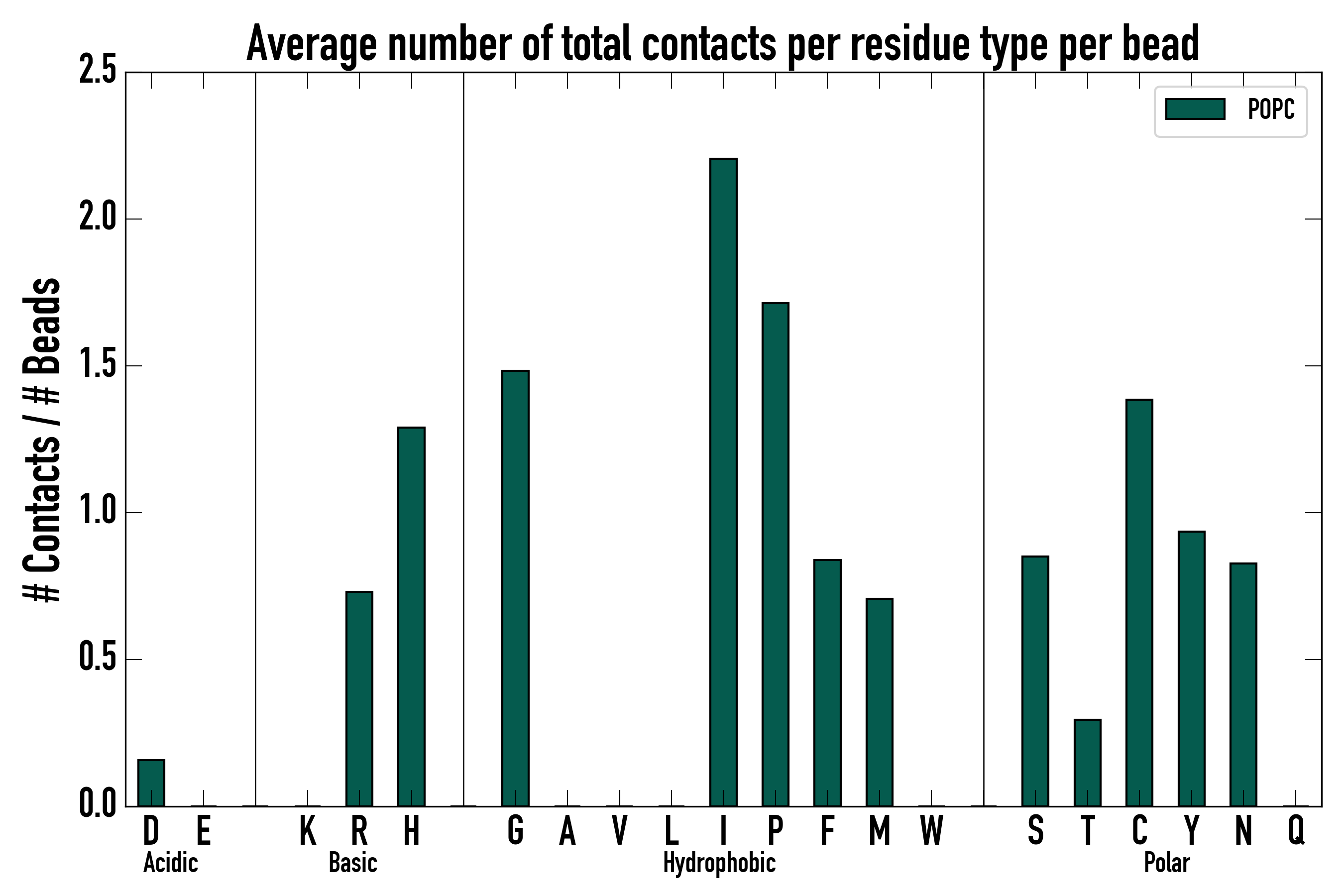 Number of contacts between each residue of the peptide backbone and the different lipid types, averaged over the last microsecond and using a cut-off of 0.6 nm.