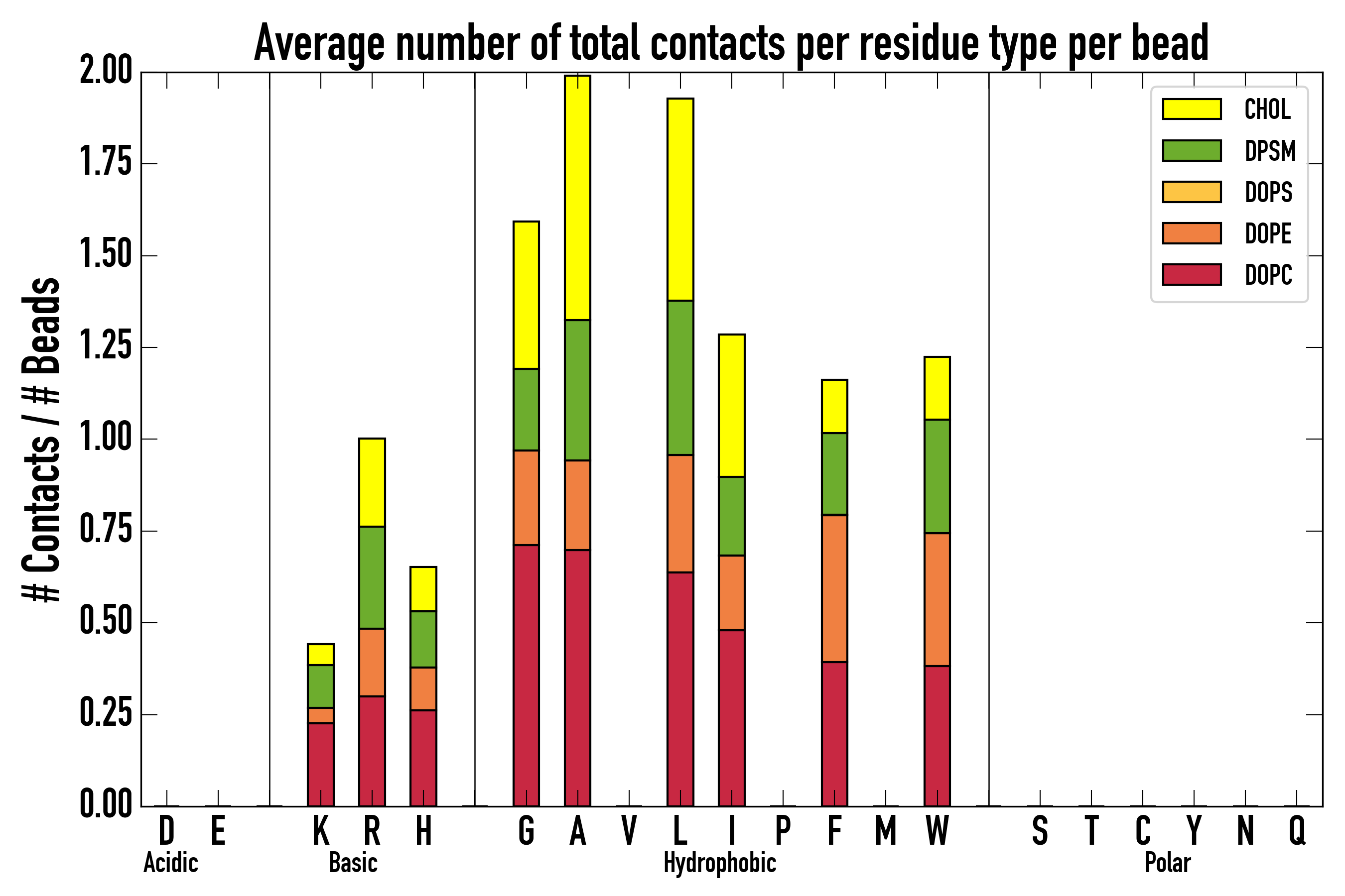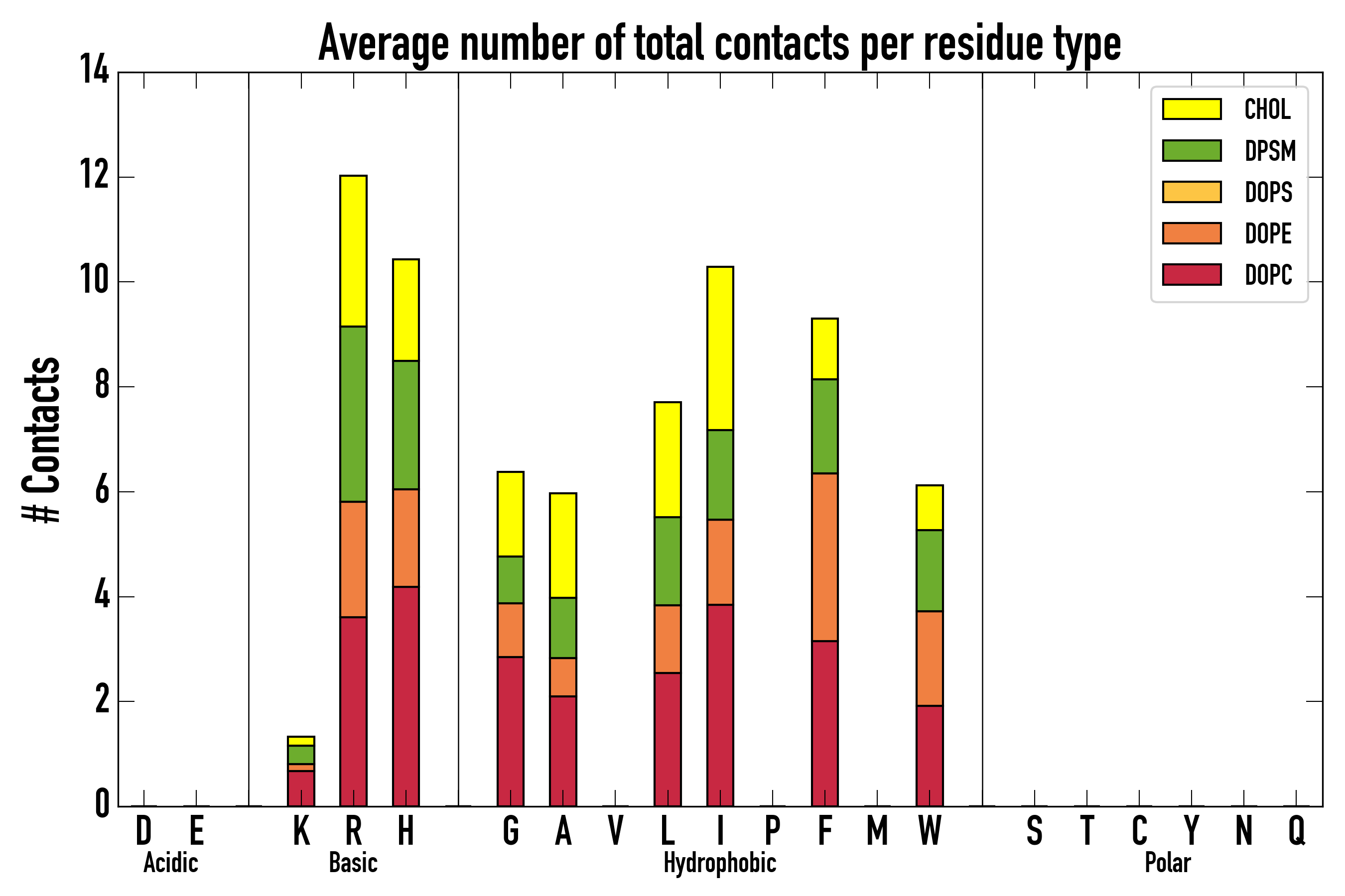 Number of contacts between each residue of the peptide backbone and the different lipid types, averaged over the last microsecond and using a cut-off of 0.6 nm.
