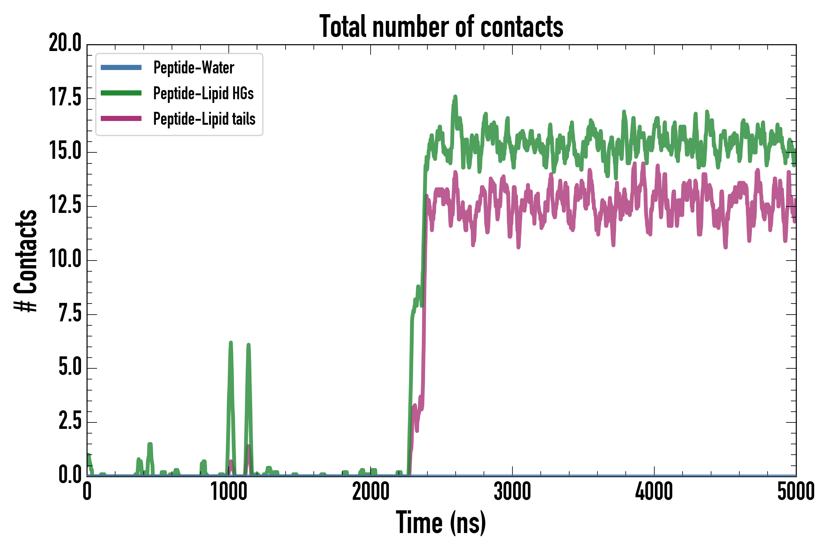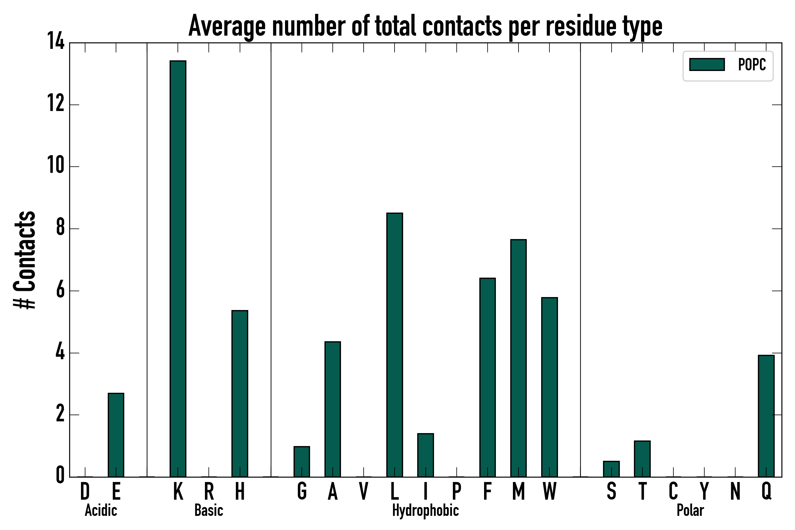 Number of contacts between each residue of the peptide backbone and the different lipid types, averaged over the last microsecond and using a cut-off of 0.6 nm.