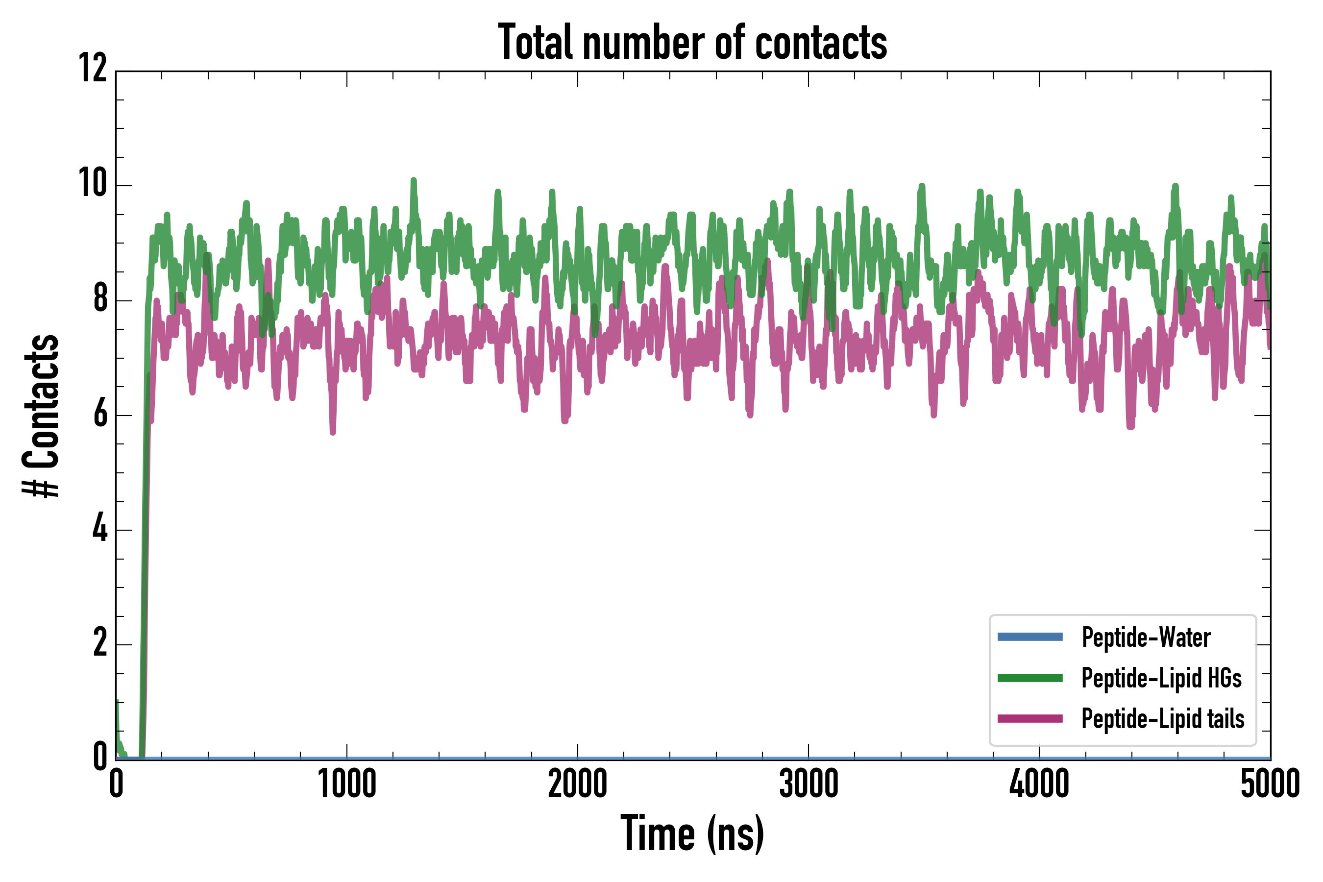 Number of contacts between each residue of the peptide backbone and the different lipid types, averaged over the last microsecond and using a cut-off of 0.6 nm.
