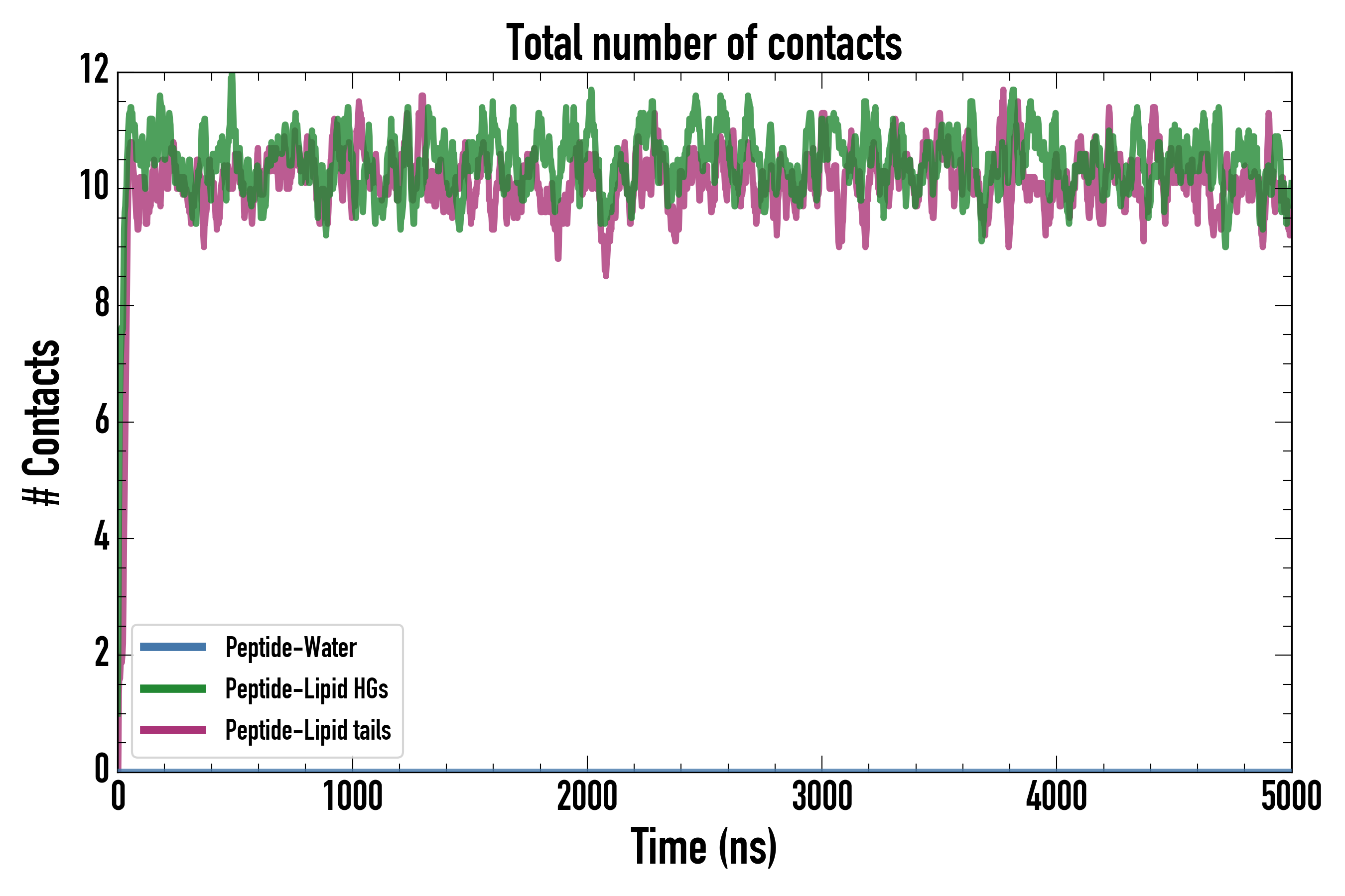 Number of contacts between each residue of the peptide backbone and the different lipid types, averaged over the last microsecond and using a cut-off of 0.6 nm.