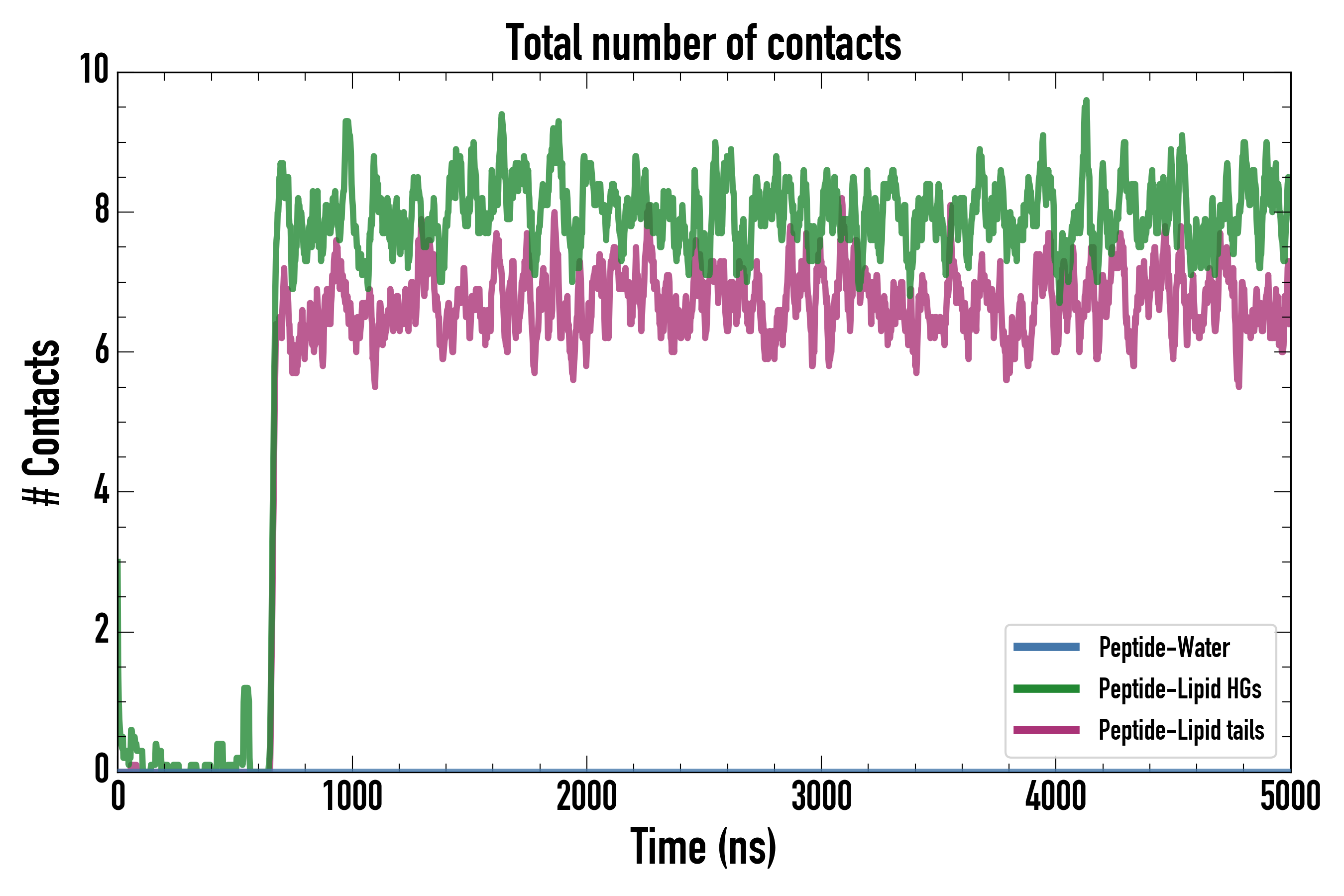 Number of contacts between each residue of the peptide backbone and the different lipid types, averaged over the last microsecond and using a cut-off of 0.6 nm.