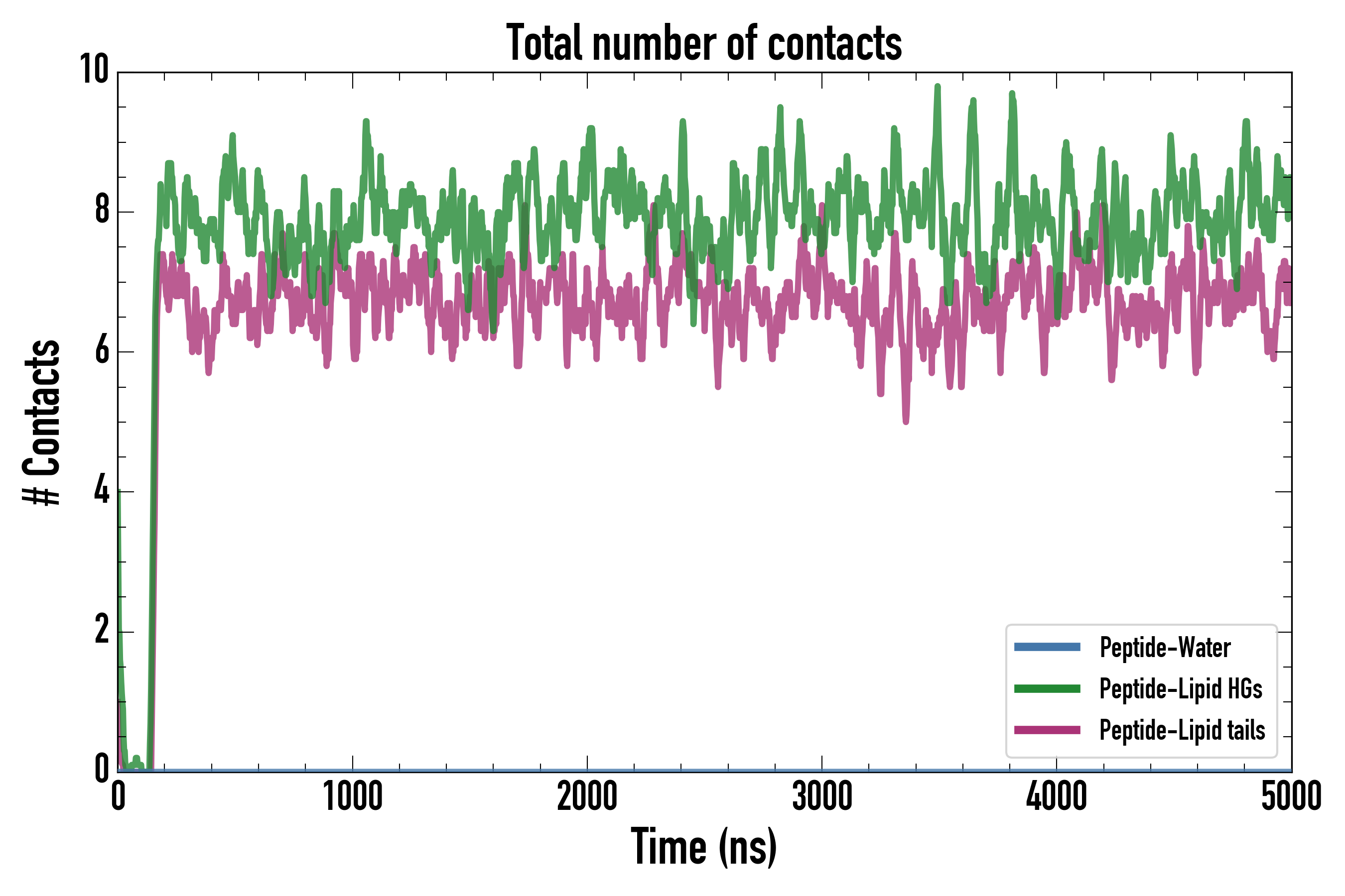 Number of contacts between each residue of the peptide backbone and the different lipid types, averaged over the last microsecond and using a cut-off of 0.6 nm.
