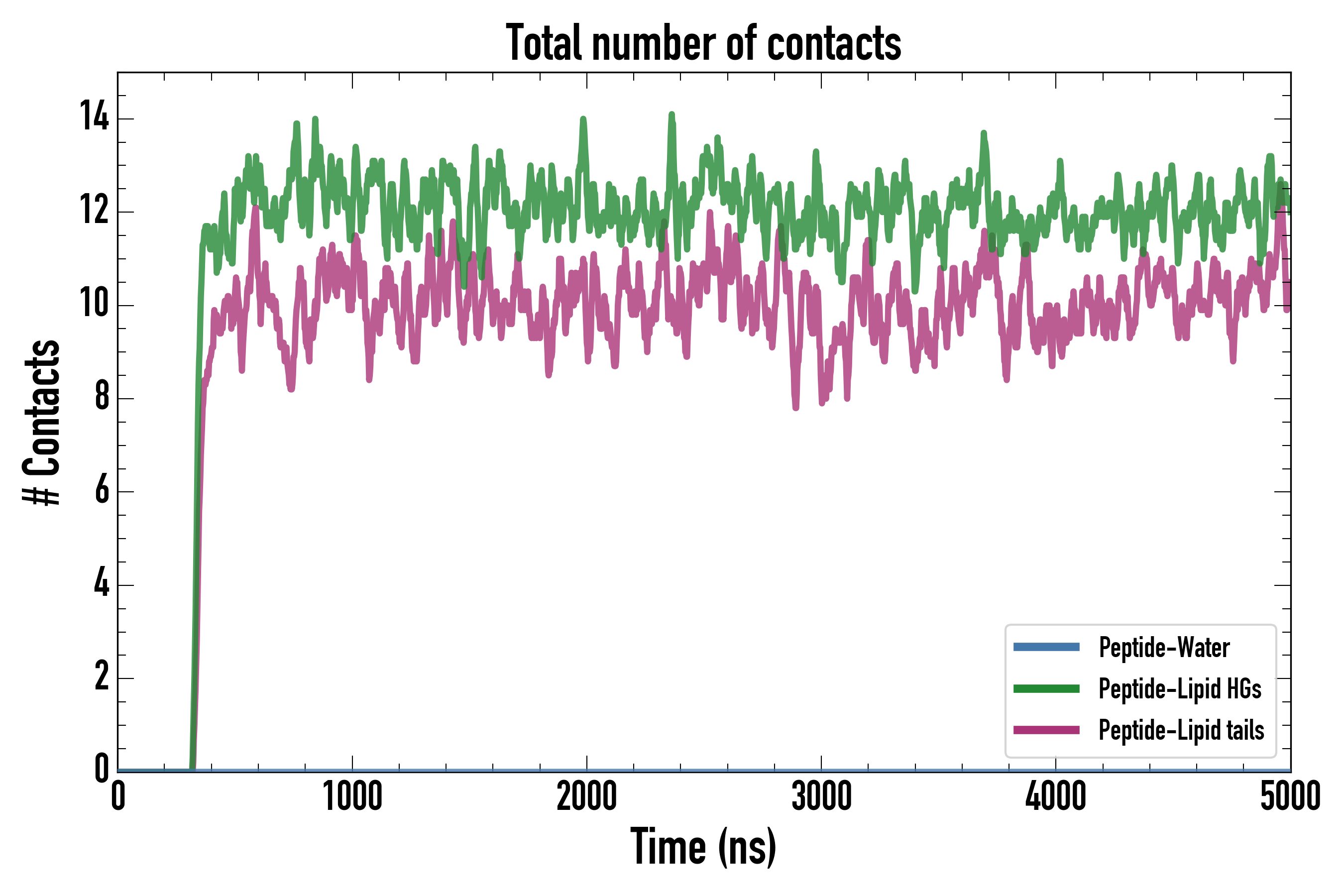 Number of contacts between each residue of the peptide backbone and the different lipid types, averaged over the last microsecond and using a cut-off of 0.6 nm.