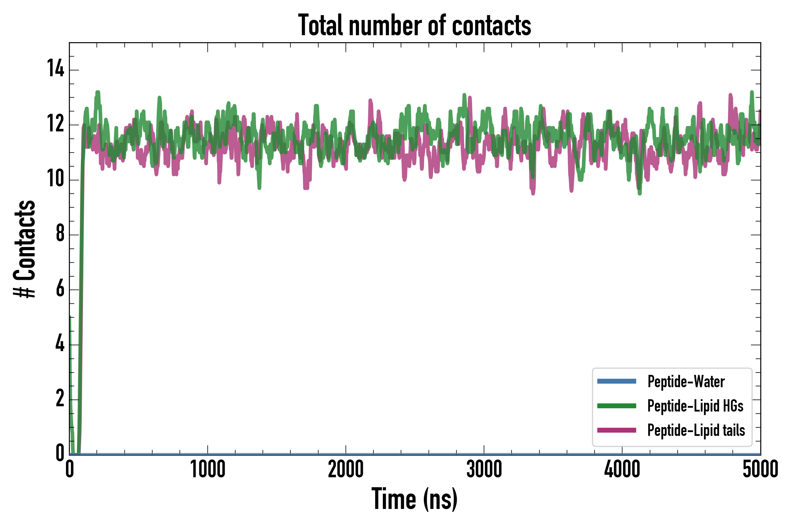 Number of contacts between each residue of the peptide backbone and the different lipid types, averaged over the last microsecond and using a cut-off of 0.6 nm.