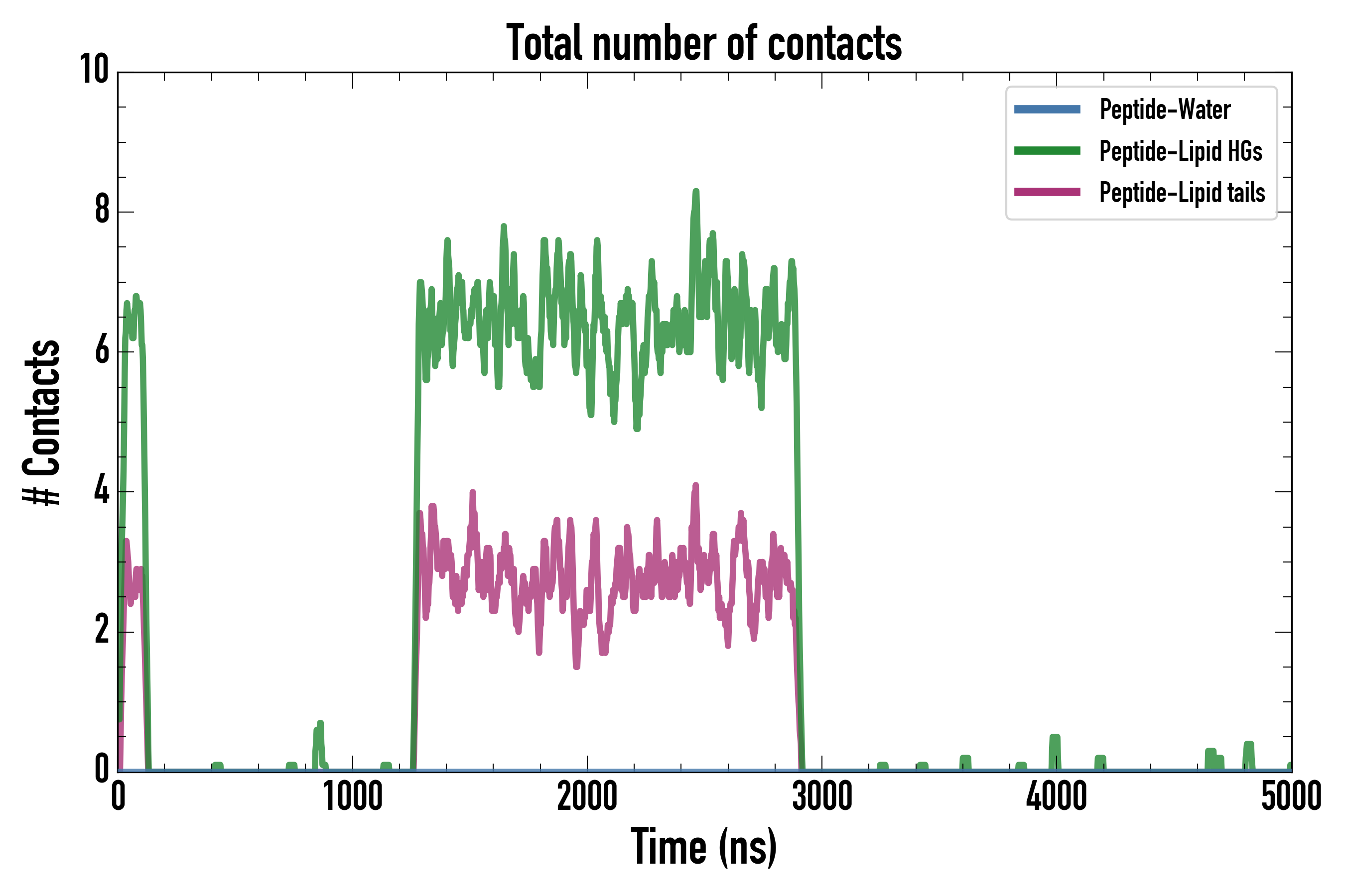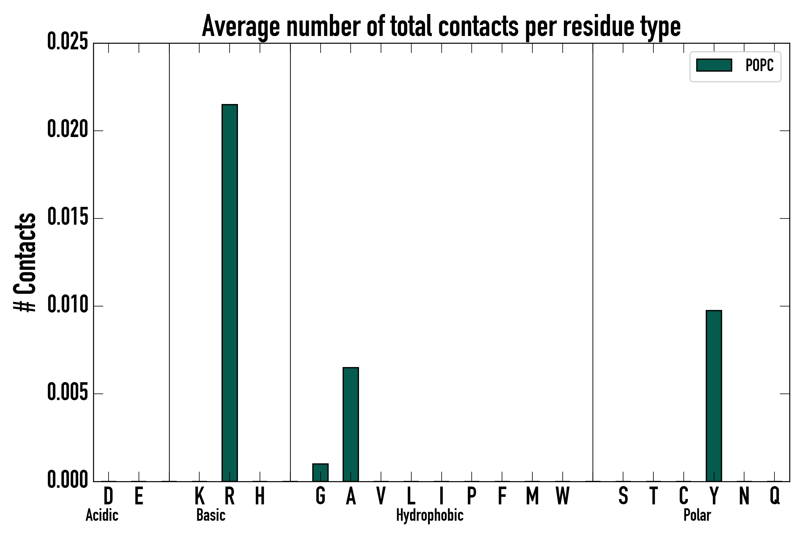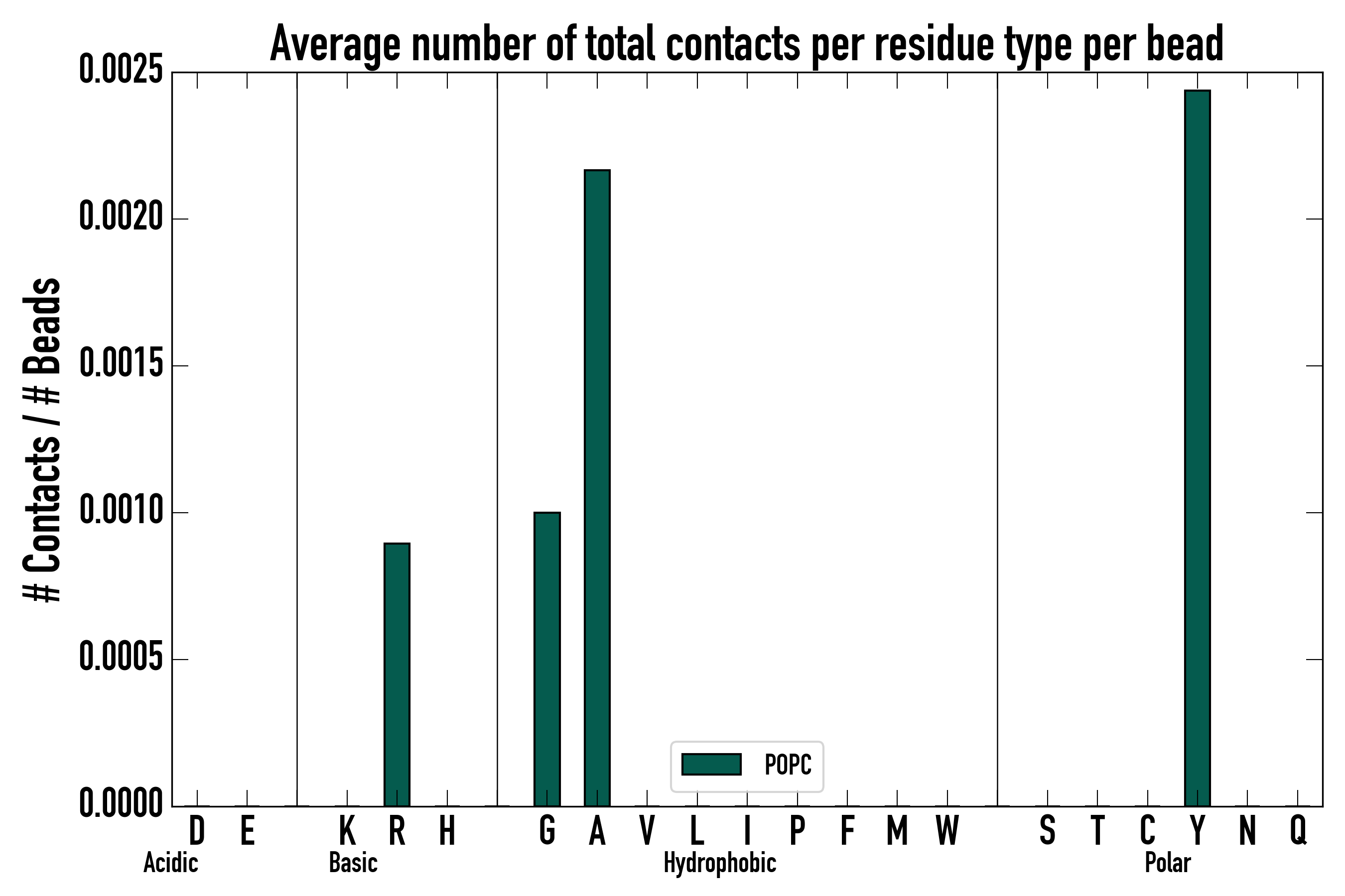 Number of contacts between each residue of the peptide backbone and the different lipid types, averaged over the last microsecond and using a cut-off of 0.6 nm.