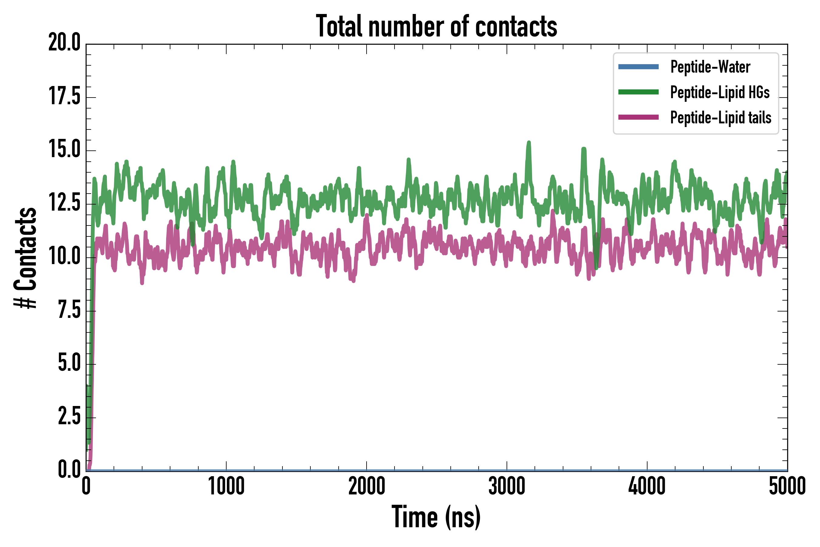 Number of contacts between each residue of the peptide backbone and the different lipid types, averaged over the last microsecond and using a cut-off of 0.6 nm.