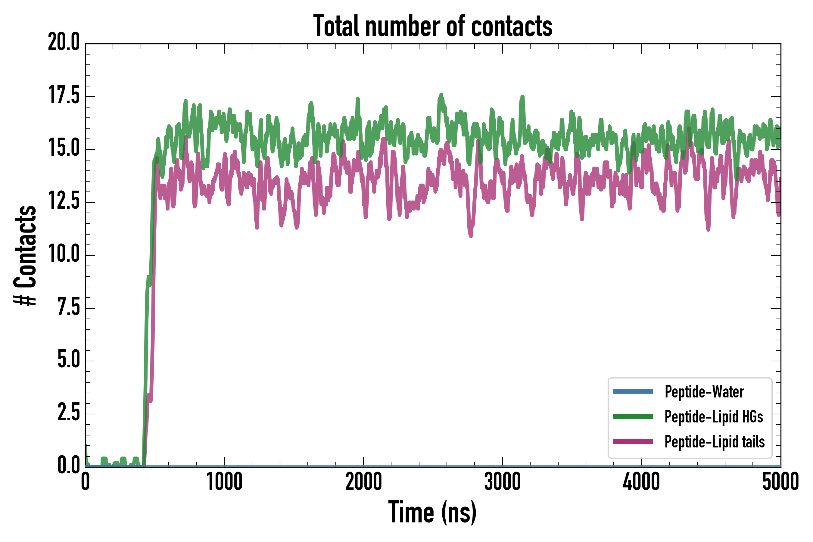 Number of contacts between each residue of the peptide backbone and the different lipid types, averaged over the last microsecond and using a cut-off of 0.6 nm.