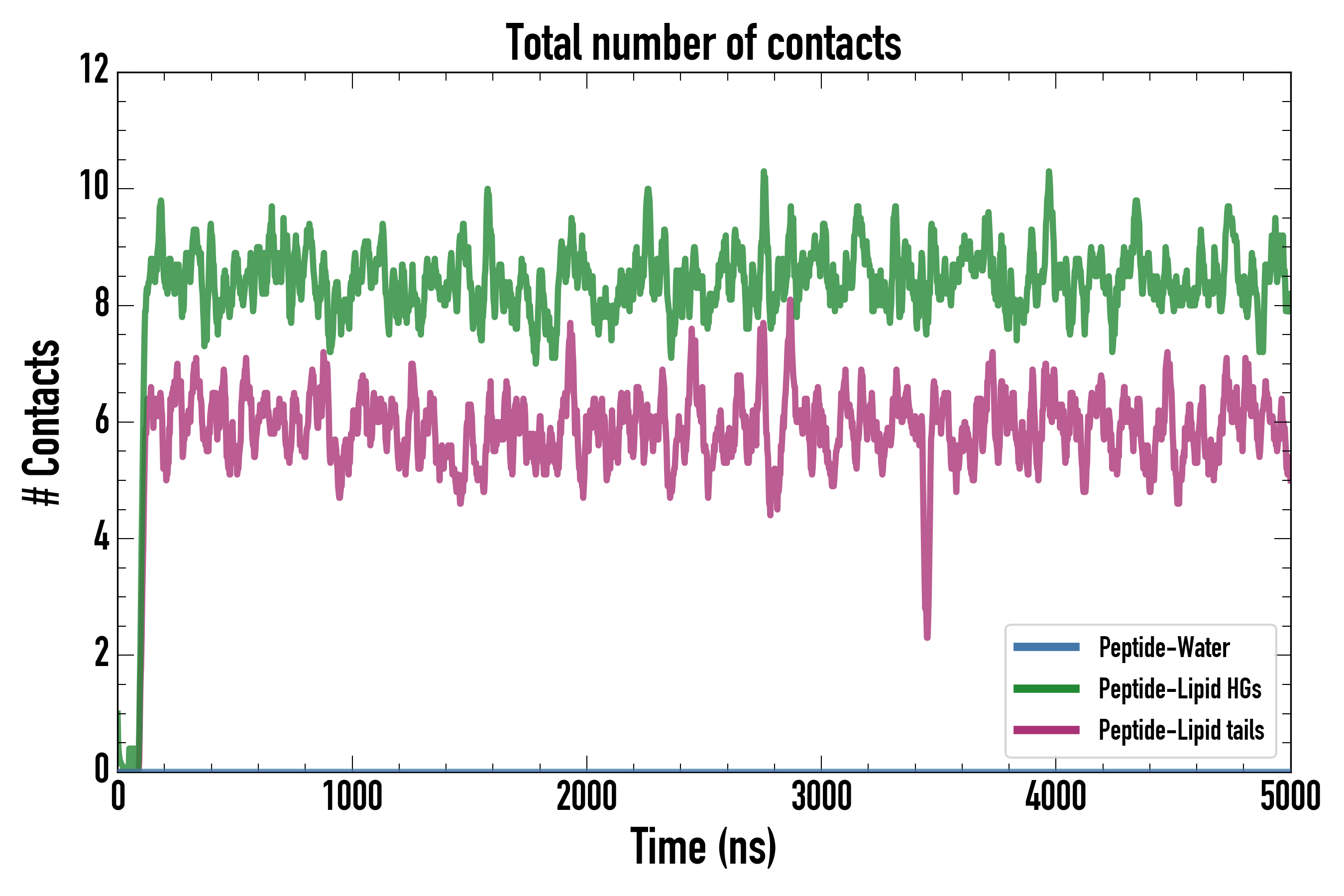 Number of contacts between each residue of the peptide backbone and the different lipid types, averaged over the last microsecond and using a cut-off of 0.6 nm.