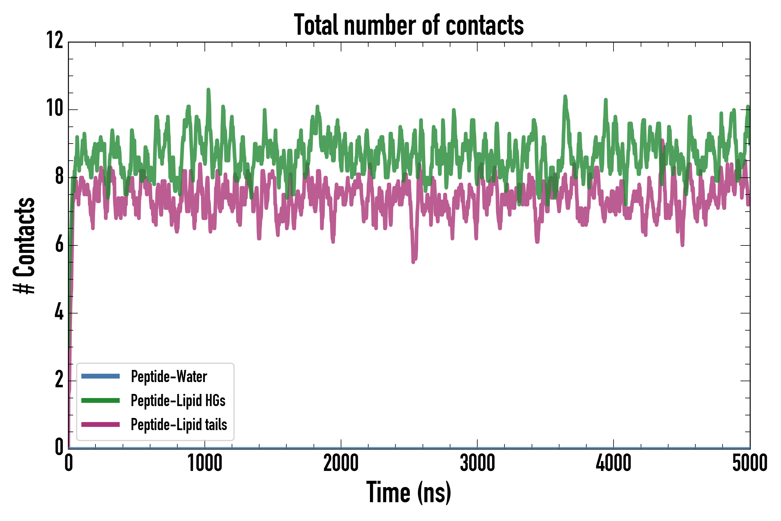 Number of contacts between each residue of the peptide backbone and the different lipid types, averaged over the last microsecond and using a cut-off of 0.6 nm.