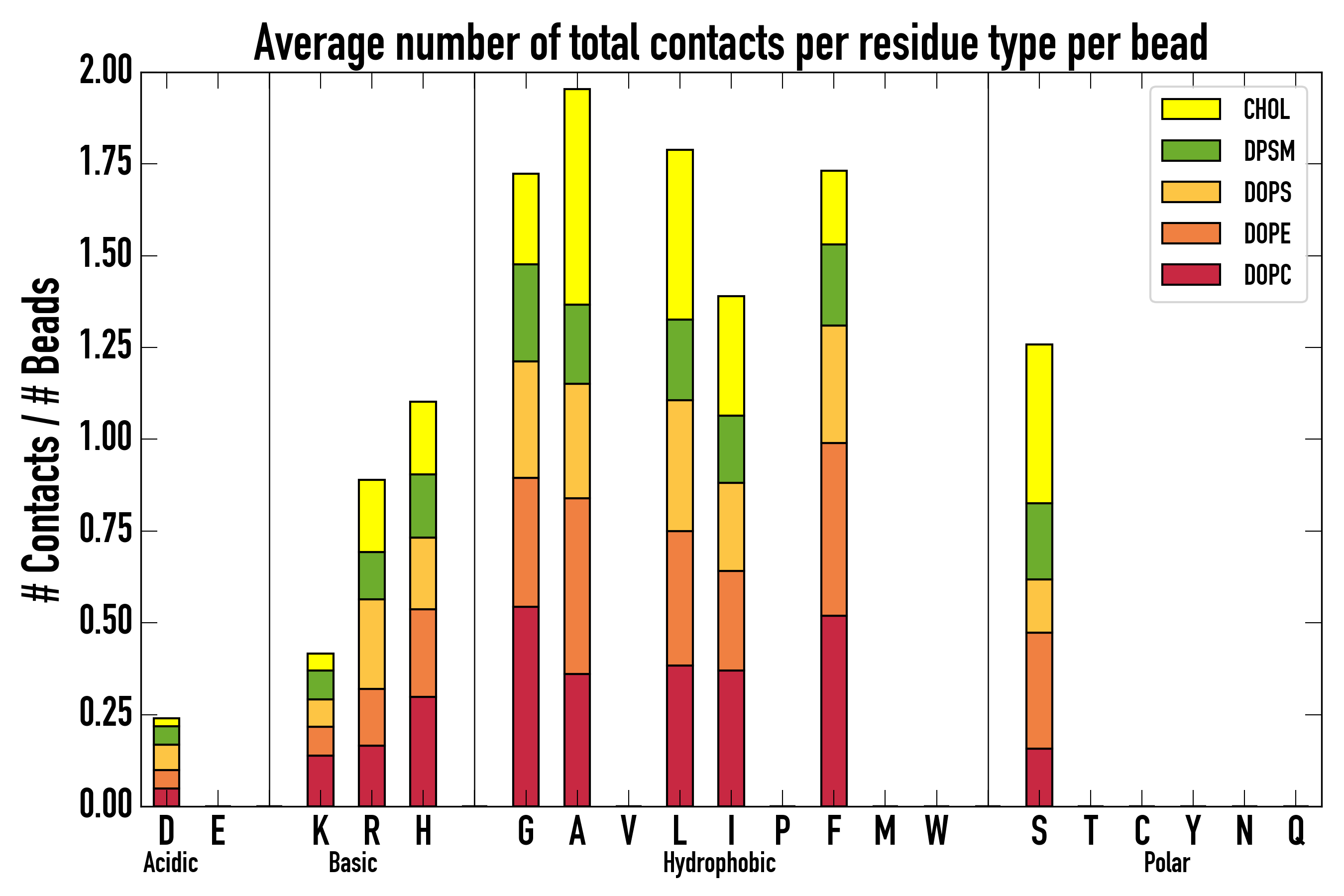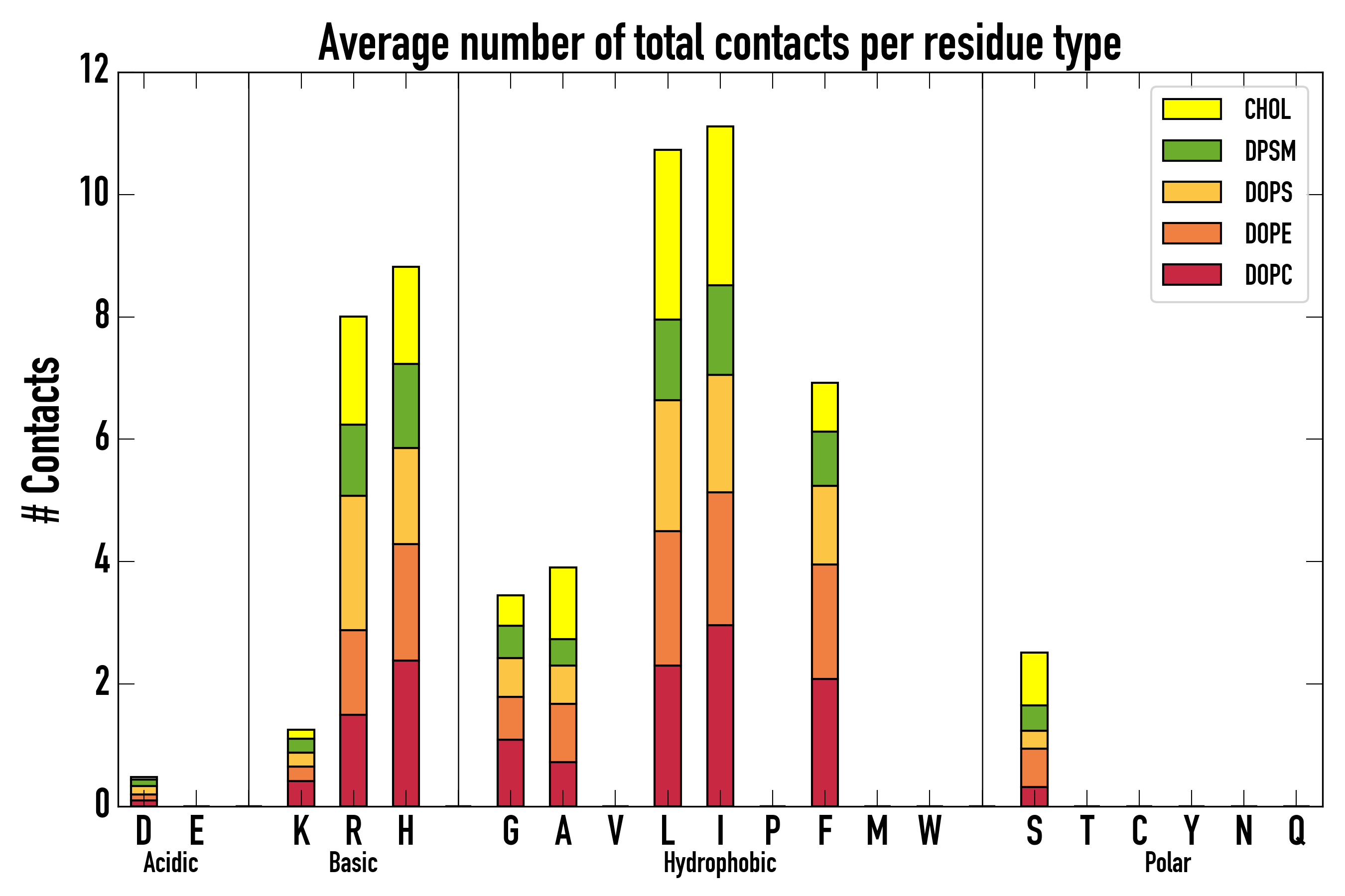 Number of contacts between each residue of the peptide backbone and the different lipid types, averaged over the last microsecond and using a cut-off of 0.6 nm.
