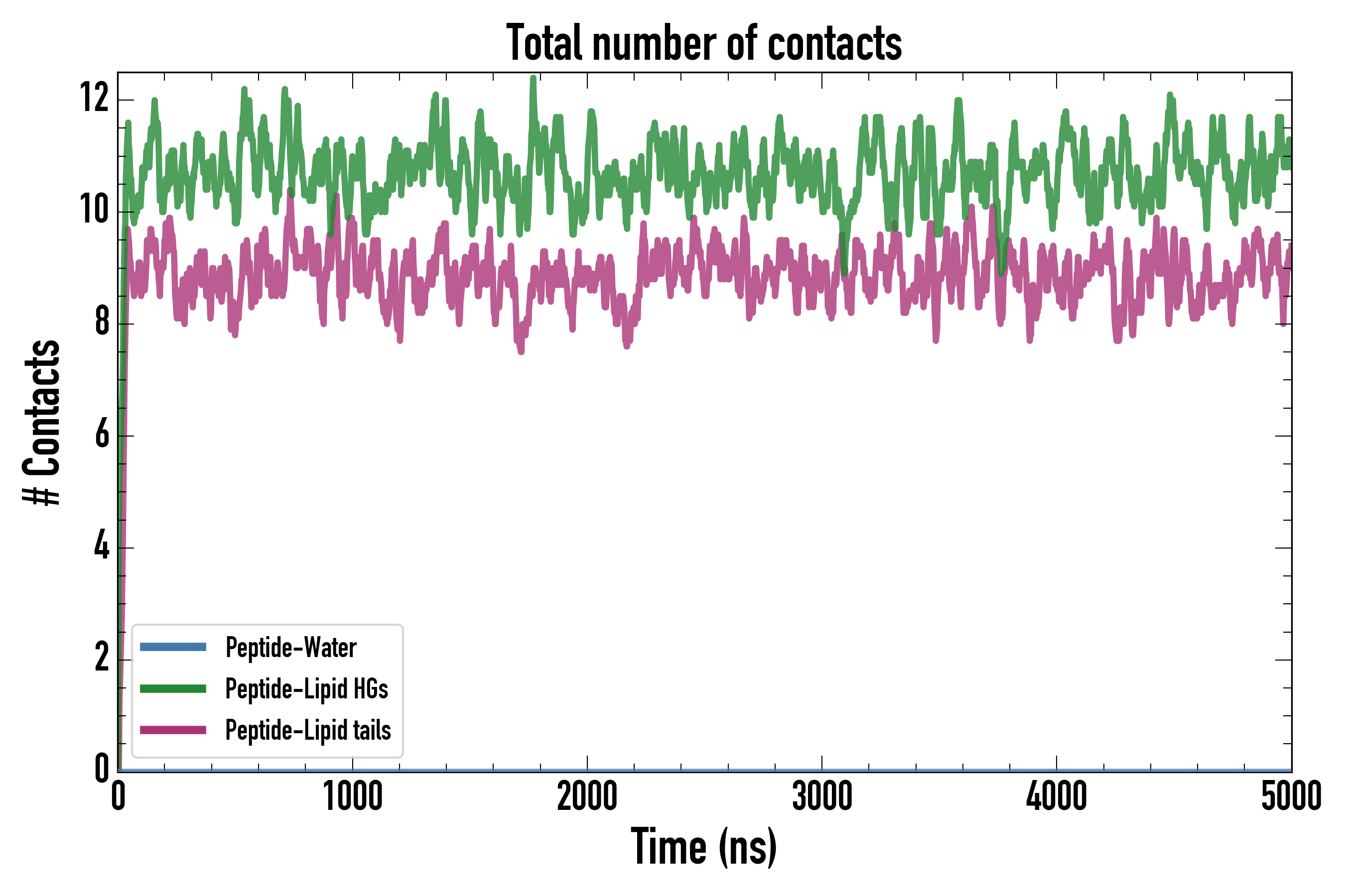 Number of contacts between each residue of the peptide backbone and the different lipid types, averaged over the last microsecond and using a cut-off of 0.6 nm.