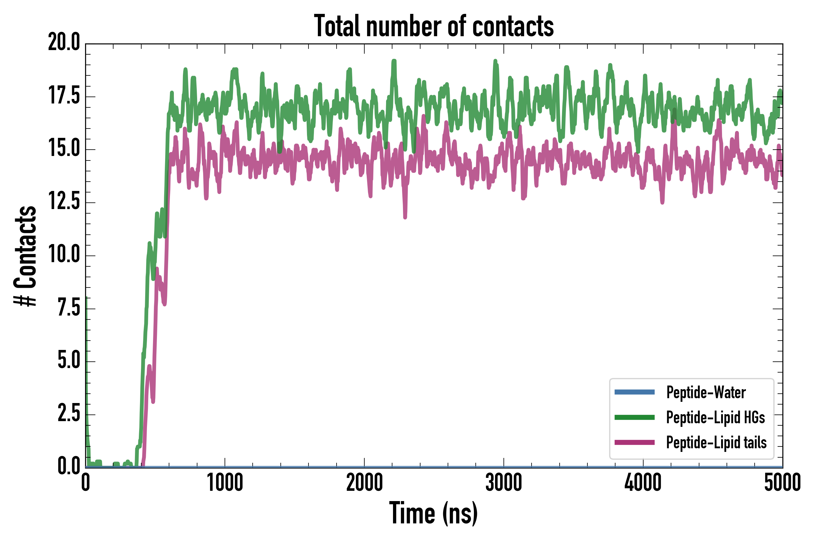Number of contacts between each residue of the peptide backbone and the different lipid types, averaged over the last microsecond and using a cut-off of 0.6 nm.