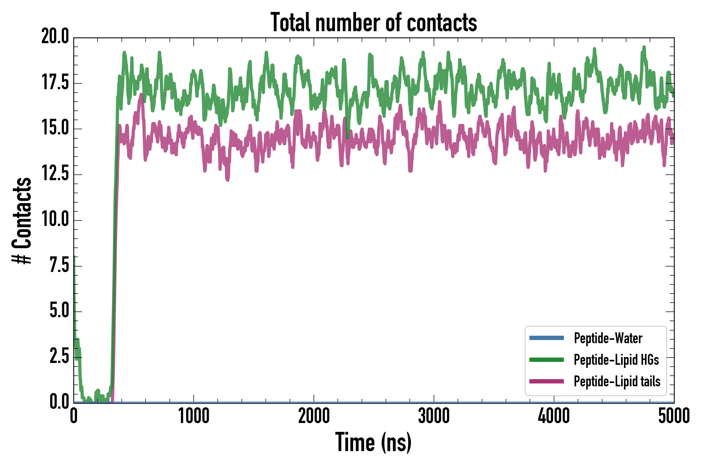 Number of contacts between each residue of the peptide backbone and the different lipid types, averaged over the last microsecond and using a cut-off of 0.6 nm.