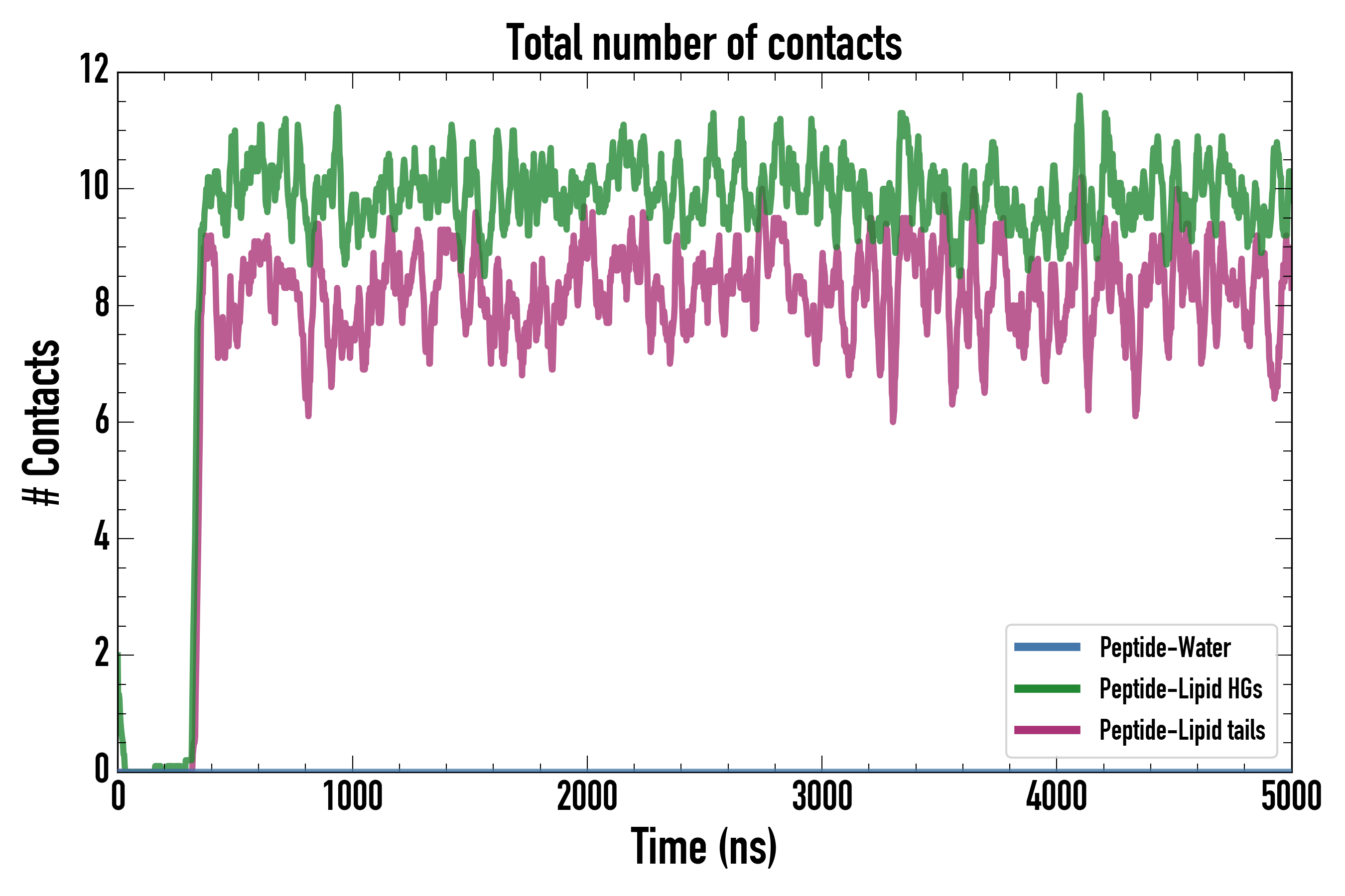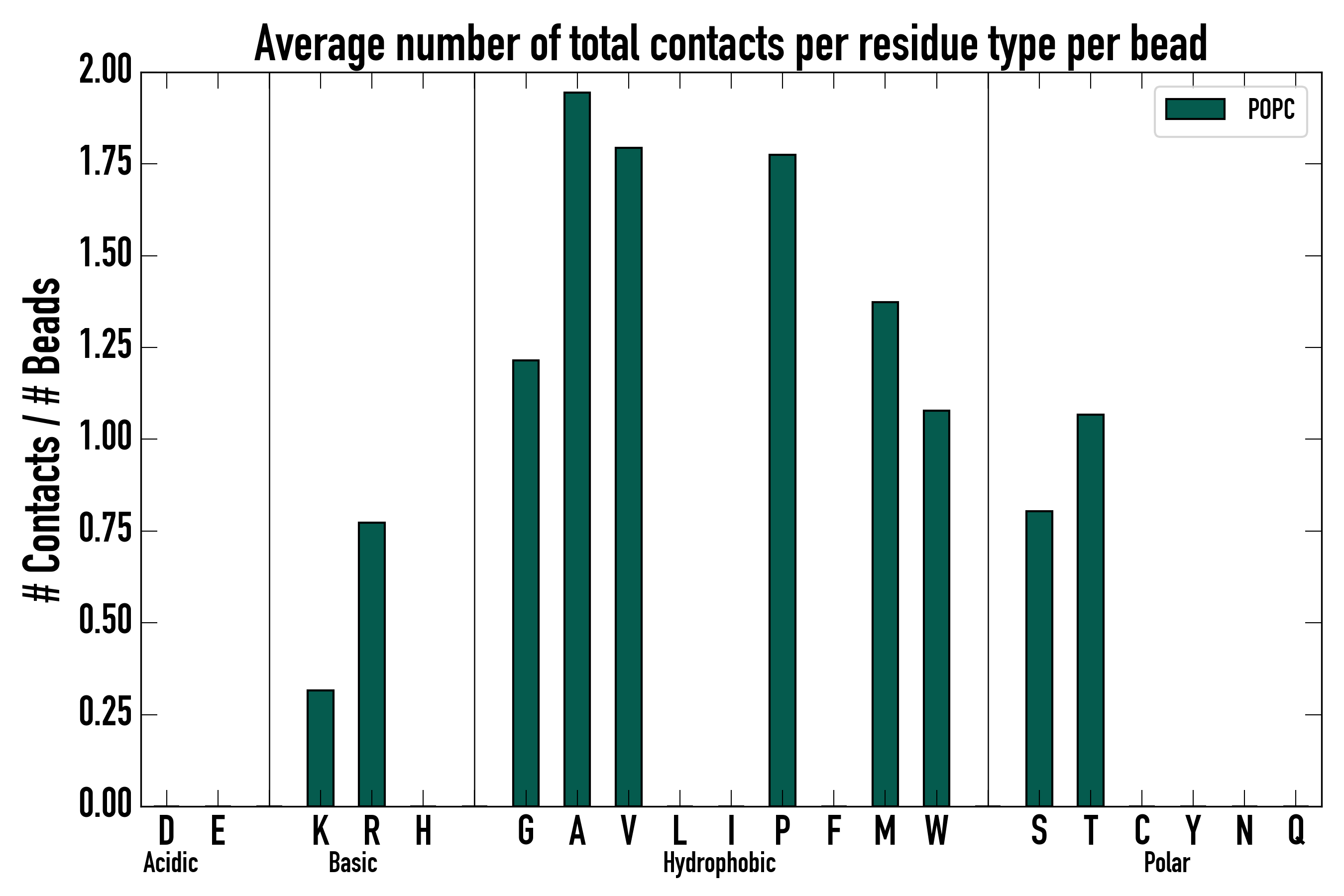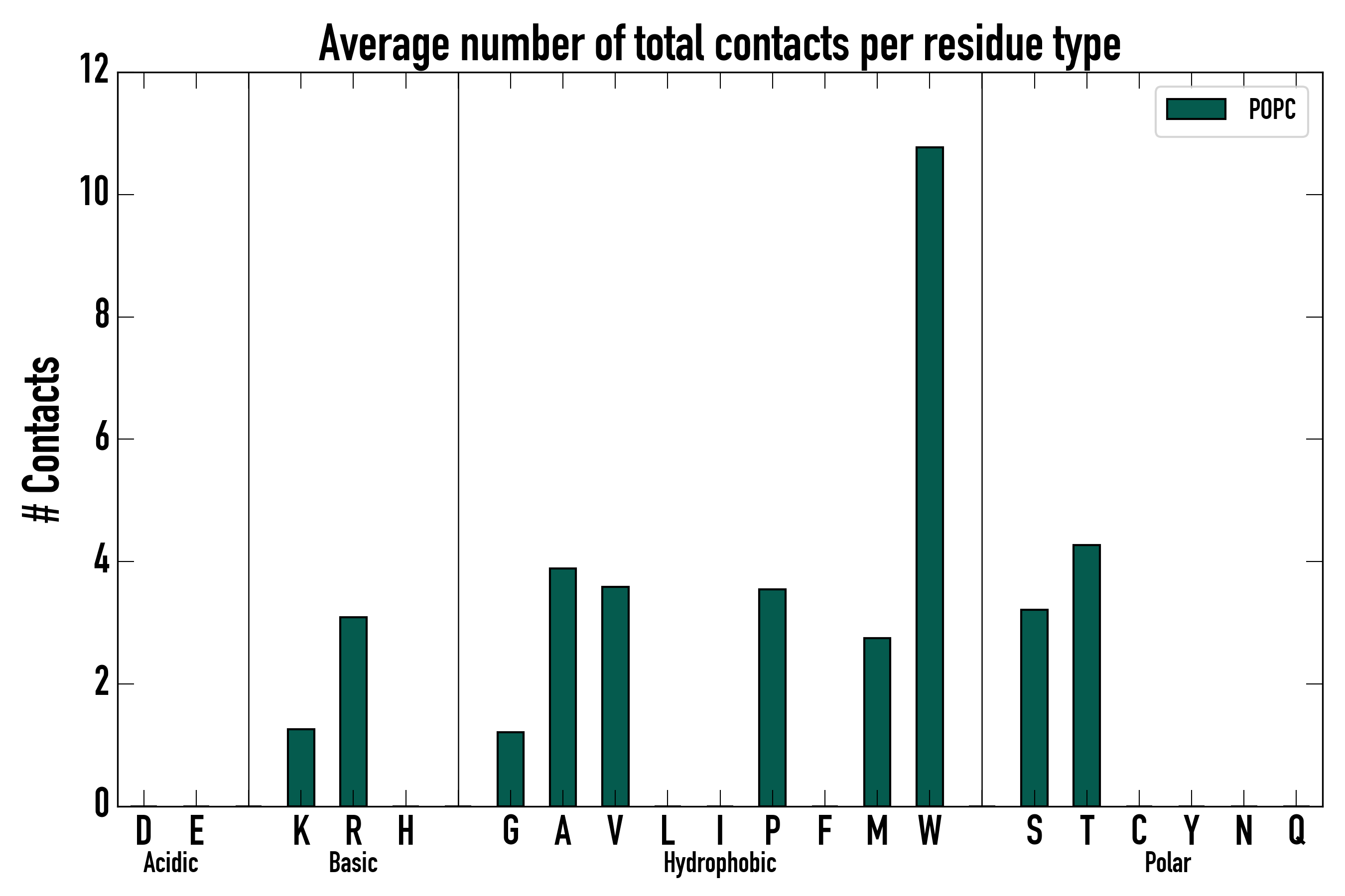Number of contacts between each residue of the peptide backbone and the different lipid types, averaged over the last microsecond and using a cut-off of 0.6 nm.